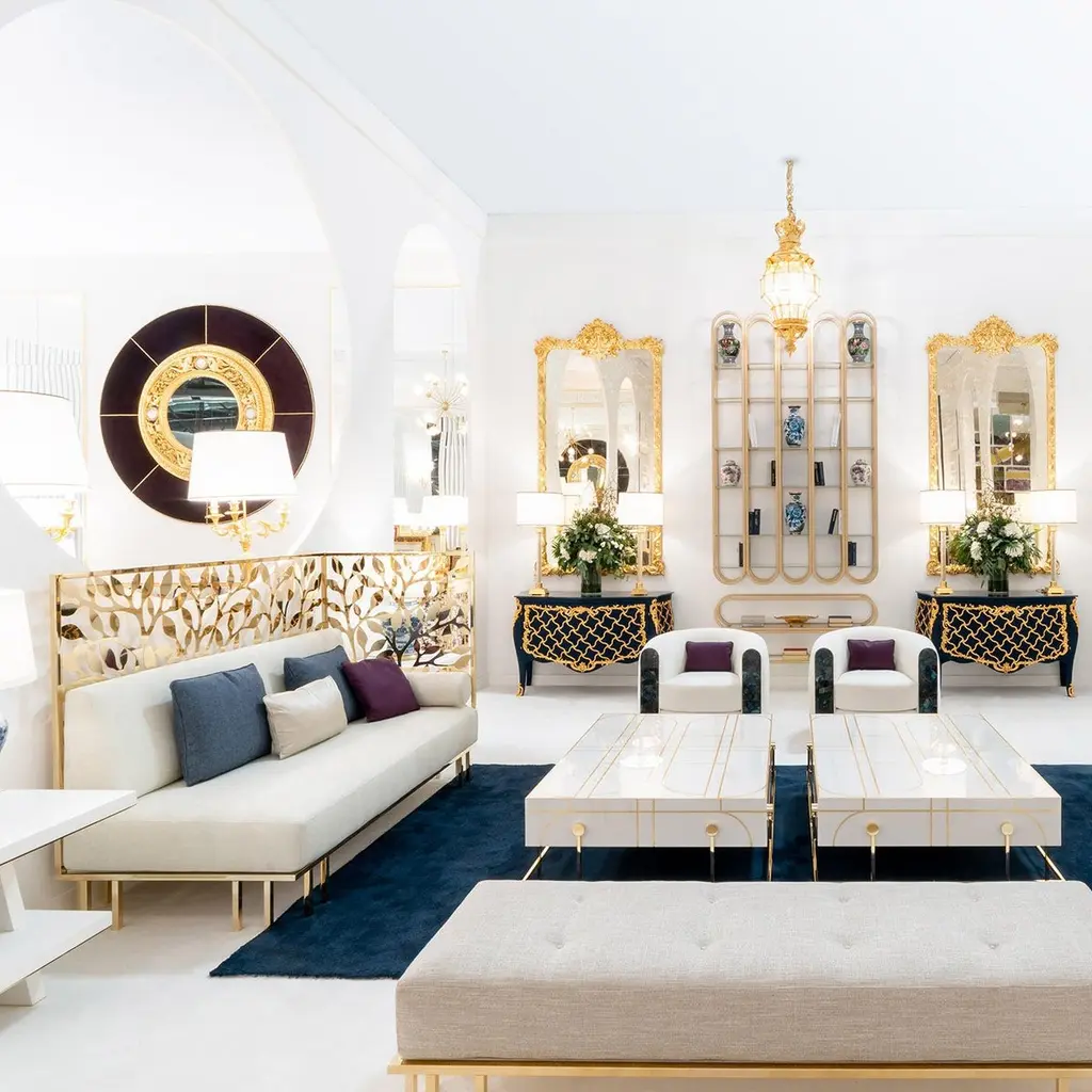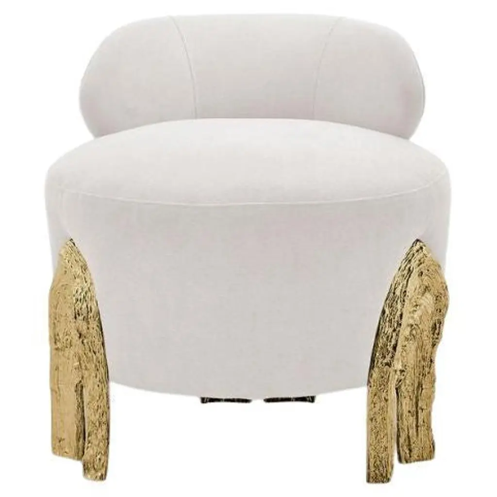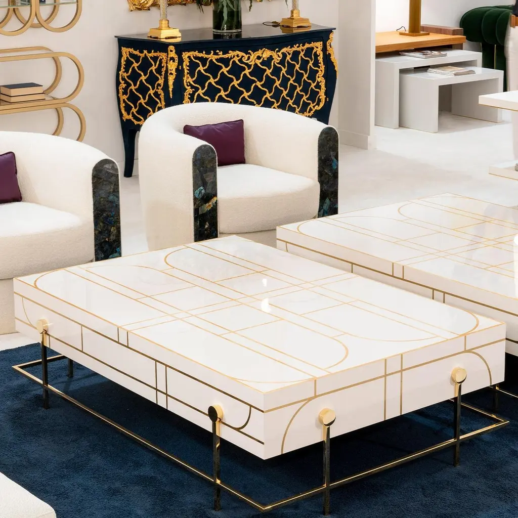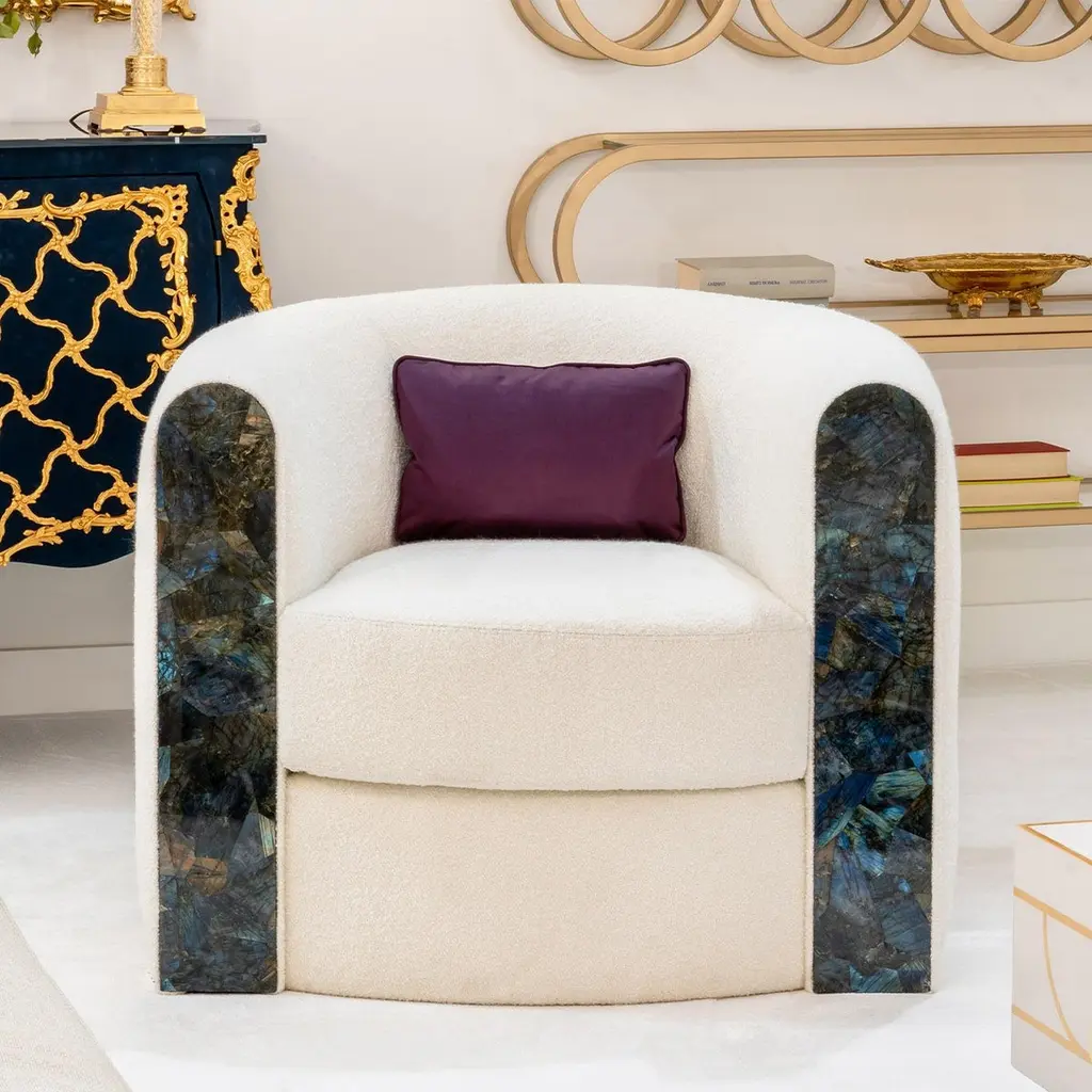 Exceptional comfort and refinement flawlessly combine in this spectacular armchair, making it an exclusive accent piece for a lavish living area. Distinguished by magnificent Labradorite inserts, it is handmade of wood upholstered with white fabric and resting on a gold-plated steel base. The decorative cushion is included with the purchase.