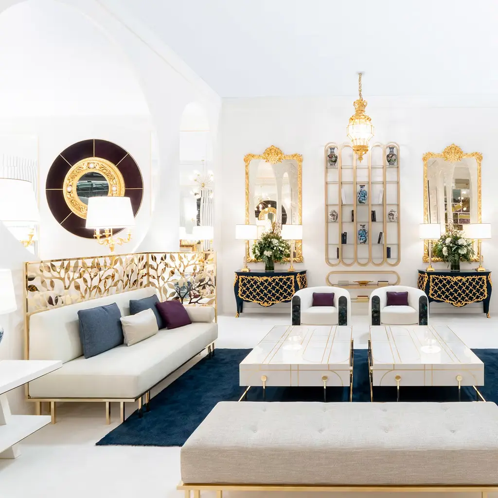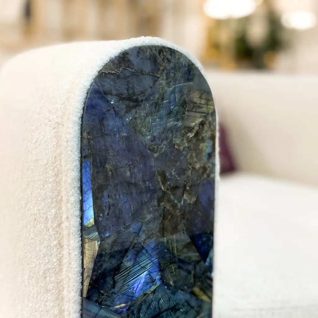 Exceptional comfort and refinement flawlessly combine in this spectacular armchair, making it an exclusive accent piece for a lavish living area. Distinguished by magnificent Labradorite inserts, it is handmade of wood upholstered with white fabric and resting on a 18kt gold-plated bronze base.