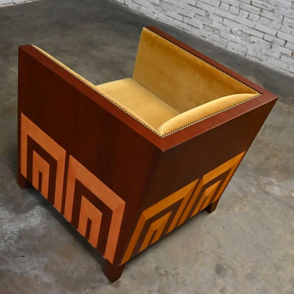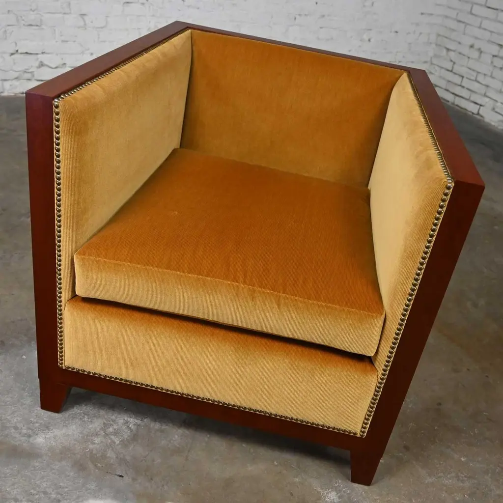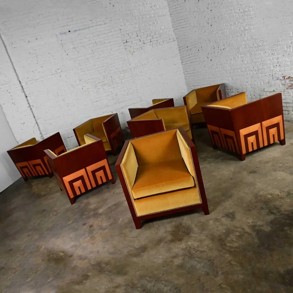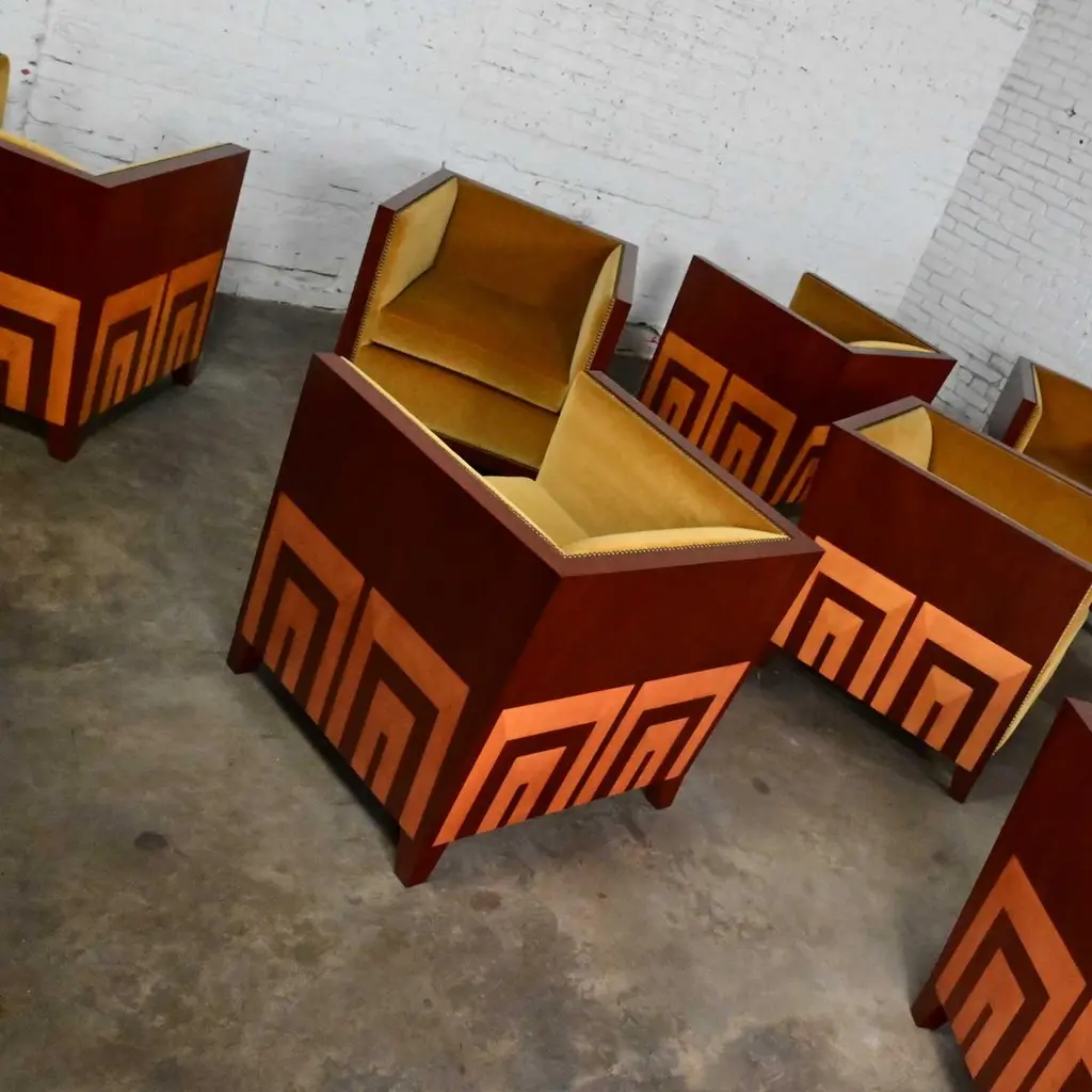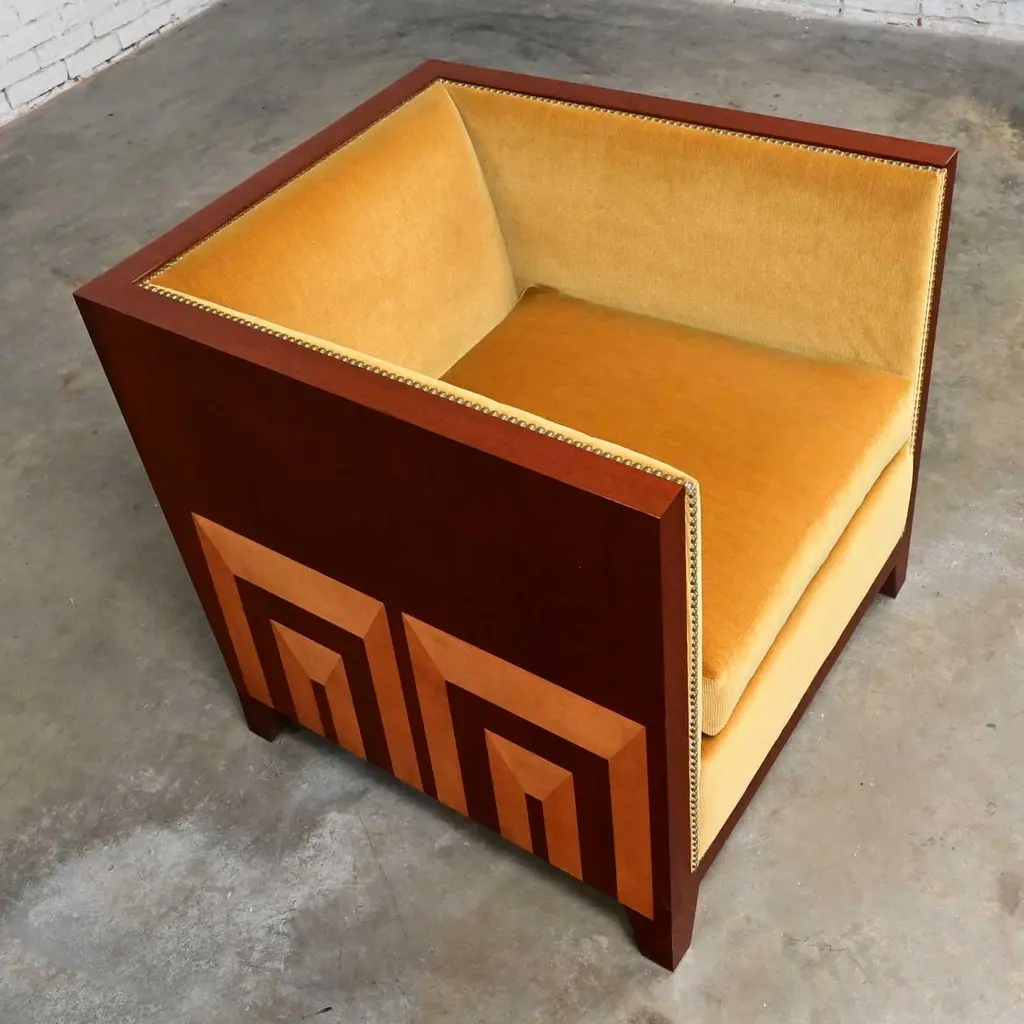 Fabulous vintage Art Deco Revival custom two-toned mahogany cube club chairs made by Rialto & designed by Zlata Pericic for Meca Design & Production, 8 available, selling separately. Comprised of mahogany frames and they are wearing their original gold faux mohair fabric with antique brass toned nail head trim. Beautiful condition, keeping in mind that these are vintage and not new so will have signs of use and wear. Each chair has its own wear or small flaw- see photos of chairs with numbers to select chair you want. The wood frames had some dings, chips, and missing veneer that we have repaired & touched up. It is very hard to detect, and the fabric is in phenomenal condition. May have some fading & 1 chair has 2 fade spots in fabric of the upper back. Please see photos and zoom in for details. We attempt to portray any imperfections. Circa, Late 20th Century.NOTE: These, along with several other matching pieces, were custom made for a large corporate office CEO and came from that private office, salon, and conference room. We have all those pieces listed here for sale, check them out! Contact us for group pricing on multiple pieces!Is 8 REALLY enough? Not as far as we are concerned… especially when it comes to something as INCREDIBLE as these custom designed cube club chairs!!! They are extremely well made and absolutely SOLID. They’re super heavy, made by Rialto, and custom designed by Zlata Pericic for Meca Design & Production. They are comprised of SUPER deep, dark mahogany frames with a unique shape as the back has a modest backward lean and the front is slightly wider than the back. As we stated, they are very deep so you may want to toss a throw pillow in it for extra comfort. Now, let’s talk about this phenomenal original gold fabric!! WOW!! It’s not quite velvet and it’s not quite mohair but it’s super soft with a very short pile so we are calling it faux mohair. It’s incredibly wrapped around the Dacron wrapped foam loose zippered seat cushion, seat back and inner arms, and the deck. And they are trimmed with lovely antique brass toned nail head trim. It looks SPECTACULAR!! The lower sides and back of the frames are adorned with gorgeous light mahogany geometric inlays and at a constructive perspective you should know that the tapered square feet are glued, screwed in, and have been applied separately. They are very geometric, extremely heavy, and absolutely head-turning! We are selling them separately so you can choose whether you want one, two, or more. (until they are gone!) They are Art Deco Revival with a little Postmodern vibe, and they are going to be WONDERFUL in your living room across from your sofa, in the corner of your bedroom, in the study facing the fireplace, or in the sitting room with a wonderful accent table in between! They are unique, exquisite, and we believe them be one of a kind, although we can’t be positive about that. Either way, they are marvelous and sure to be your favorite new vintage piece! We have a feeling they won’t last long… you better hurry and make one, two, or all 8 of them YOURS!!! Chair Size Each:• Height: 30.25 Inches• Width: 31 Inches• Depth: 32 Inches• Seat Height: 19 Inches• Inside Seat Width: 23 Inches• Inside Seat Depth: 25 Inches• Inside Back Height: 12 Inches• Clearance to floor: 3.75 Inches• Weight: 166.9 Pounds EachCrated Size: 1, 2, 4, 6, & 8• Crated Size 1: 36 x 37 x 38 x 270lbs• Crated Size 2: 60 x 37 x 38 x 495lbs• Crated Size 4: 60 x 37 x 67 x 978lbs• Crated Size 6: 66 x 70 x 70 x 1246lbs• Crated Size 8: 66 x 70 x 70 x 1516lbs