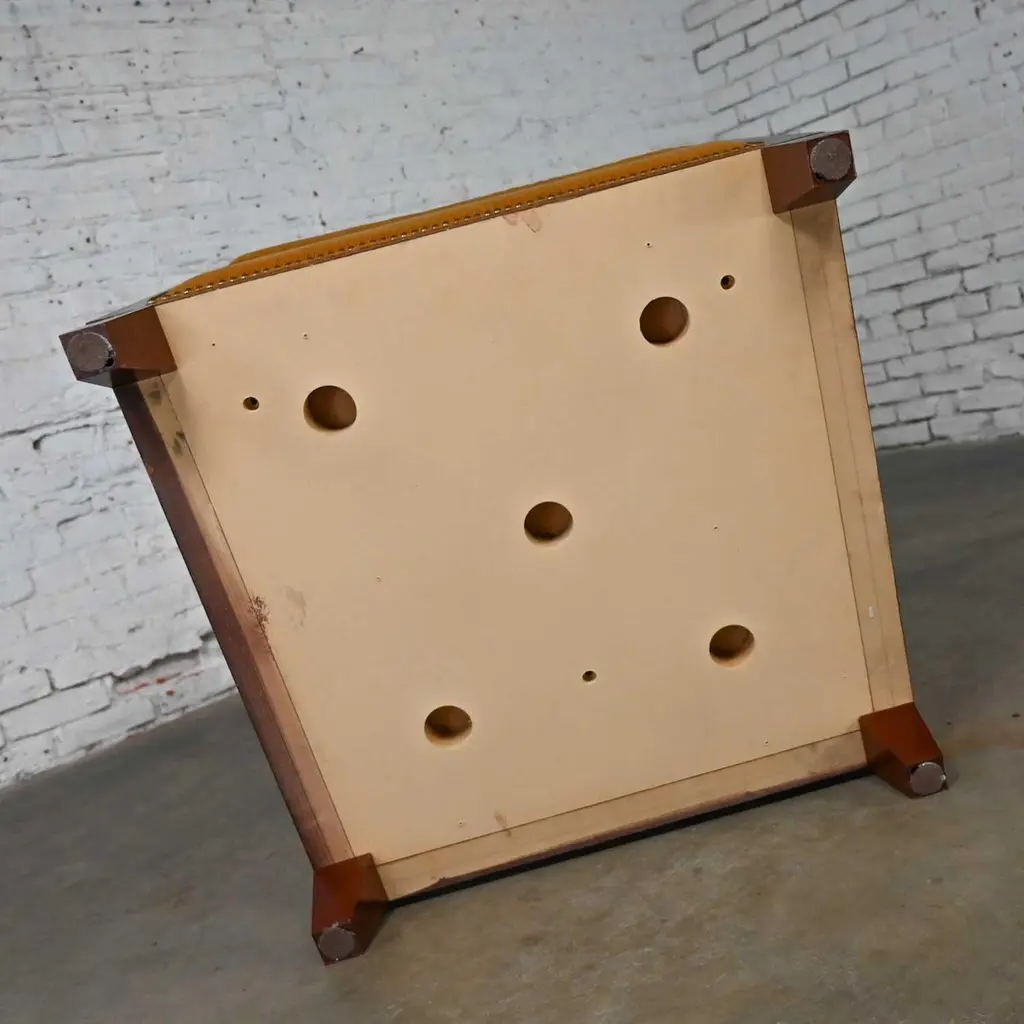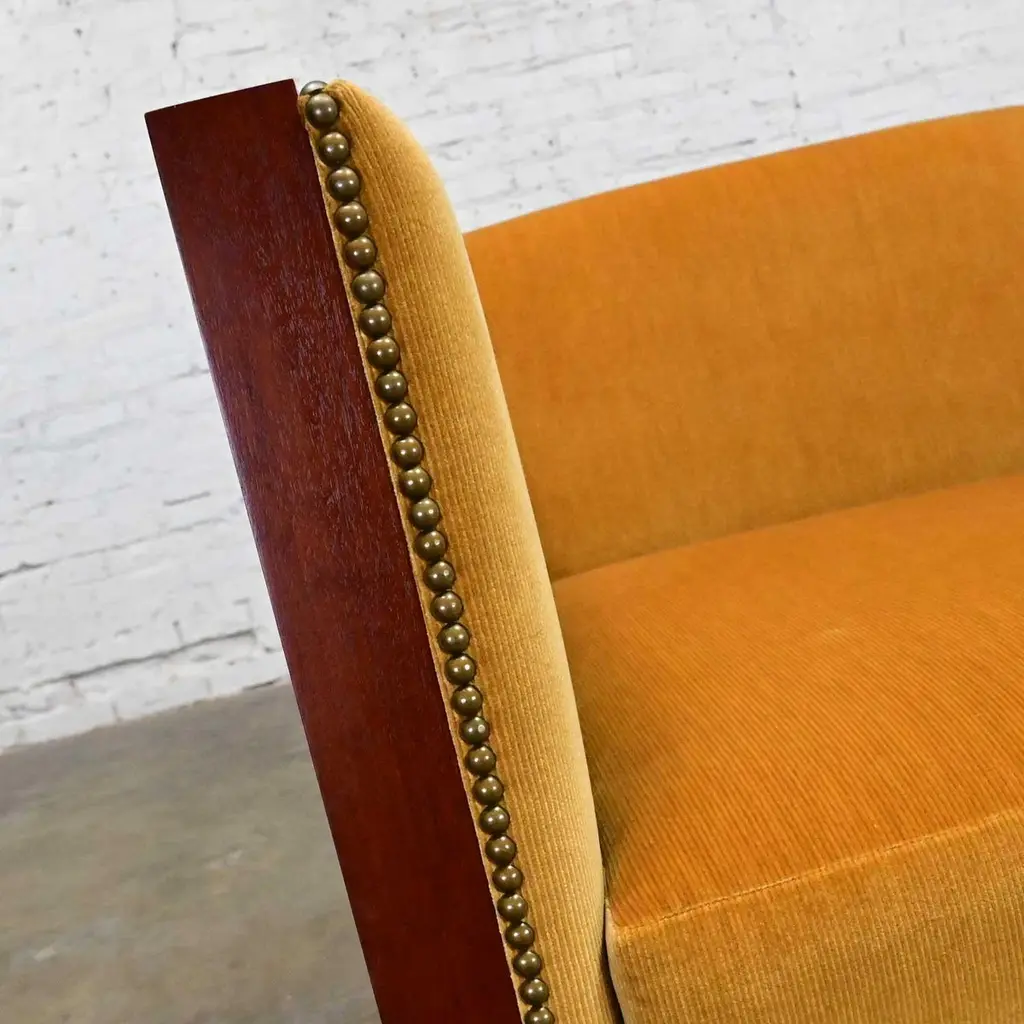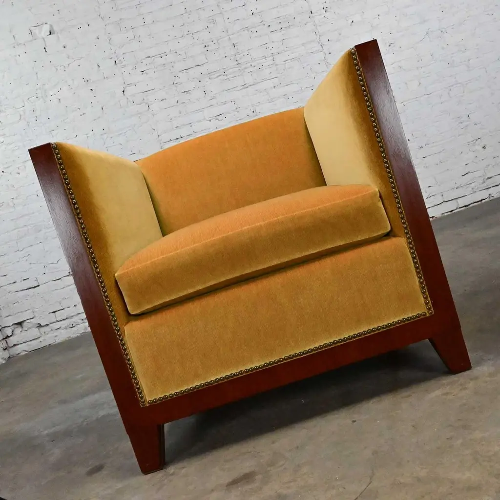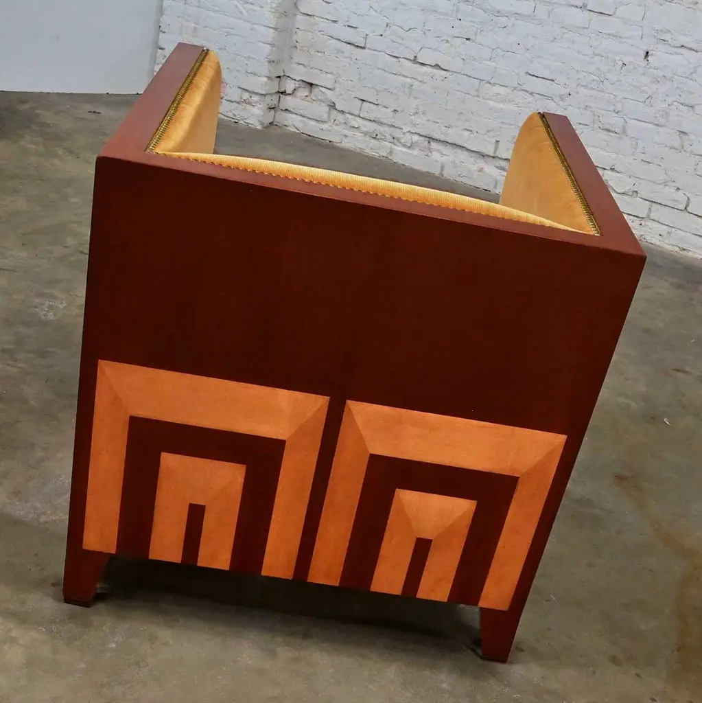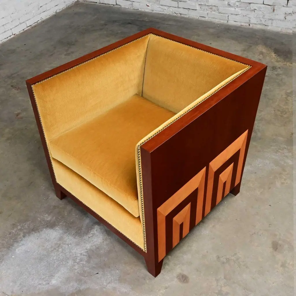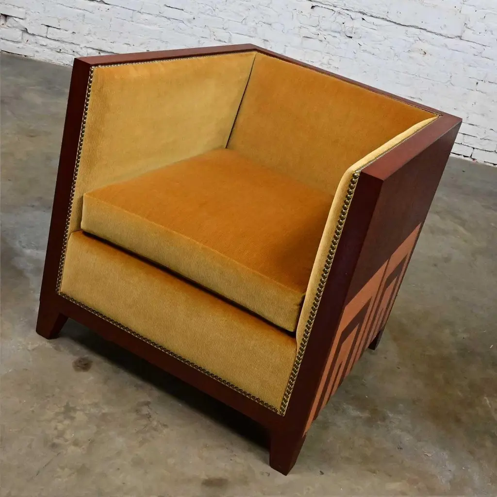 Fabulous vintage Art Deco Revival custom two-toned mahogany cube club chairs made by Rialto & designed by Zlata Pericic for Meca Design & Production, 8 available, selling separately. Comprised of mahogany frames and they are wearing their original gold faux mohair fabric with antique brass toned nail head trim. Beautiful condition, keeping in mind that these are vintage and not new so will have signs of use and wear. Each chair has its own wear or small flaw- see photos of chairs with numbers to select chair you want. The wood frames had some dings, chips, and missing veneer that we have repaired & touched up. It is very hard to detect, and the fabric is in phenomenal condition. May have some fading & 1 chair has 2 fade spots in fabric of the upper back. Please see photos and zoom in for details. We attempt to portray any imperfections. Circa, Late 20th Century.NOTE: These, along with several other matching pieces, were custom made for a large corporate office CEO and came from that private office, salon, and conference room. We have all those pieces listed here for sale, check them out! Contact us for group pricing on multiple pieces!Is 8 REALLY enough? Not as far as we are concerned… especially when it comes to something as INCREDIBLE as these custom designed cube club chairs!!! They are extremely well made and absolutely SOLID. They’re super heavy, made by Rialto, and custom designed by Zlata Pericic for Meca Design & Production. They are comprised of SUPER deep, dark mahogany frames with a unique shape as the back has a modest backward lean and the front is slightly wider than the back. As we stated, they are very deep so you may want to toss a throw pillow in it for extra comfort. Now, let’s talk about this phenomenal original gold fabric!! WOW!! It’s not quite velvet and it’s not quite mohair but it’s super soft with a very short pile so we are calling it faux mohair. It’s incredibly wrapped around the Dacron wrapped foam loose zippered seat cushion, seat back and inner arms, and the deck. And they are trimmed with lovely antique brass toned nail head trim. It looks SPECTACULAR!! The lower sides and back of the frames are adorned with gorgeous light mahogany geometric inlays and at a constructive perspective you should know that the tapered square feet are glued, screwed in, and have been applied separately. They are very geometric, extremely heavy, and absolutely head-turning! We are selling them separately so you can choose whether you want one, two, or more. (until they are gone!) They are Art Deco Revival with a little Postmodern vibe, and they are going to be WONDERFUL in your living room across from your sofa, in the corner of your bedroom, in the study facing the fireplace, or in the sitting room with a wonderful accent table in between! They are unique, exquisite, and we believe them be one of a kind, although we can’t be positive about that. Either way, they are marvelous and sure to be your favorite new vintage piece! We have a feeling they won’t last long… you better hurry and make one, two, or all 8 of them YOURS!!! Chair Size Each:• Height: 30.25 Inches• Width: 31 Inches• Depth: 32 Inches• Seat Height: 19 Inches• Inside Seat Width: 23 Inches• Inside Seat Depth: 25 Inches• Inside Back Height: 12 Inches• Clearance to floor: 3.75 Inches• Weight: 166.9 Pounds EachCrated Size: 1, 2, 4, 6, & 8• Crated Size 1: 36 x 37 x 38 x 270lbs• Crated Size 2: 60 x 37 x 38 x 495lbs• Crated Size 4: 60 x 37 x 67 x 978lbs• Crated Size 6: 66 x 70 x 70 x 1246lbs• Crated Size 8: 66 x 70 x 70 x 1516lbs