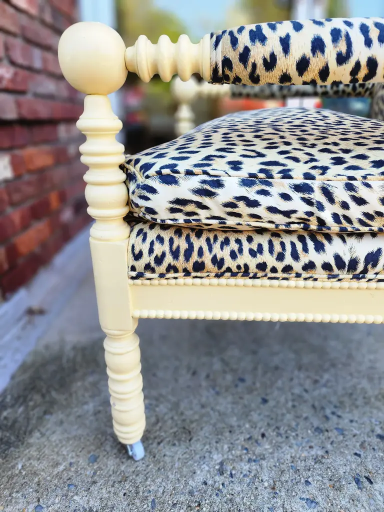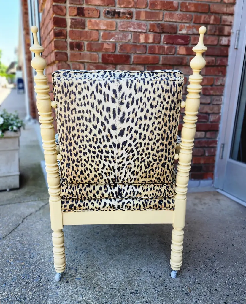 Pierre Frey Panthere De Somalie upholstered custom-made vintage spindle armchair lacquered in a creamy soft butter yellow. This chair will add whimsy and character to a bedroom, living room or any room in the house. 2 available