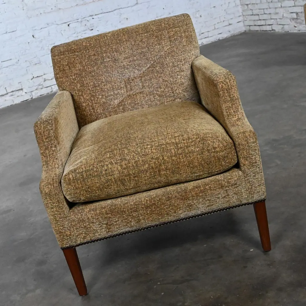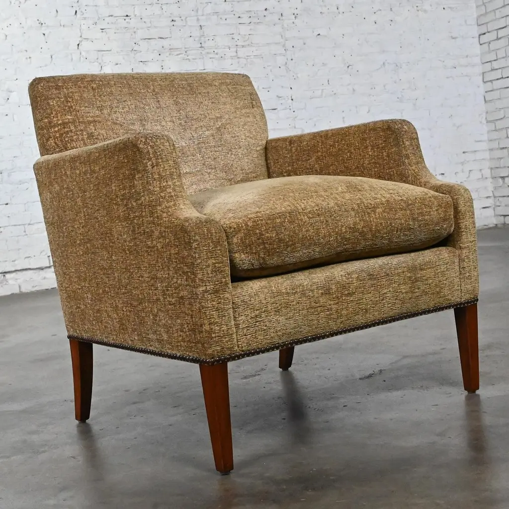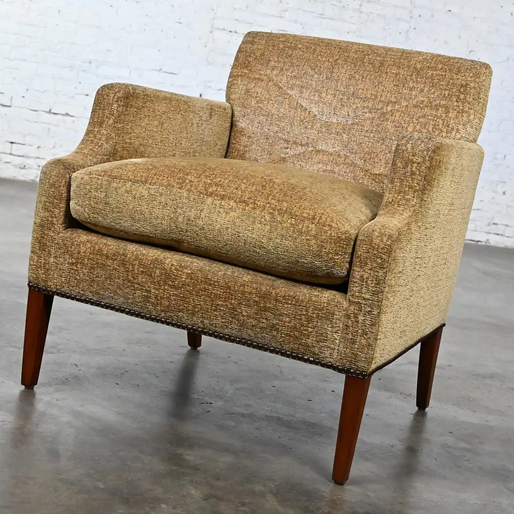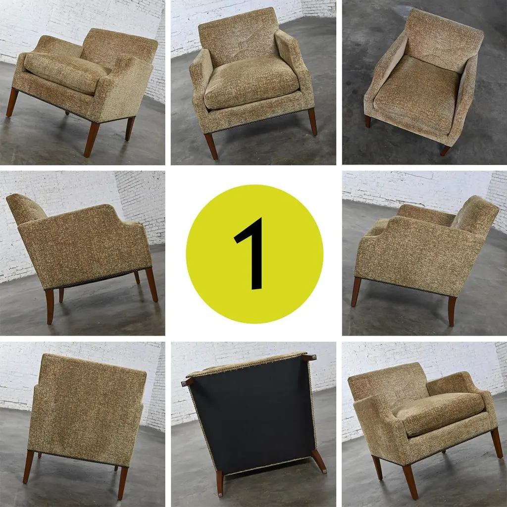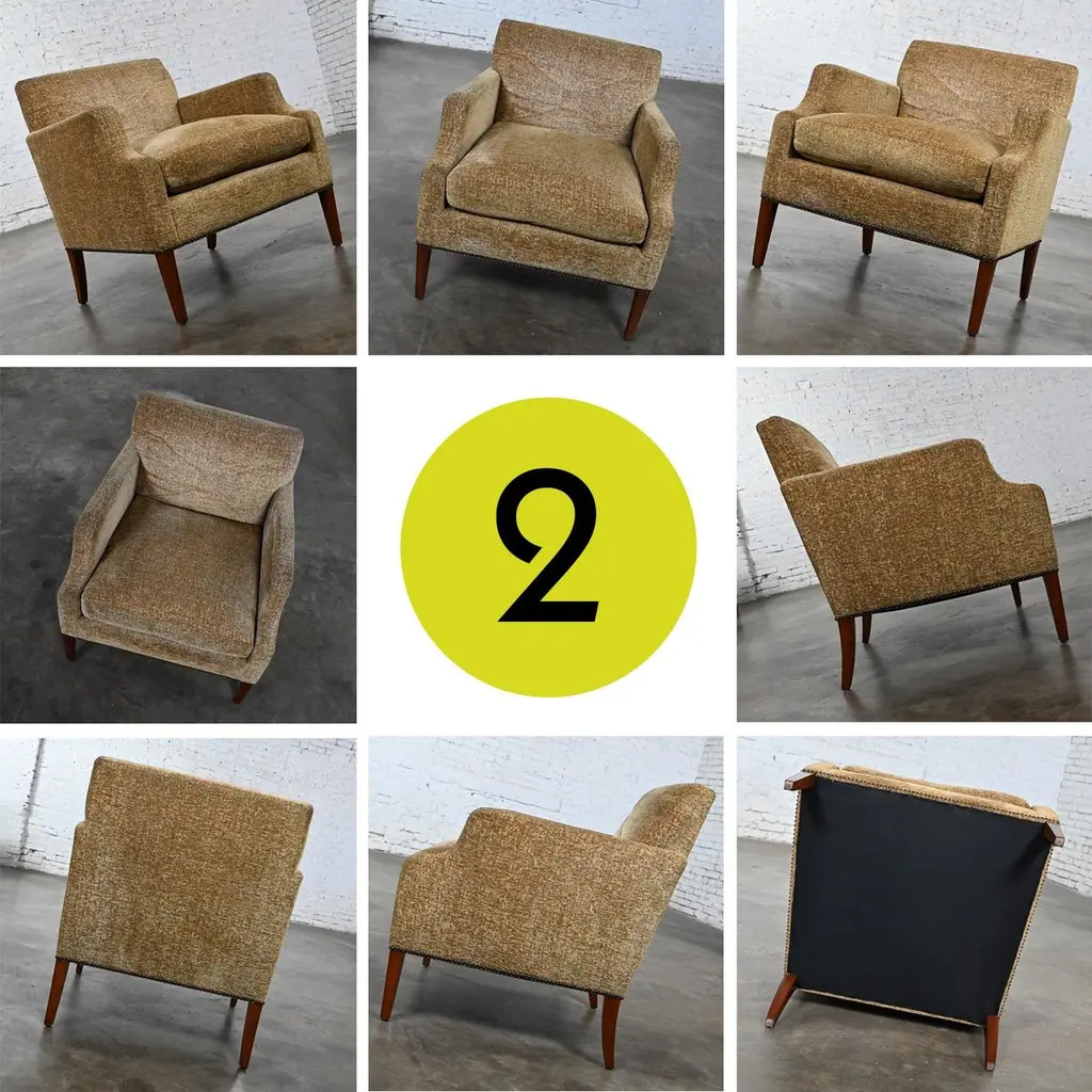 Superb vintage khaki chenille accent or lounge chairs comprised of down seat cushions, tight backs, antique brass colored nail head details, and square tapered wood legs. Currently 5 available, selling per chair. Beautiful condition, keeping in mind that these are vintage and not new so will have signs of use and wear. There is a bit of wear on the tops of the arms. Please see photos and zoom in for details. We attempt to portray any imperfections. Circa, Late 20th to Early 21st Century.Khaki lounge chair, EXTRORDINAIRE!!!! These are wonderful accent or lounge chairs that we are selling per chair, there are currently 5 available. They are comprised of super comfortable loose zippered down filled deep seat cushions, the arms have a curved detail where your hands rest, straight square tapered wood legs in the front, and slightly flared outward in the back. They have tight backs and when something is this fabulous, you top it with a bow! Well… a fabulous, stitched bow design in the seat back is more like it. Now, let’s talk about this FABRIC!!! WOW! It’s a soft khaki chenille but it’s very unique. When you look closely there are multiple colors including green, black, and red in the threads of the weave, but it gives off an overall khaki golden tan hue… it’s very neutral and absolutely BEAUTIFUL!!! They have self-upholstered decks and antique brass colored nail head details around the base of the chair. They are Modern with an Art Deco flair, but we think they will blend in beautifully with almost any style décor. So, the only question is, how many do you need? One… for the corner of your bedroom or dressing area? Two or Three… to place across from the sofa in the living room. Four… two pairs facing each other with a coffee table in between in the family room. Or ALL FIVE for the office waiting area or split up in different rooms of your home. The options are as endless as your imagination! These chairs are extremely comfortable, very versatile, and they exude a timeless style you are sure to love for years to come! Don’t hesitate… make one, two, or ALL OF THEM, YOURS!!!Size Each:•Height: 32.5 Inches•Width: 29 Inches•Depth: 31 Inches•Seat Height: 18 Inches•Arm Height: 25 Inches•Inside Seat Width: 22.5 Inches•Inside Seat Depth: 22 Inches•Inside Back Height: 13 Inches•Clearance to floor: 8 Inches•Weight: 48.97 PoundsCrated Size 1:•Height: 39 Inches•Width: 35 Inches•Depth: 37 Inches•Weight: 200 PoundsCrated Size 5:•Height: 60 Inches•Width: 67 Inches•Depth: 68 Inches•Weight: 450 Pounds
