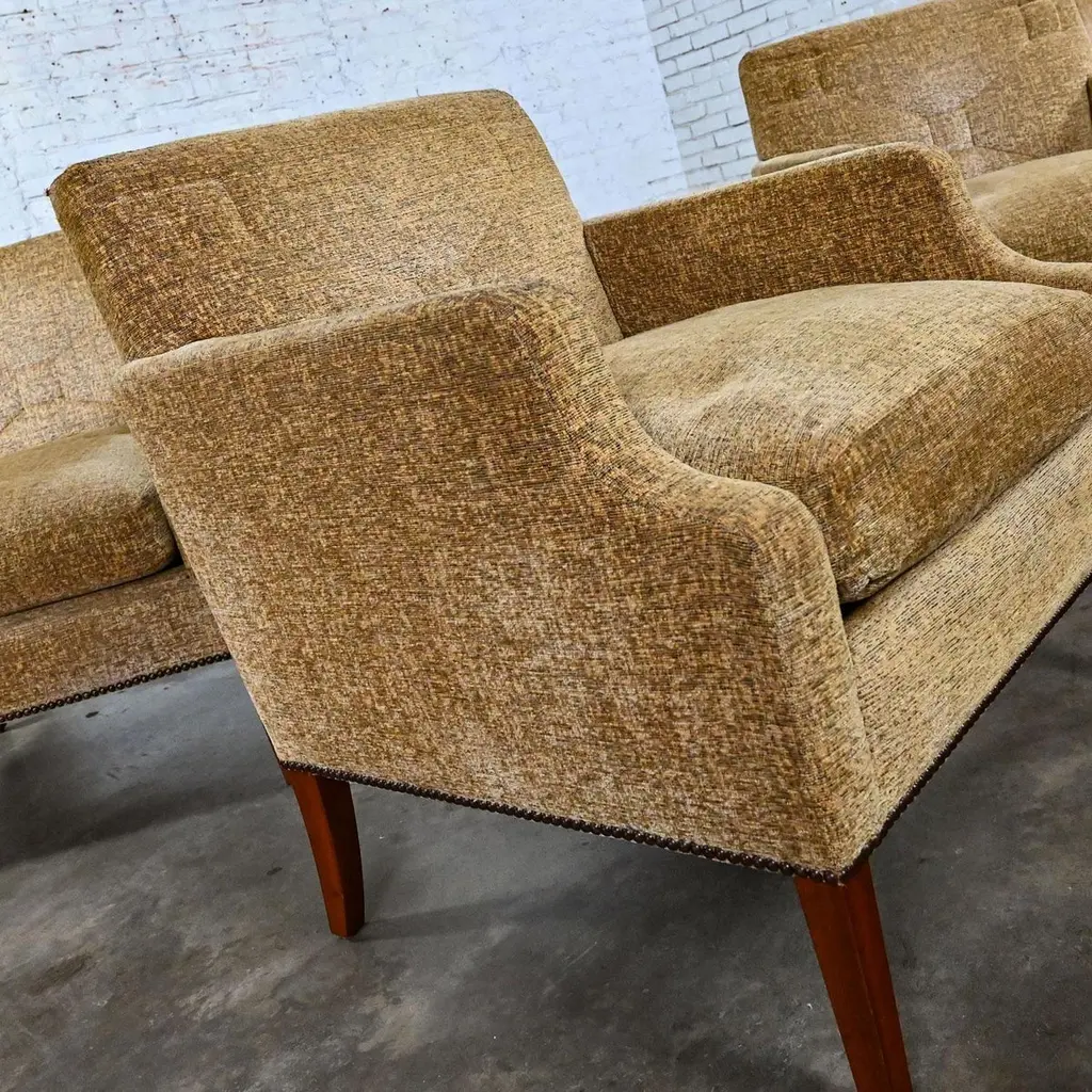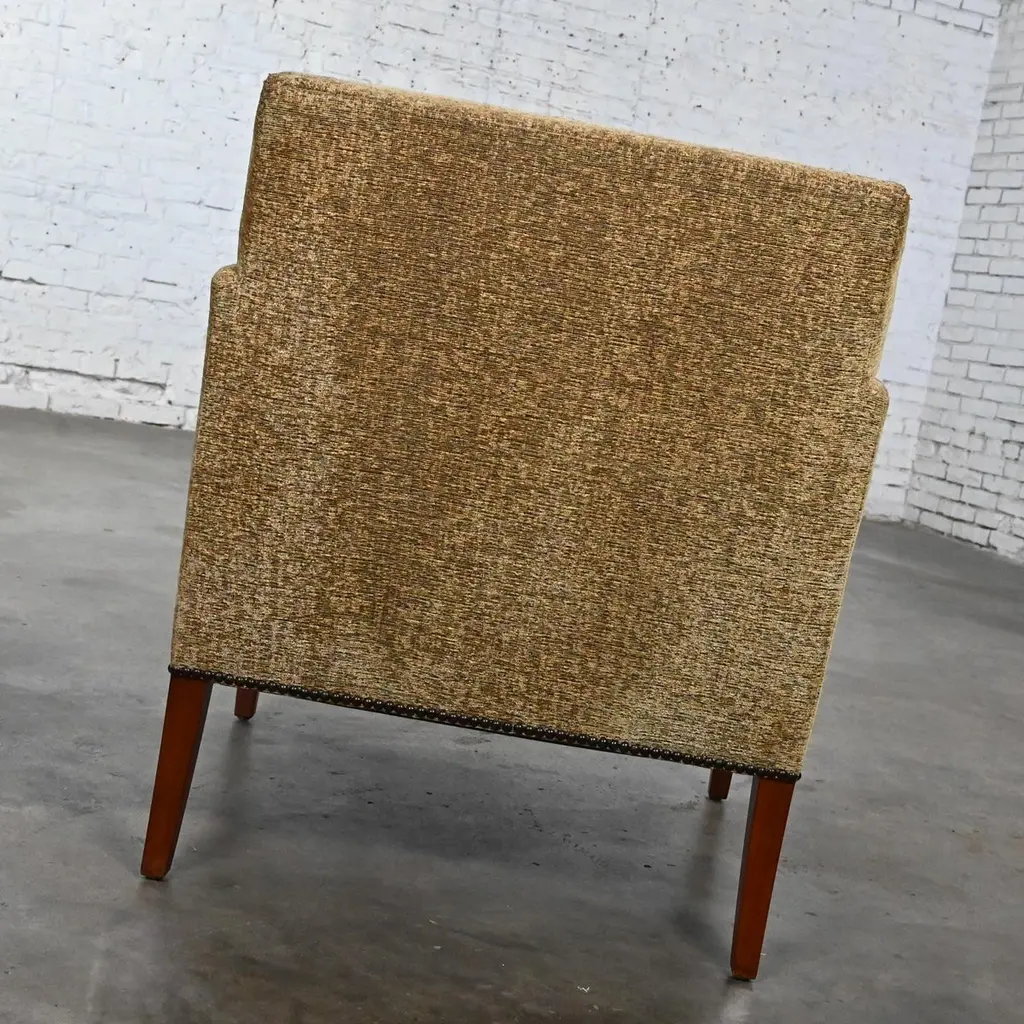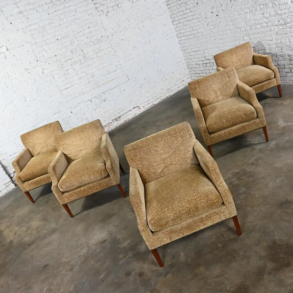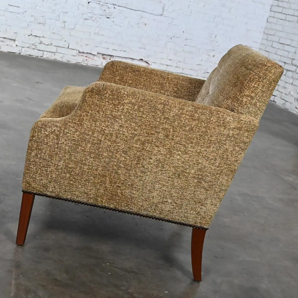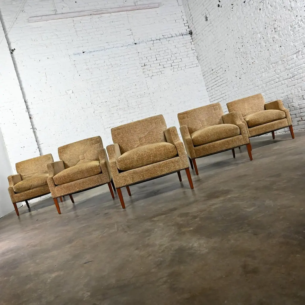 Superb vintage khaki chenille accent or lounge chairs comprised of down seat cushions, tight backs, antique brass colored nail head details, and square tapered wood legs. Currently 5 available, selling per chair. Beautiful condition, keeping in mind that these are vintage and not new so will have signs of use and wear. There is a bit of wear on the tops of the arms. Please see photos and zoom in for details. We attempt to portray any imperfections. Circa, Late 20th to Early 21st Century.Khaki lounge chair, EXTRORDINAIRE!!!! These are wonderful accent or lounge chairs that we are selling per chair, there are currently 5 available. They are comprised of super comfortable loose zippered down filled deep seat cushions, the arms have a curved detail where your hands rest, straight square tapered wood legs in the front, and slightly flared outward in the back. They have tight backs and when something is this fabulous, you top it with a bow! Well… a fabulous, stitched bow design in the seat back is more like it. Now, let’s talk about this FABRIC!!! WOW! It’s a soft khaki chenille but it’s very unique. When you look closely there are multiple colors including green, black, and red in the threads of the weave, but it gives off an overall khaki golden tan hue… it’s very neutral and absolutely BEAUTIFUL!!! They have self-upholstered decks and antique brass colored nail head details around the base of the chair. They are Modern with an Art Deco flair, but we think they will blend in beautifully with almost any style décor. So, the only question is, how many do you need? One… for the corner of your bedroom or dressing area? Two or Three… to place across from the sofa in the living room. Four… two pairs facing each other with a coffee table in between in the family room. Or ALL FIVE for the office waiting area or split up in different rooms of your home. The options are as endless as your imagination! These chairs are extremely comfortable, very versatile, and they exude a timeless style you are sure to love for years to come! Don’t hesitate… make one, two, or ALL OF THEM, YOURS!!!Size Each:•Height: 32.5 Inches•Width: 29 Inches•Depth: 31 Inches•Seat Height: 18 Inches•Arm Height: 25 Inches•Inside Seat Width: 22.5 Inches•Inside Seat Depth: 22 Inches•Inside Back Height: 13 Inches•Clearance to floor: 8 Inches•Weight: 48.97 PoundsCrated Size 1:•Height: 39 Inches•Width: 35 Inches•Depth: 37 Inches•Weight: 200 PoundsCrated Size 5:•Height: 60 Inches•Width: 67 Inches•Depth: 68 Inches•Weight: 450 Pounds
