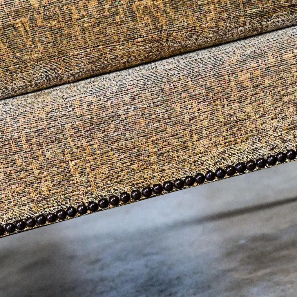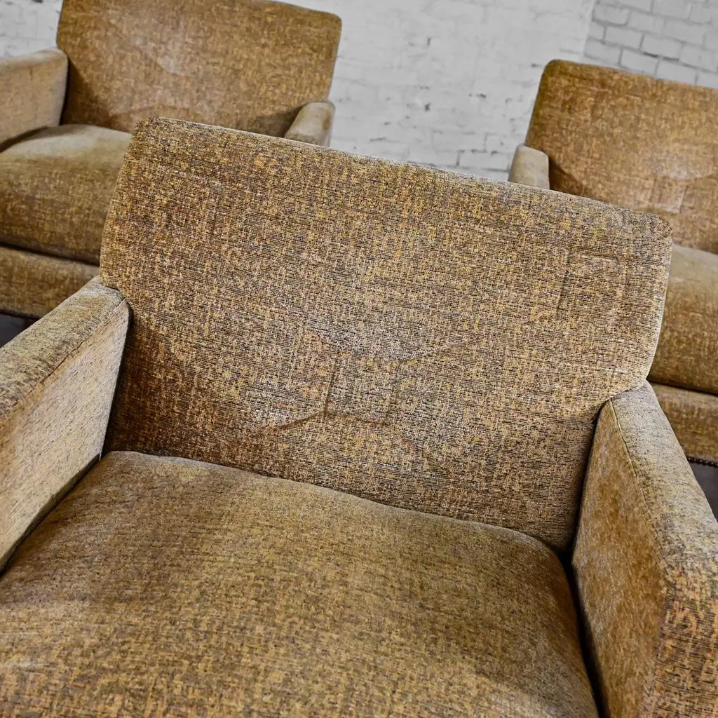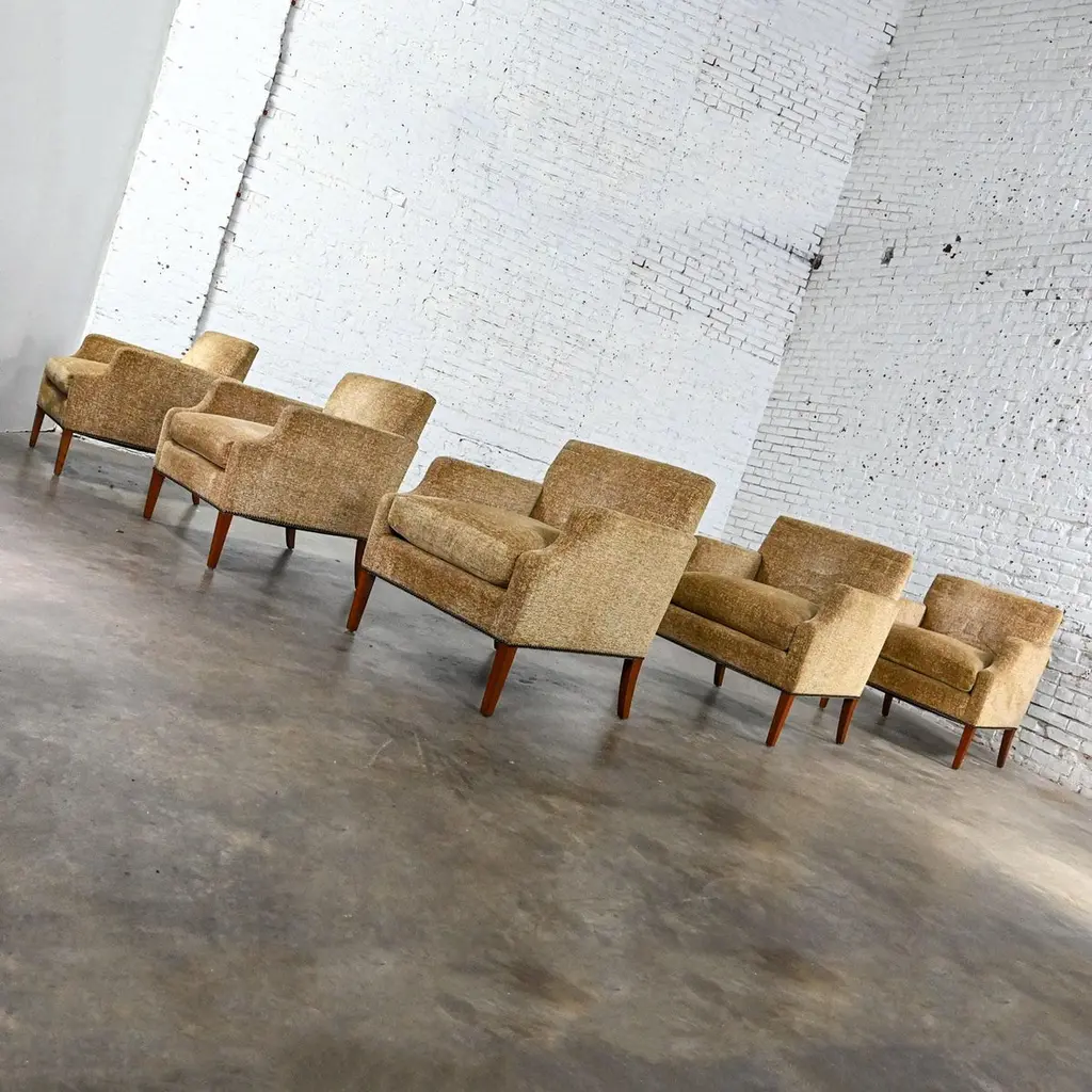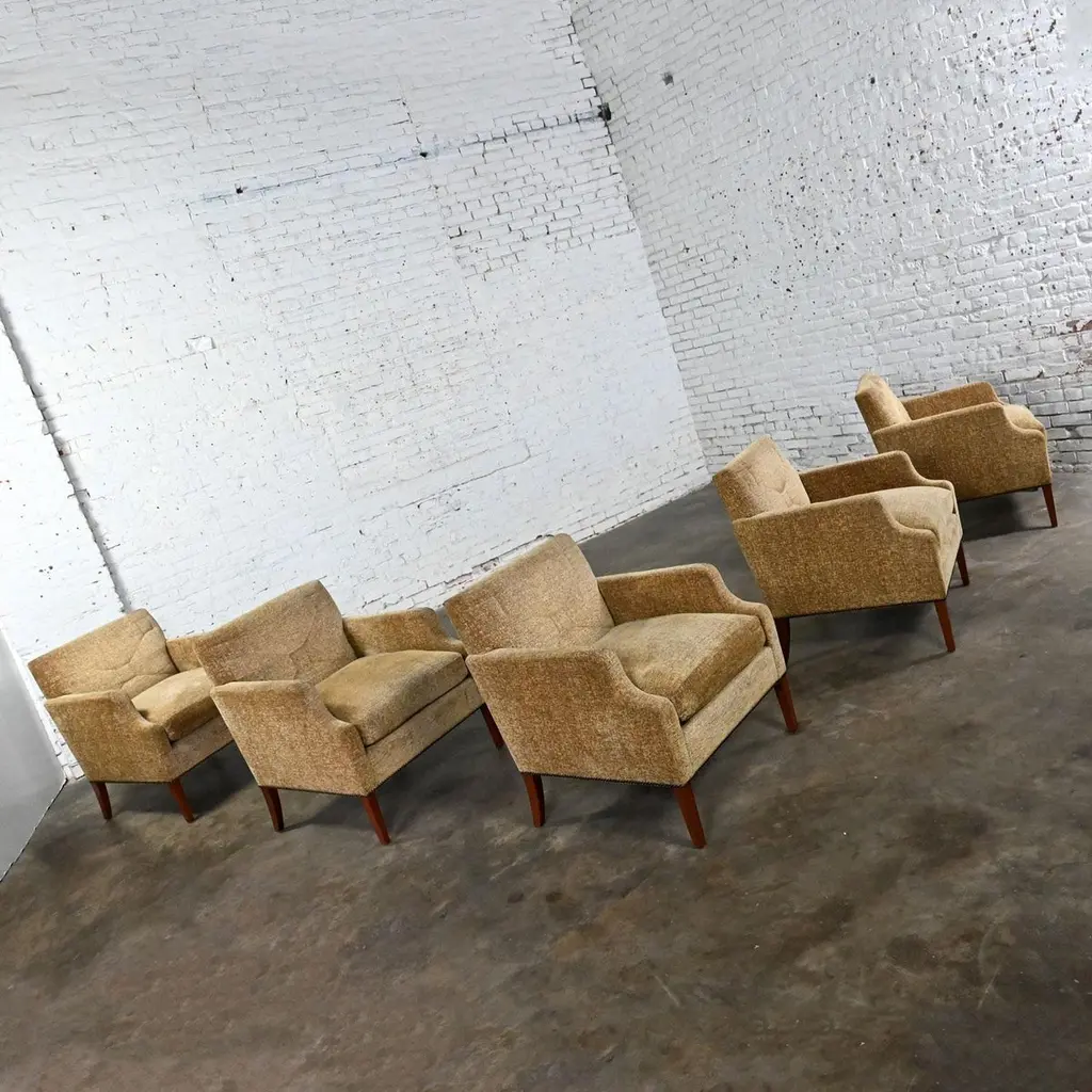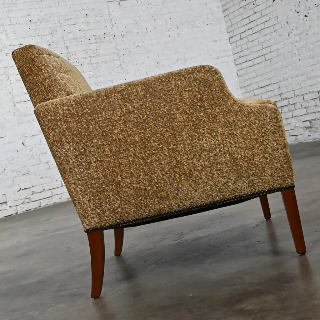 Superb vintage khaki chenille accent or lounge chairs comprised of down seat cushions, tight backs, antique brass colored nail head details, and square tapered wood legs. Currently 5 available, selling per chair. Beautiful condition, keeping in mind that these are vintage and not new so will have signs of use and wear. There is a bit of wear on the tops of the arms. Please see photos and zoom in for details. We attempt to portray any imperfections. Circa, Late 20th to Early 21st Century.Khaki lounge chair, EXTRORDINAIRE!!!! These are wonderful accent or lounge chairs that we are selling per chair, there are currently 5 available. They are comprised of super comfortable loose zippered down filled deep seat cushions, the arms have a curved detail where your hands rest, straight square tapered wood legs in the front, and slightly flared outward in the back. They have tight backs and when something is this fabulous, you top it with a bow! Well… a fabulous, stitched bow design in the seat back is more like it. Now, let’s talk about this FABRIC!!! WOW! It’s a soft khaki chenille but it’s very unique. When you look closely there are multiple colors including green, black, and red in the threads of the weave, but it gives off an overall khaki golden tan hue… it’s very neutral and absolutely BEAUTIFUL!!! They have self-upholstered decks and antique brass colored nail head details around the base of the chair. They are Modern with an Art Deco flair, but we think they will blend in beautifully with almost any style décor. So, the only question is, how many do you need? One… for the corner of your bedroom or dressing area? Two or Three… to place across from the sofa in the living room. Four… two pairs facing each other with a coffee table in between in the family room. Or ALL FIVE for the office waiting area or split up in different rooms of your home. The options are as endless as your imagination! These chairs are extremely comfortable, very versatile, and they exude a timeless style you are sure to love for years to come! Don’t hesitate… make one, two, or ALL OF THEM, YOURS!!!Size Each:•Height: 32.5 Inches•Width: 29 Inches•Depth: 31 Inches•Seat Height: 18 Inches•Arm Height: 25 Inches•Inside Seat Width: 22.5 Inches•Inside Seat Depth: 22 Inches•Inside Back Height: 13 Inches•Clearance to floor: 8 Inches•Weight: 48.97 PoundsCrated Size 1:•Height: 39 Inches•Width: 35 Inches•Depth: 37 Inches•Weight: 200 PoundsCrated Size 5:•Height: 60 Inches•Width: 67 Inches•Depth: 68 Inches•Weight: 450 Pounds