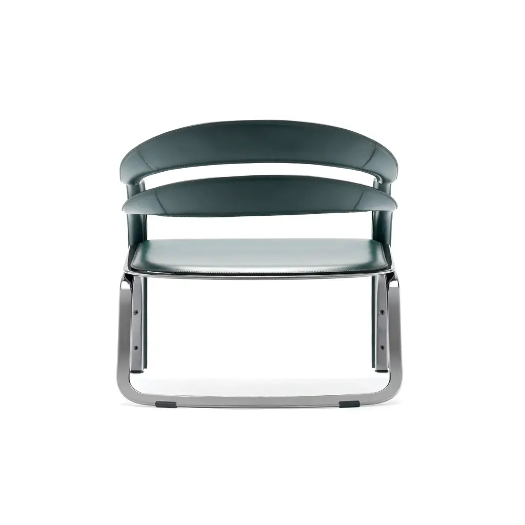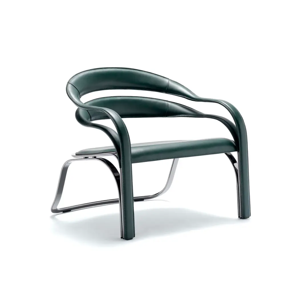 The Fettuccini W is a lounge chair with a flexible steel structure available in various finishes. The seat, double backrest, and armrests are lightly padded and upholstered in full-grain leather or premium leather. A distinctive feature is the armrest upholstery, which extends down to the floor. This chair is well-regarded in both residential spaces and waiting areas of offices and businesses.