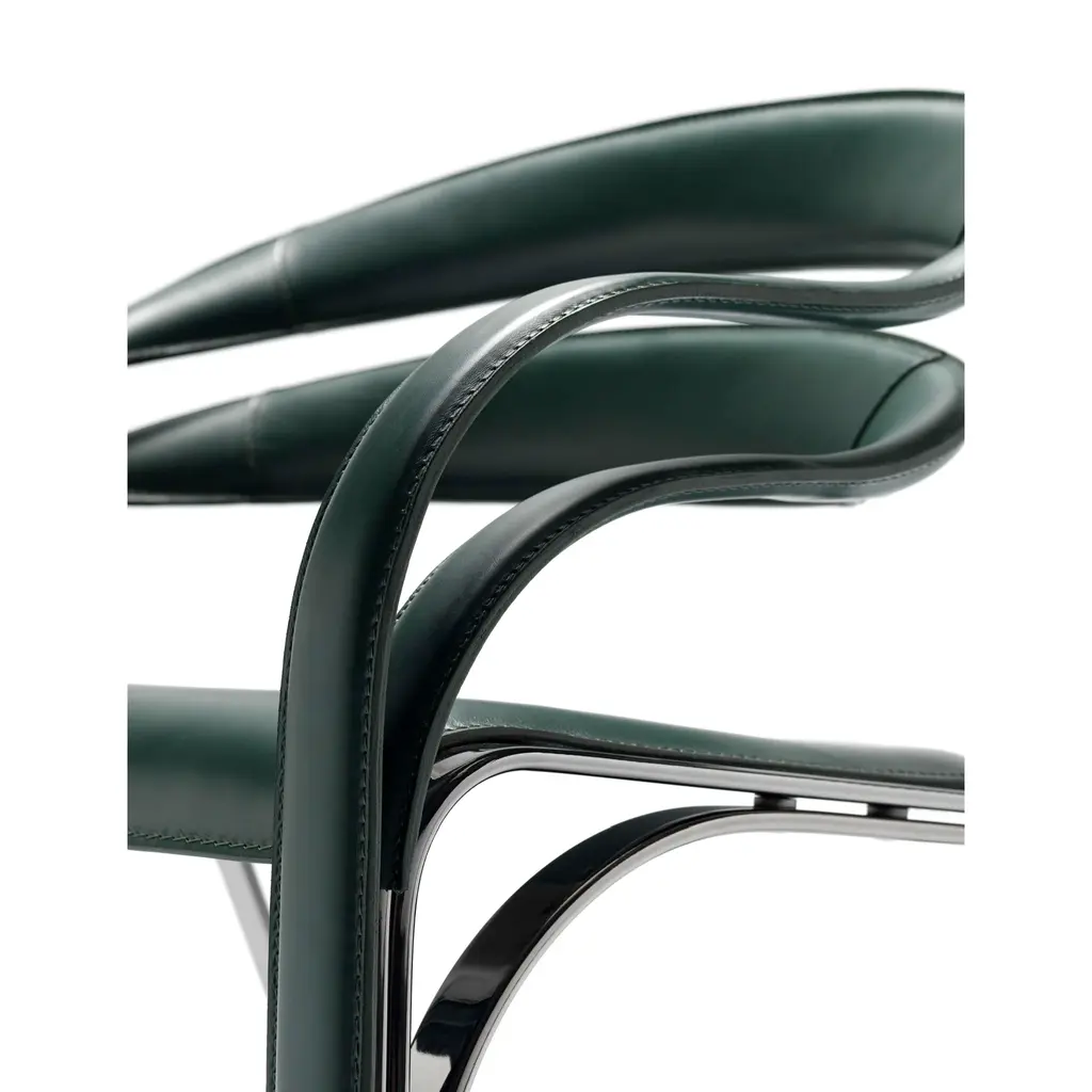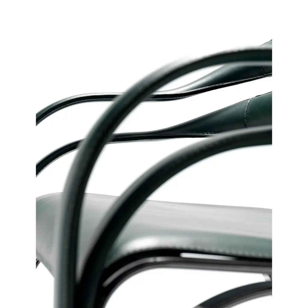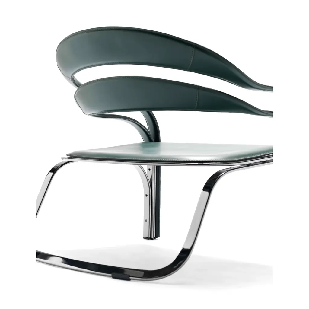 The Fettuccini W is a lounge chair with a flexible steel structure available in various finishes. The seat, double backrest, and armrests are lightly padded and upholstered in full-grain leather or premium leather. A distinctive feature is the armrest upholstery, which extends down to the floor. This chair is well-regarded in both residential spaces and waiting areas of offices and businesses.