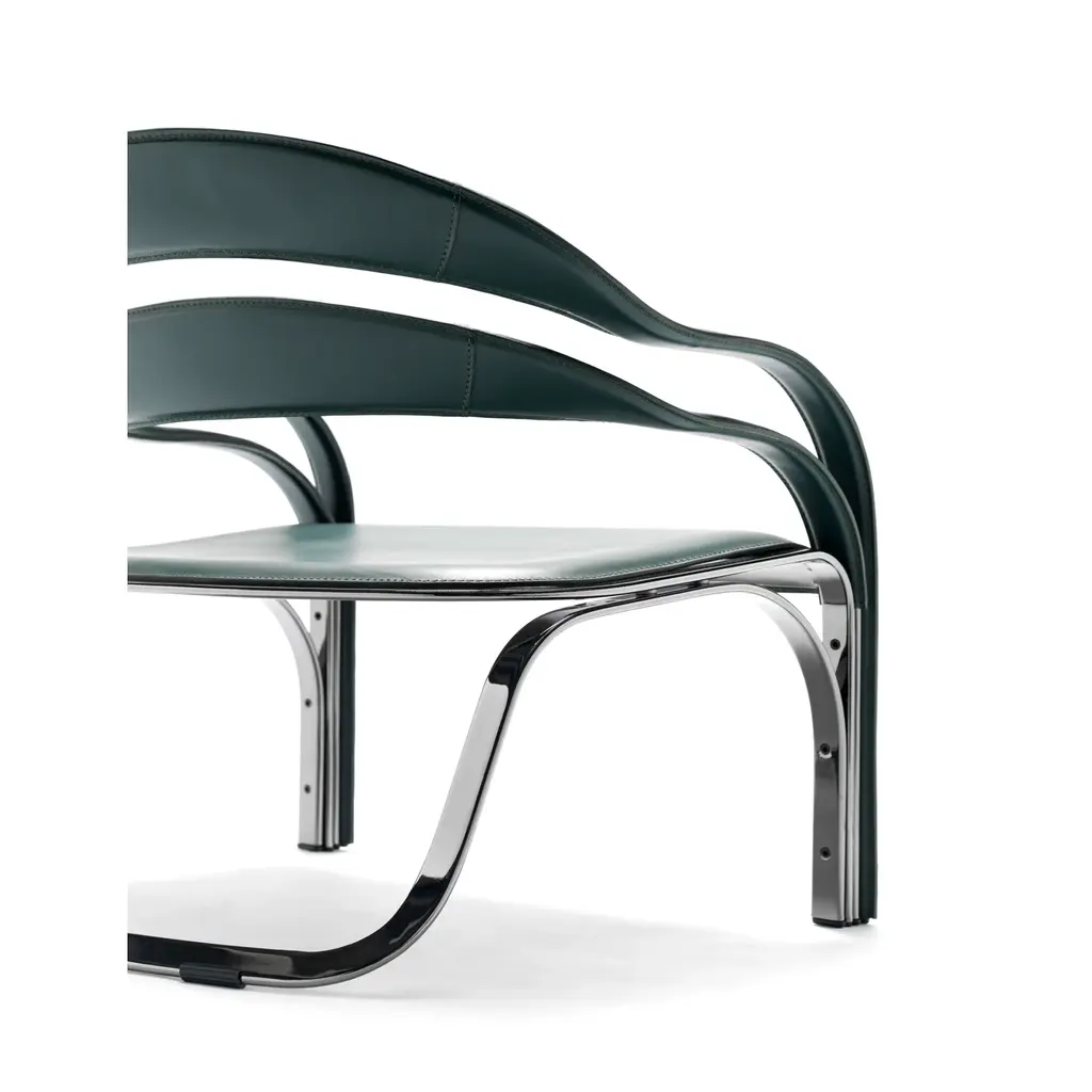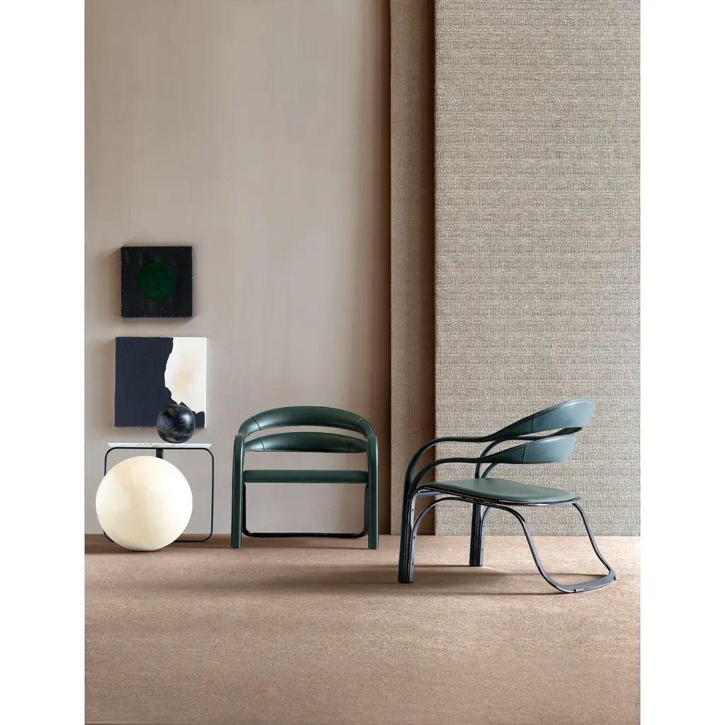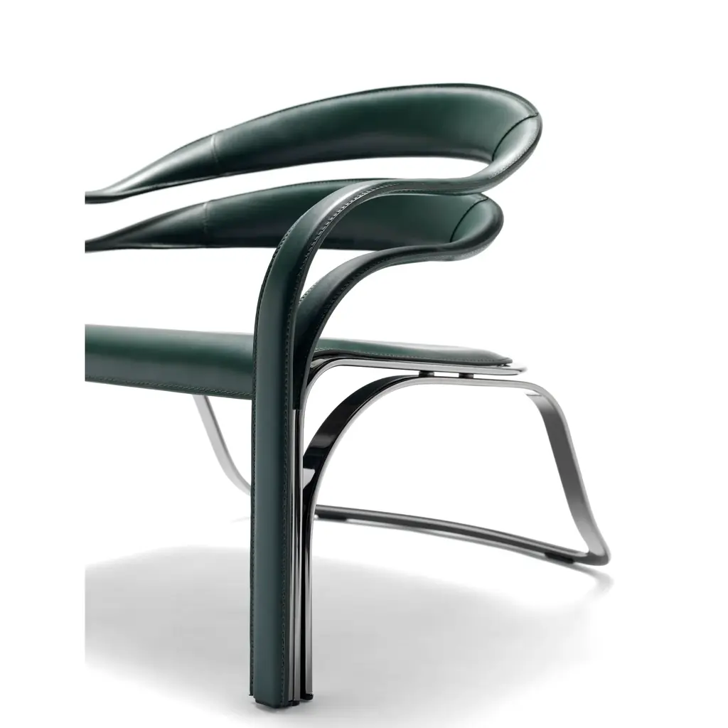 The Fettuccini W is a lounge chair with a flexible steel structure available in various finishes. The seat, double backrest, and armrests are lightly padded and upholstered in full-grain leather or premium leather. A distinctive feature is the armrest upholstery, which extends down to the floor. This chair is well-regarded in both residential spaces and waiting areas of offices and businesses.