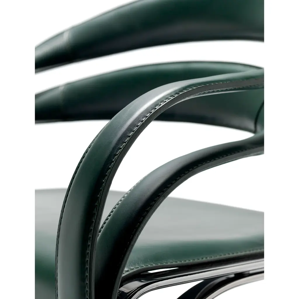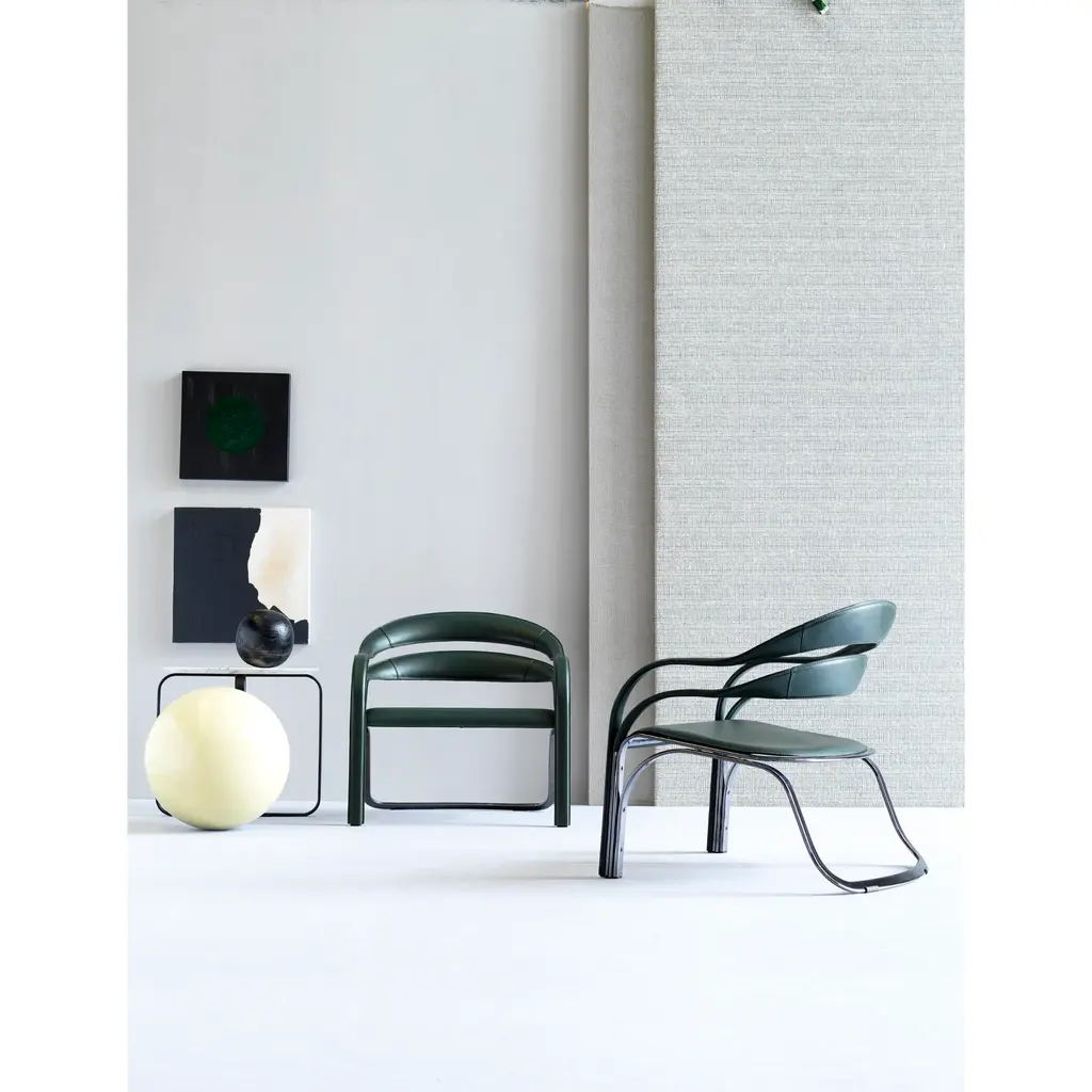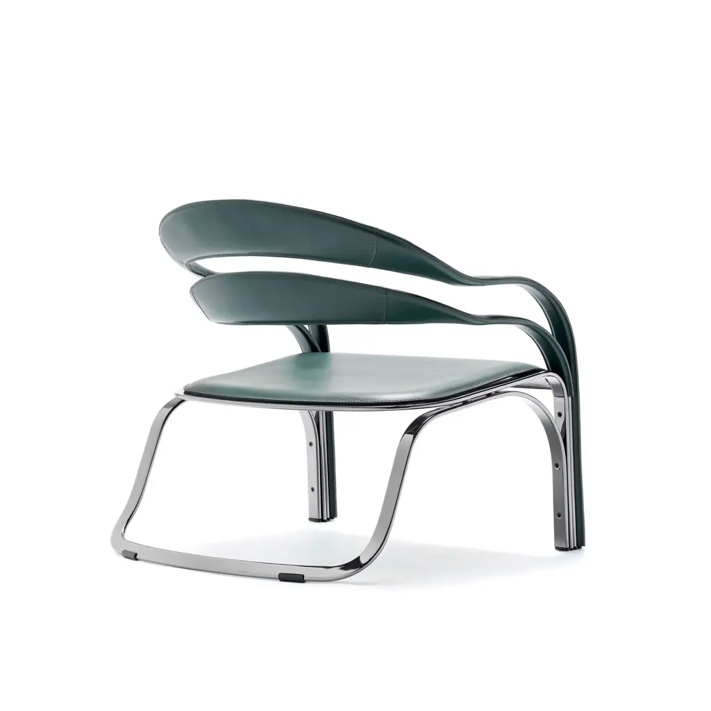 The Fettuccini W is a lounge chair with a flexible steel structure available in various finishes. The seat, double backrest, and armrests are lightly padded and upholstered in full-grain leather or premium leather. A distinctive feature is the armrest upholstery, which extends down to the floor. This chair is well-regarded in both residential spaces and waiting areas of offices and businesses.
