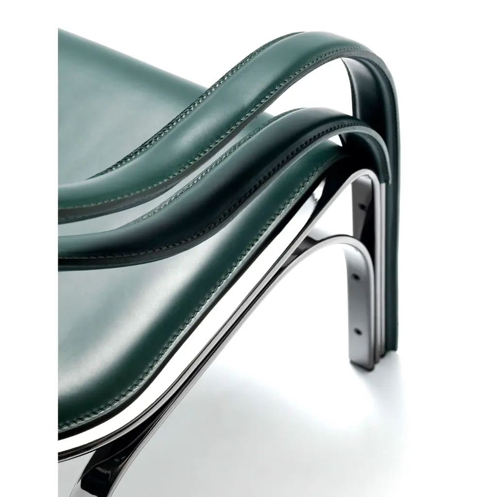 The Fettuccini W is a lounge chair with a flexible steel structure available in various finishes. The seat, double backrest, and armrests are lightly padded and upholstered in full-grain leather or premium leather. A distinctive feature is the armrest upholstery, which extends down to the floor. This chair is well-regarded in both residential spaces and waiting areas of offices and businesses.