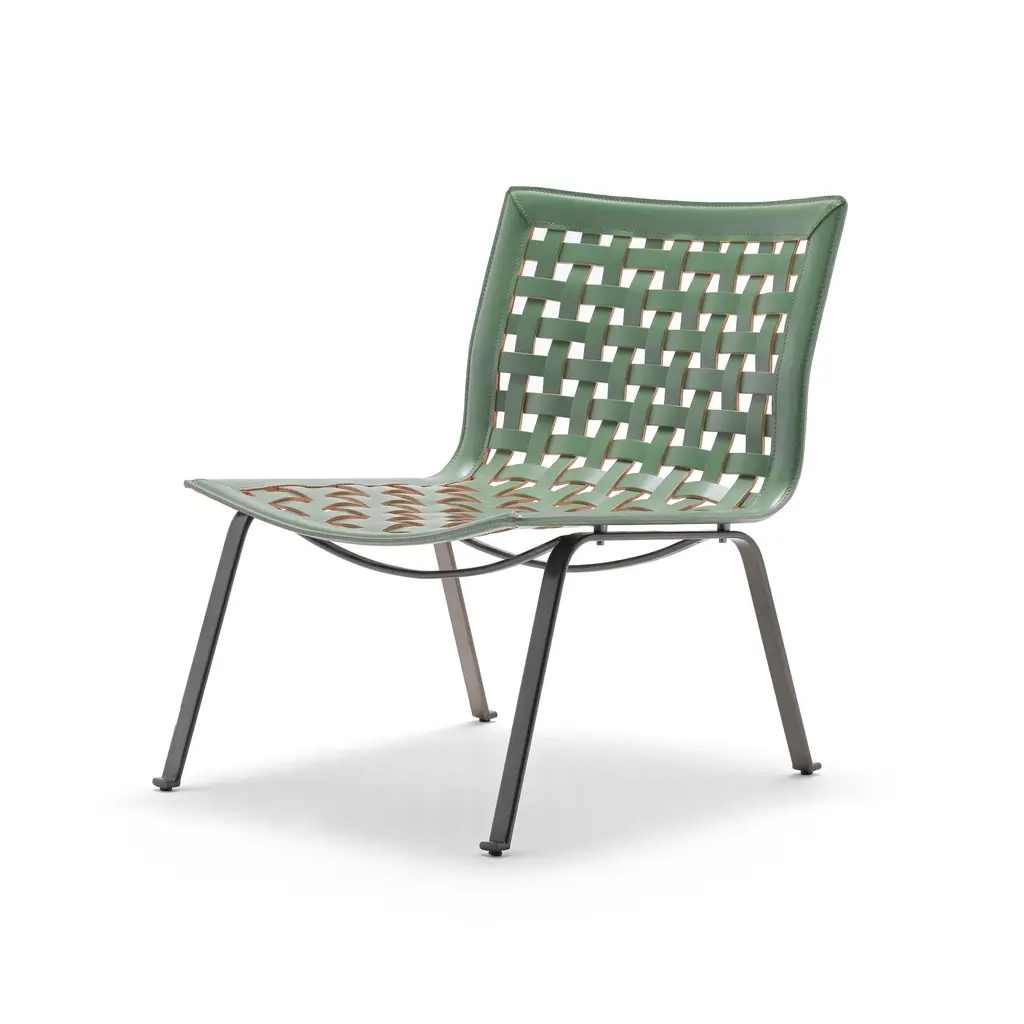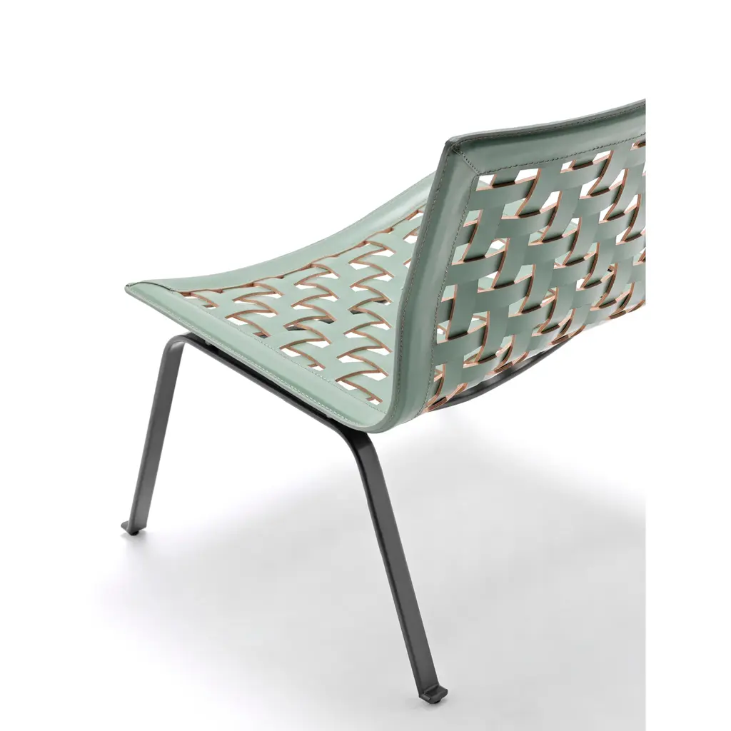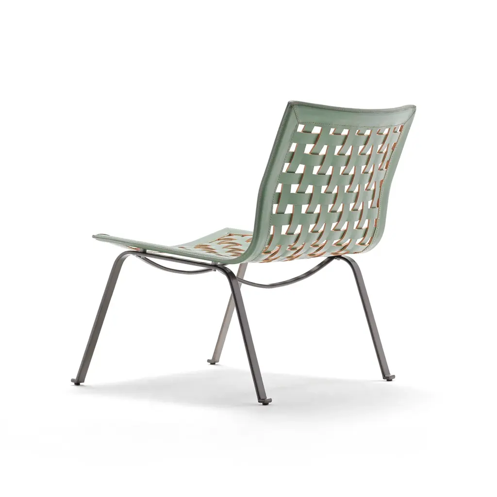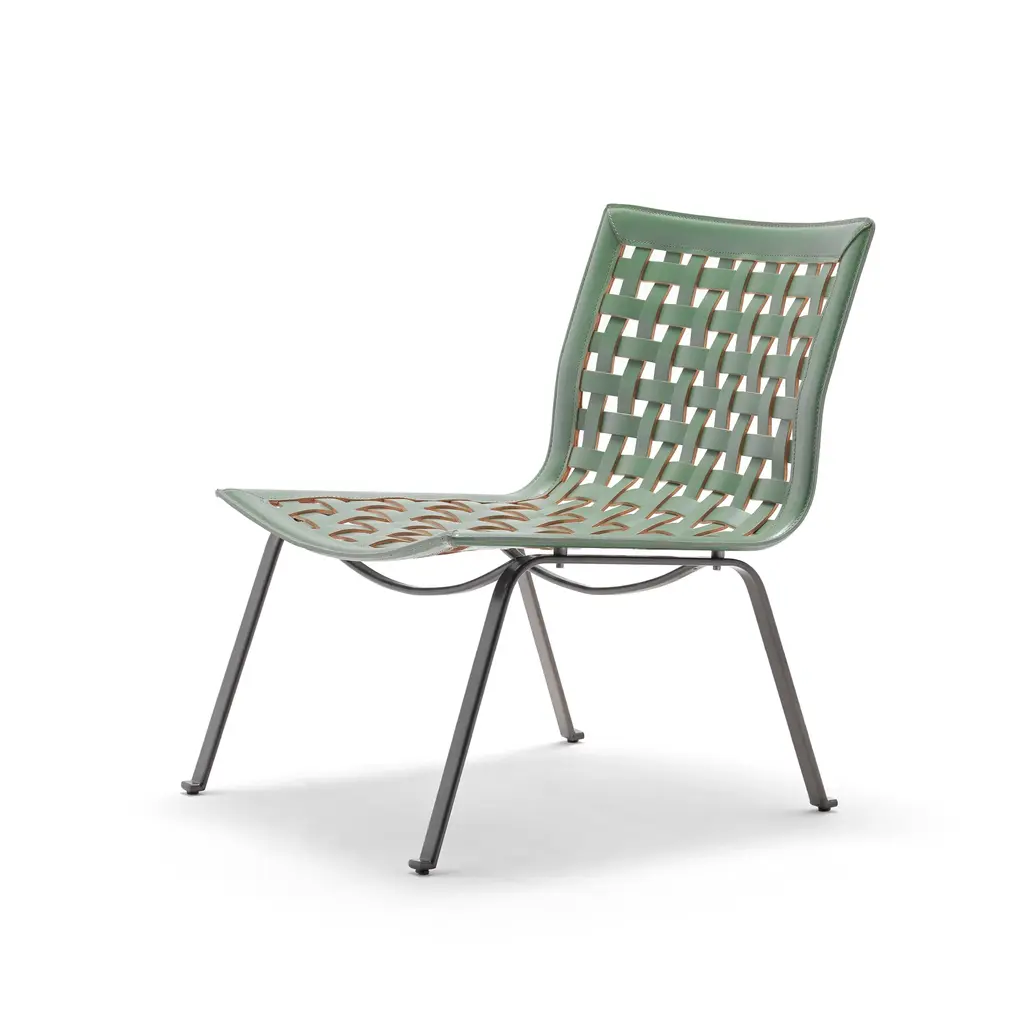 Net W is the lounge chair with a steel structure in various Fasem finishes, featuring a seat and backrest entirely made of woven full-grain Fasem leather. The visible cut of the weaving highlights the quality of the full-grain Fasem leather and is expressed in warm chromatic tones. The handcrafted nature, combined with the high quality of the material, makes it a striking chair with immediate recognition.