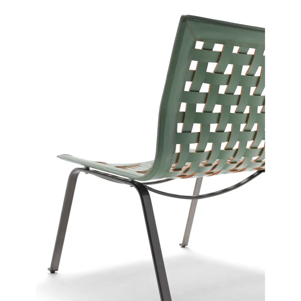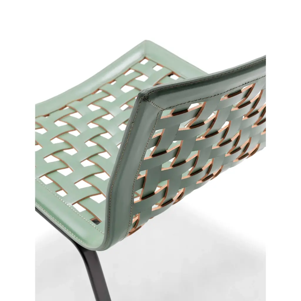 Net W is the lounge chair with a steel structure in various Fasem finishes, featuring a seat and backrest entirely made of woven full-grain Fasem leather. The visible cut of the weaving highlights the quality of the full-grain Fasem leather and is expressed in warm chromatic tones. The handcrafted nature, combined with the high quality of the material, makes it a striking chair with immediate recognition.