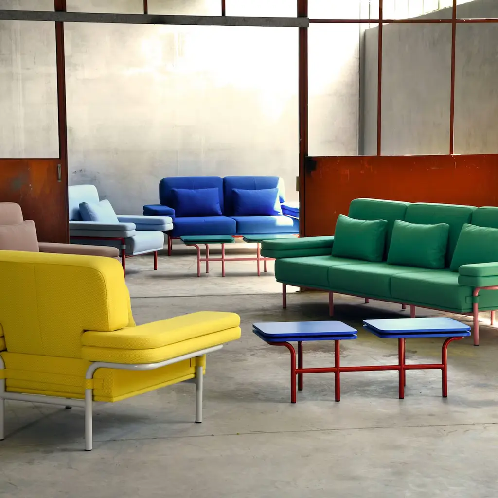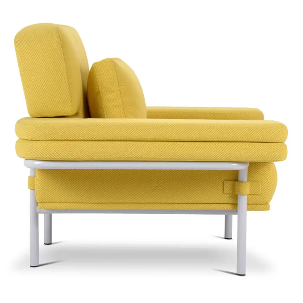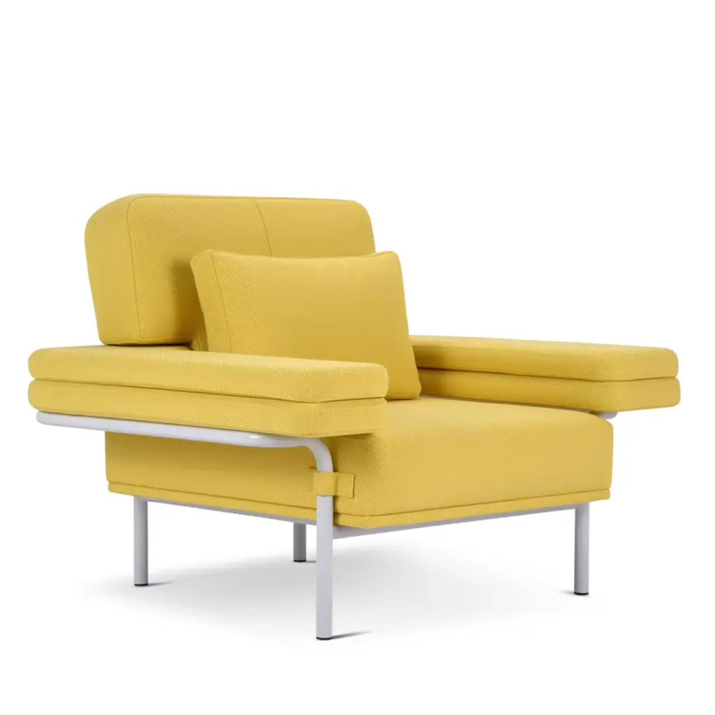 Designed with comfort in mind, this exclusive armchair is a triumph of plush volumes sure to offer long-lasting comfort. The essential cylindrical metal frame is complemented by a wide backrest (39cm high), seat, and armrests generously cushioned design emphasized by a sunny yellow upholstery in recycled jacquard fabric. Other colors are available in the Artemest catalog.