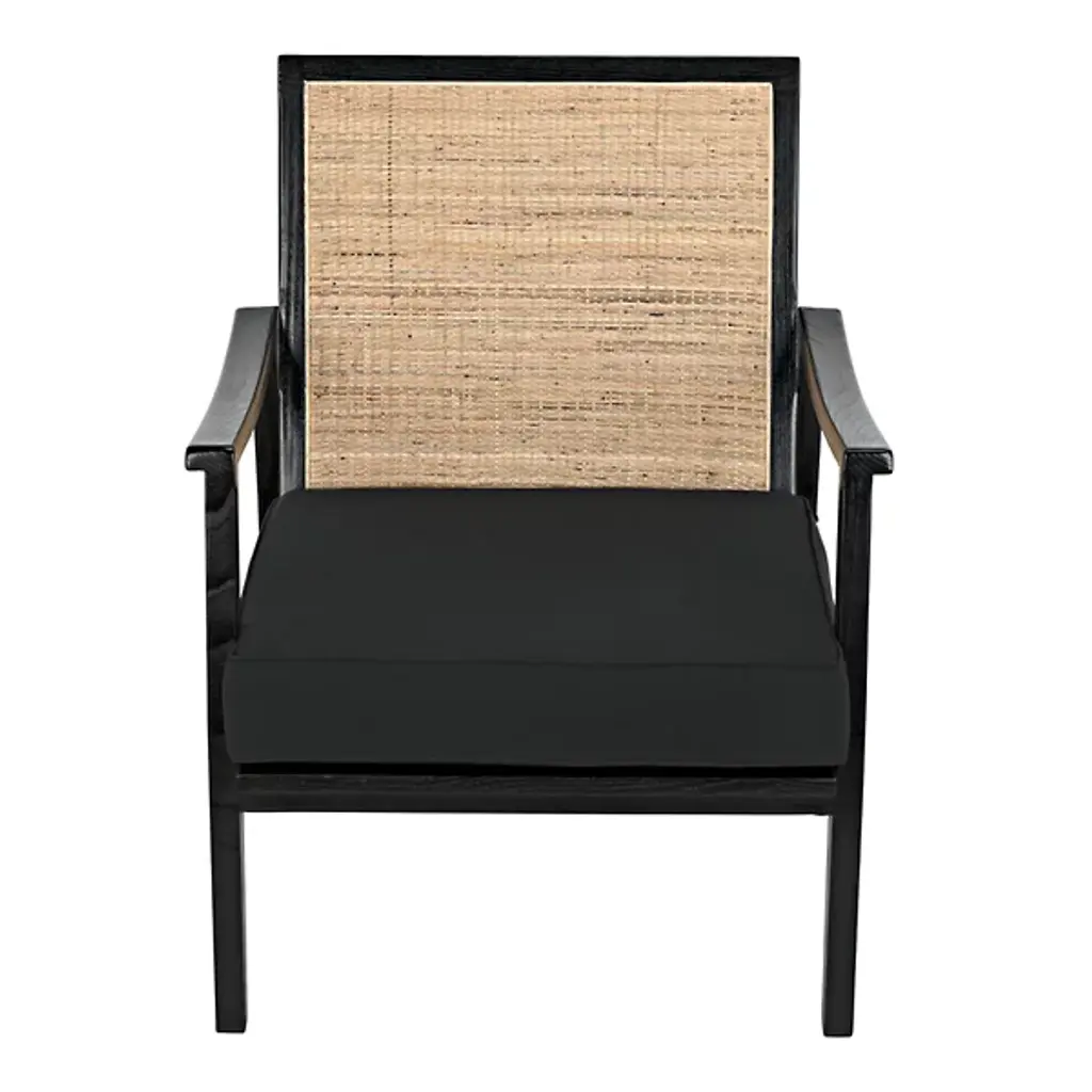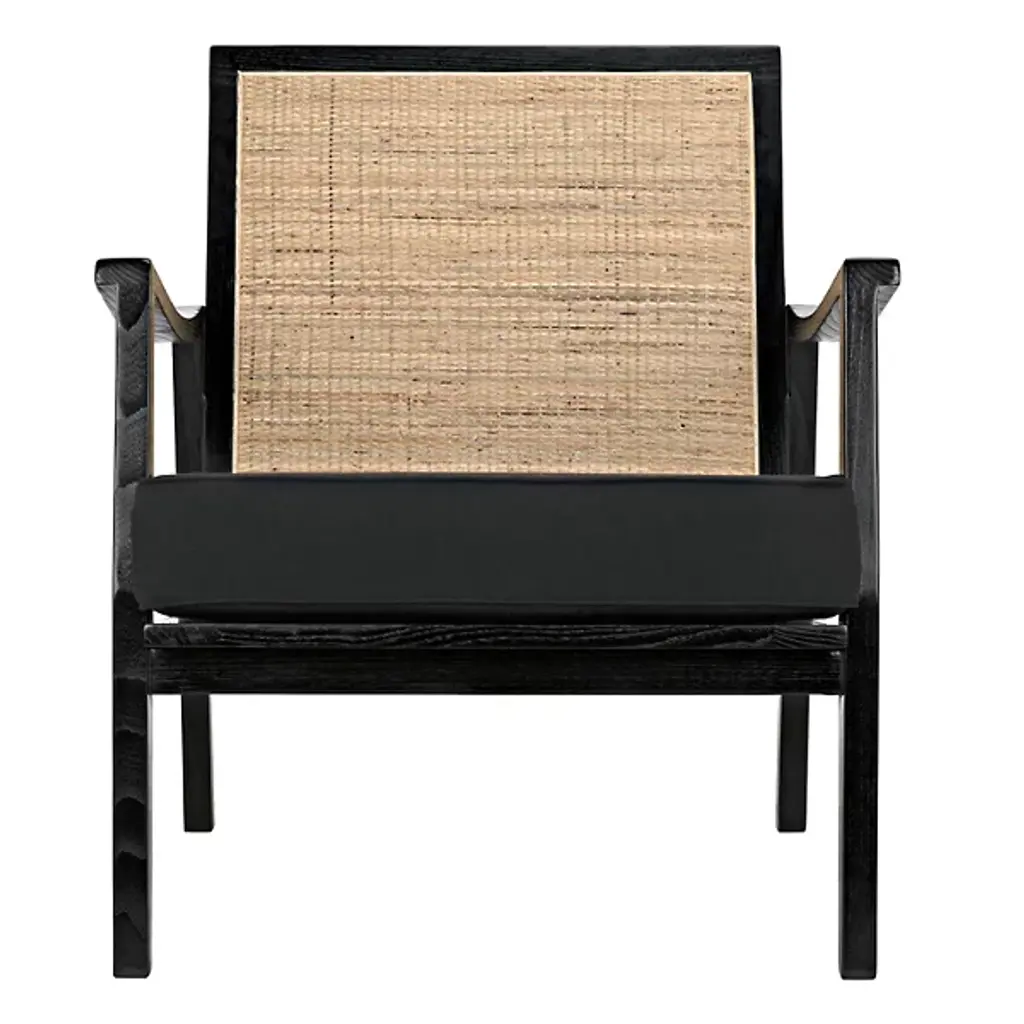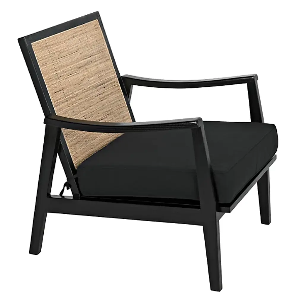 The Lichtenstein Lounge Chair from Noir embodies both mid-century modern and artisanal modern styles, creating a distinct blend of simplicity and craftsmanship. Its black frame effortlessly complements the natural woven front and back panel, adding a touch of retro elegance to your decor. Complete with a comfortable black cotton seat cushion, this chair offers both style and coziness. Crafted from Sungkai, Mindi, and Peeled Rattan, it makes a durable and stylish addition to any living space, elevating its surroundings with a tasteful fusion of design elements, promising not just a chair but a statement piece.