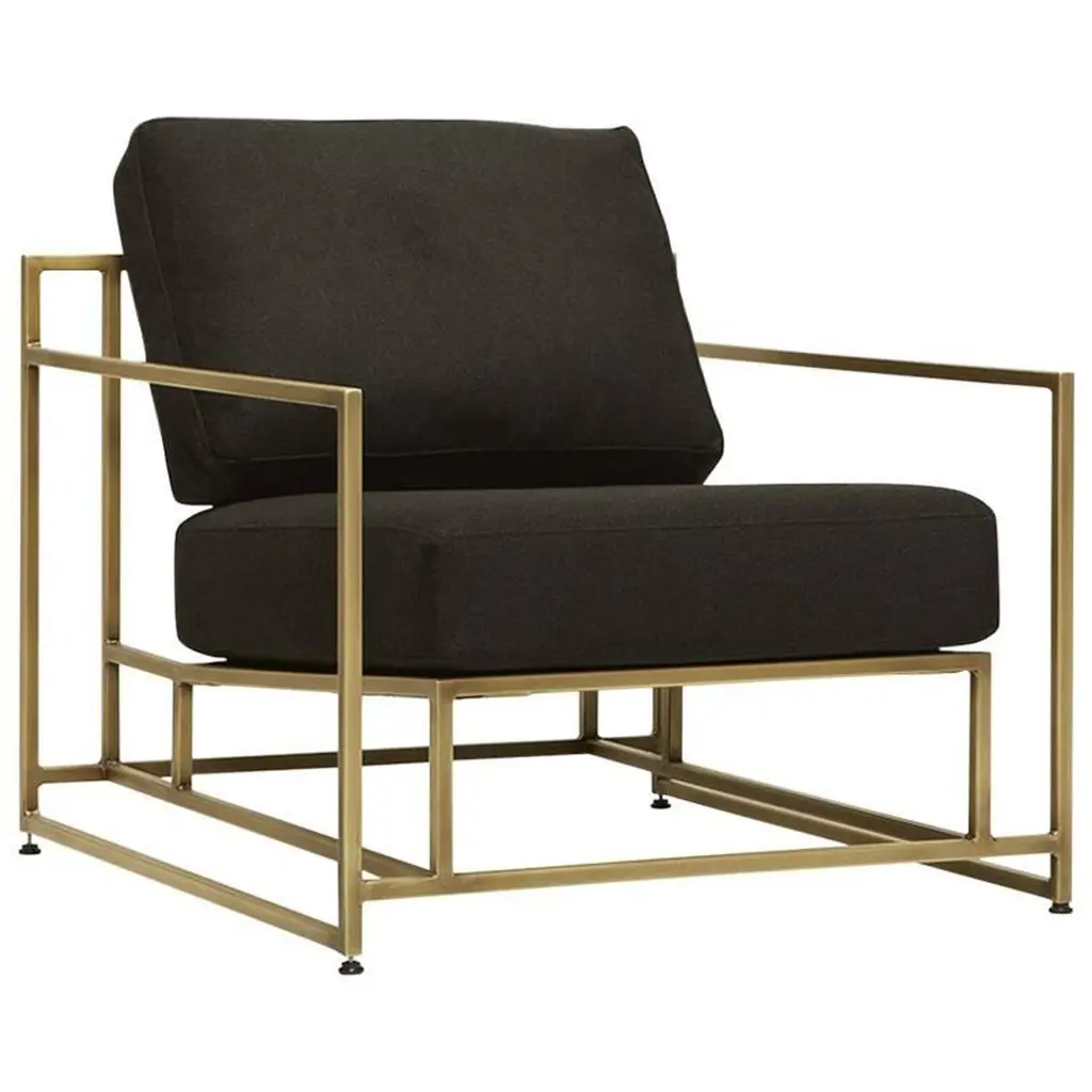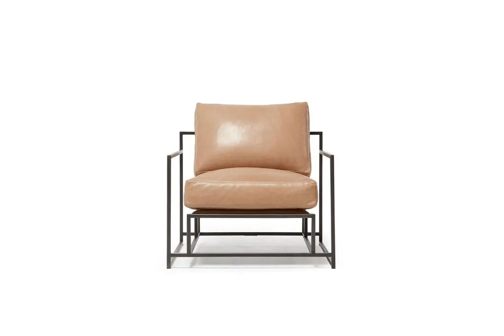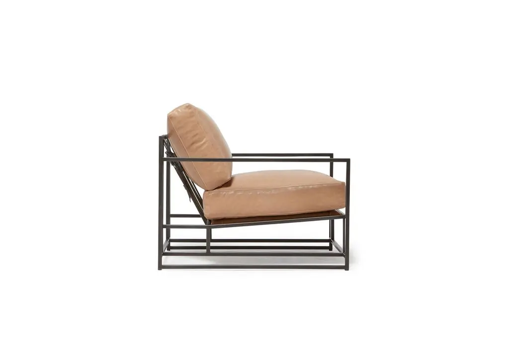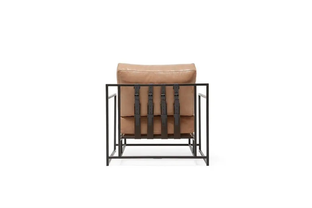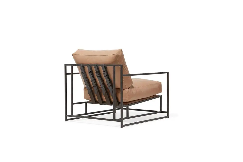 The Inheritance Armchair by Stephen Kenn is as comfortable as it is unique. The design features an exposed construction composed of three elements - a steel frame, plush upholstery, and supportive belts. The deep seating area is perfect for a relaxing lounge experience. Every Stephen Kenn piece is made to order through our Los Angeles studio in partnership with a number of small businesses and fabricators in the LA area. With this highly customizable armchair you can select from a wide range of finishes and materials to complement your home and lifestyle - please message us to see our Customization Guide with all available options.This version of our Inheritance Armchair is upholstered in pecan leather from the Valhalla Collection by Moore & Giles. The foam seat cushion has been wrapped in down for added comfort and sits atop a blackened steel frame. The armchair is strapped with support belts featuring charcoal cotton webbing, black leather, and blackened steel buckles.
