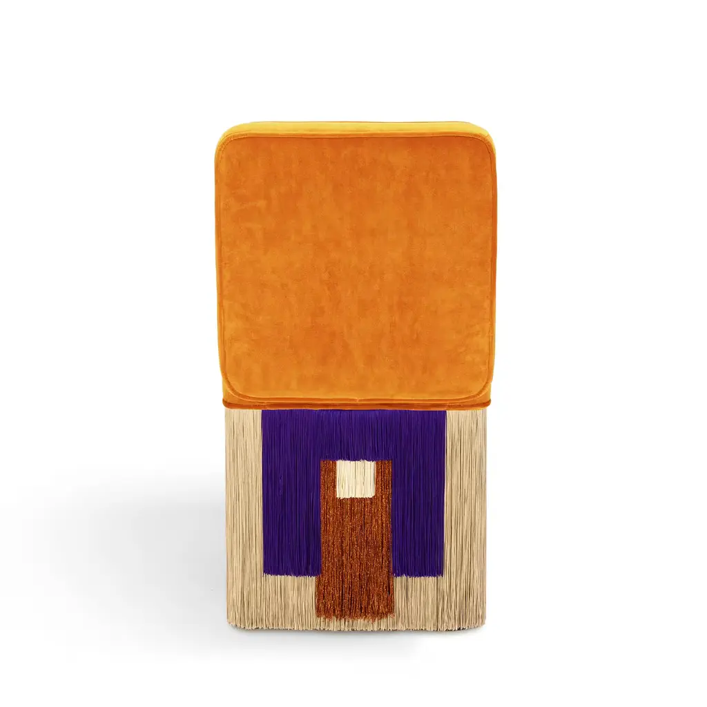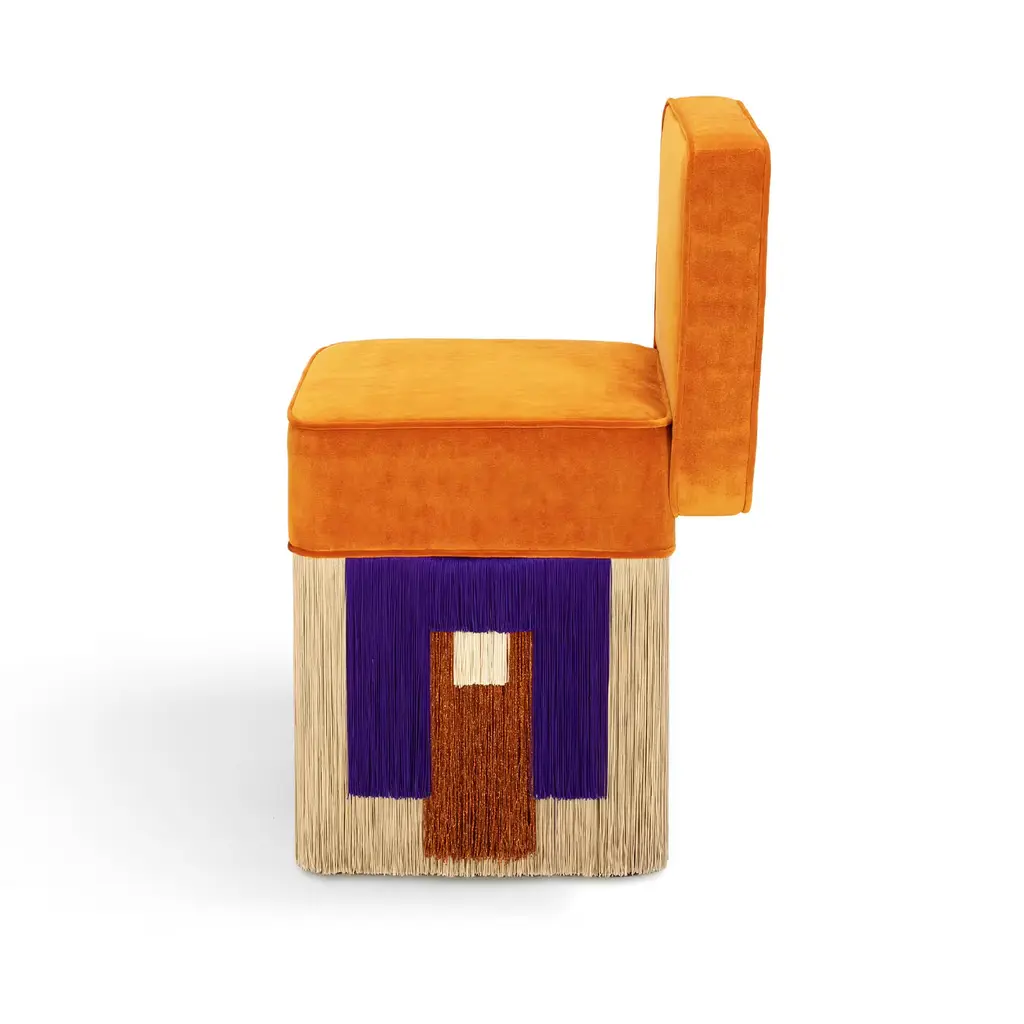 Blending comfort with bold elegance, the Lilli Cleo chair features vibrant orange velvet seating and geometric purple fringes highlighted with copper accents and ivory details. Designed for chic lounges and stylish living rooms, its compact form ensures adaptability and superior comfort. The Lilli chair promises to elevate interiors with minimalist elegance and functional charm, embodying Lorenza Bozzoli's design philosophy. Each bespoke piece is stamped on the bottom of the pouf’s lining and personally signed, numbered, and dated by designer.