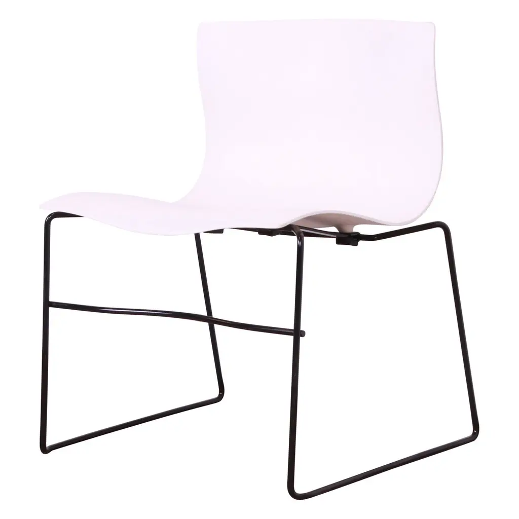Stackable lounge chair with upholstered seat and backrest and steel sled base in polished chrome finish. Optional: Parallel upholstery. Lineal is a collection of stackable side chairs, armchairs, bar and counter height stools with upholstered seats made from curved plywood and metal or wood bases. The elegance of its lines allows the piece to be integrated into any environment. The designs forms have been reduced to the minimum elements, highlighting its formal synthesis. Its full meaning and function are clearly reflected in its name: a line that extends from its backrest to the seat and balanced by the high precision metal or wood base.