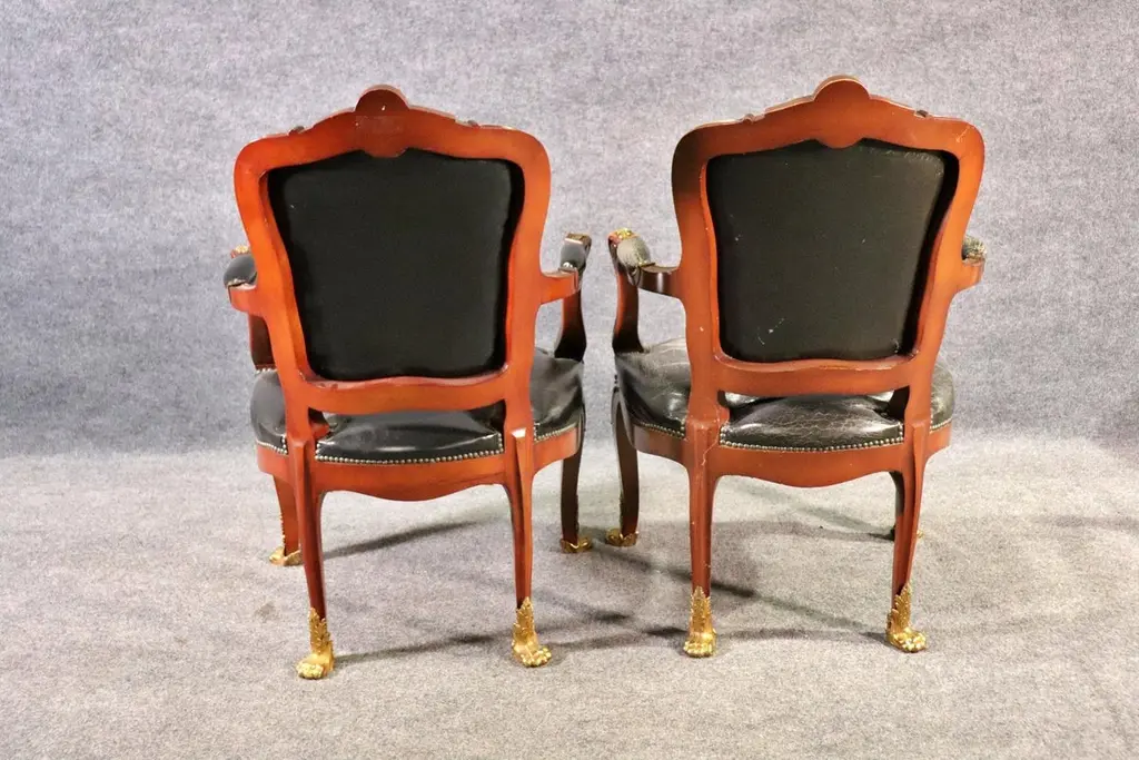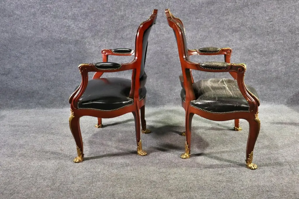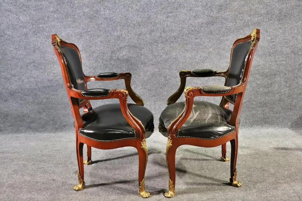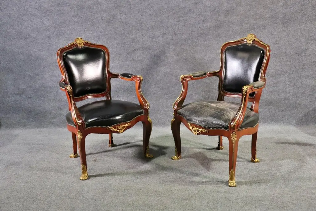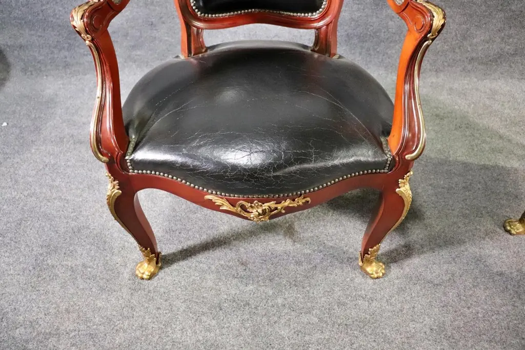 This superb pair of Linke style Louis XV arm chairs showcases the finest traditions of French craftsmanship, echoing the luxurious designs of the renowned Parisian ébéniste François Linke. Featuring hand-carved mahogany frames, these chairs are richly accented with finely cast gilt bronze (ormolu) mounts, highlighting the graceful cabriole legs, scrolling arms, and crested top rails. The black leather upholstery adds a bold yet timeless contrast, combining comfort with sophistication.The chairs’ proportions reflect the Louis XV style, celebrated for its balance of elegance and comfort. With serpentine lines, rococo ornamentation, and gilt embellishments, these armchairs are designed to command attention in any room, whether placed in a formal salon, refined office, or luxury library setting.Crafted in the spirit of François Linke—whose pieces defined Belle Époque opulence—this pair embodies exceptional detail and artistry. Perfect for collectors of fine French antiques or interior designers seeking statement seating, these chairs offer both functionality and investment value. Their refined silhouette and patinated gilt accents make them a versatile addition to both traditional and eclectic interiors.Bring the grandeur of 19th-century Parisian luxury furniture into your home with this outstanding pair of Linke-style Louis XV arm chairs.