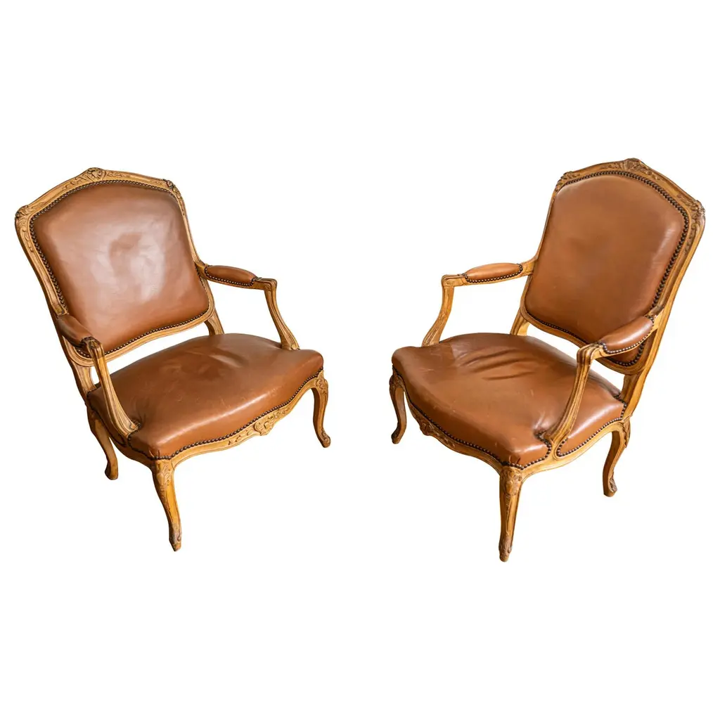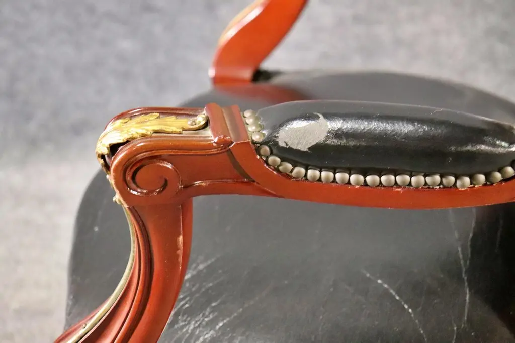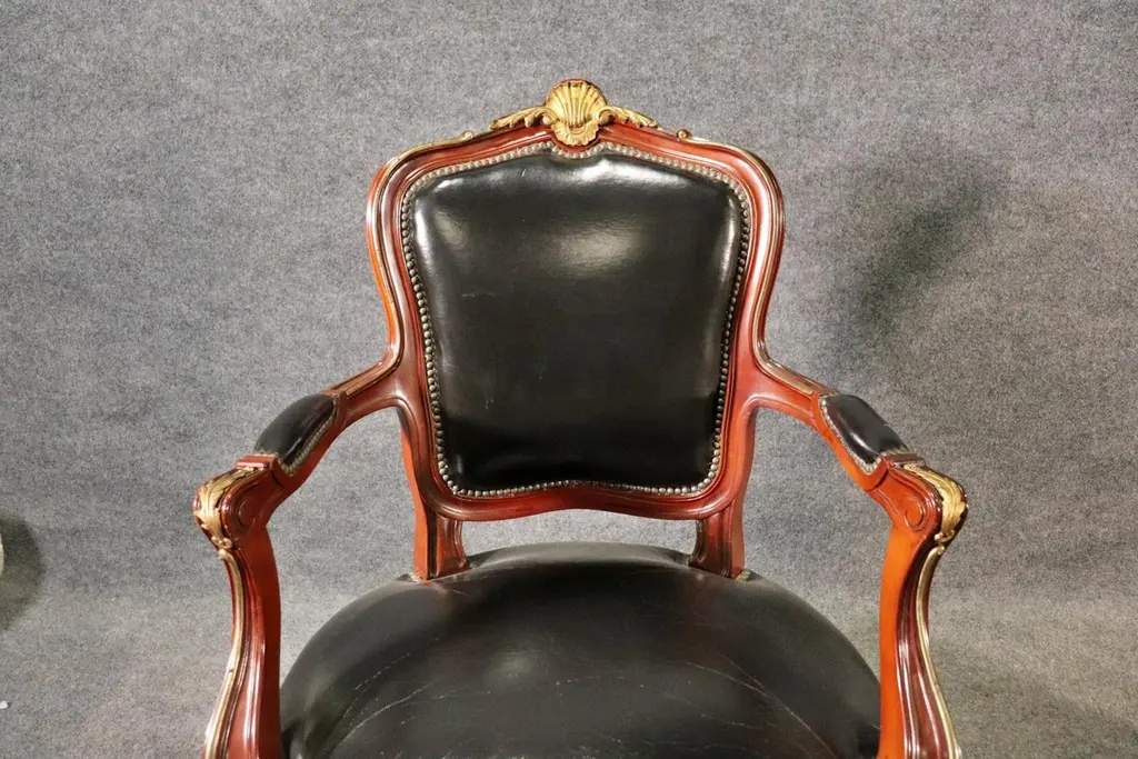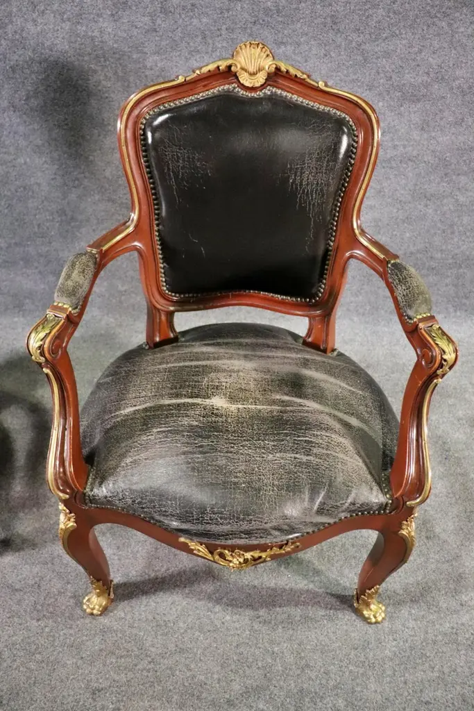 This superb pair of Linke style Louis XV arm chairs showcases the finest traditions of French craftsmanship, echoing the luxurious designs of the renowned Parisian ébéniste François Linke. Featuring hand-carved mahogany frames, these chairs are richly accented with finely cast gilt bronze (ormolu) mounts, highlighting the graceful cabriole legs, scrolling arms, and crested top rails. The black leather upholstery adds a bold yet timeless contrast, combining comfort with sophistication.The chairs’ proportions reflect the Louis XV style, celebrated for its balance of elegance and comfort. With serpentine lines, rococo ornamentation, and gilt embellishments, these armchairs are designed to command attention in any room, whether placed in a formal salon, refined office, or luxury library setting.Crafted in the spirit of François Linke—whose pieces defined Belle Époque opulence—this pair embodies exceptional detail and artistry. Perfect for collectors of fine French antiques or interior designers seeking statement seating, these chairs offer both functionality and investment value. Their refined silhouette and patinated gilt accents make them a versatile addition to both traditional and eclectic interiors.Bring the grandeur of 19th-century Parisian luxury furniture into your home with this outstanding pair of Linke-style Louis XV arm chairs.