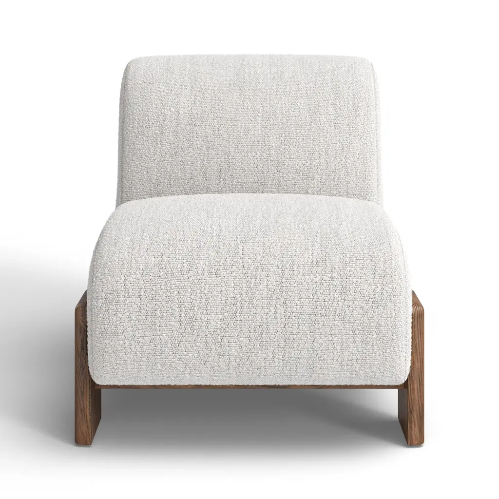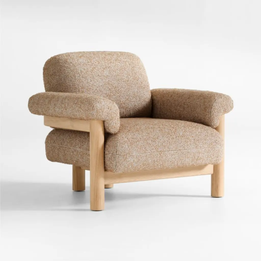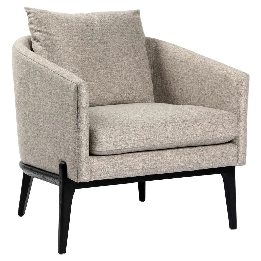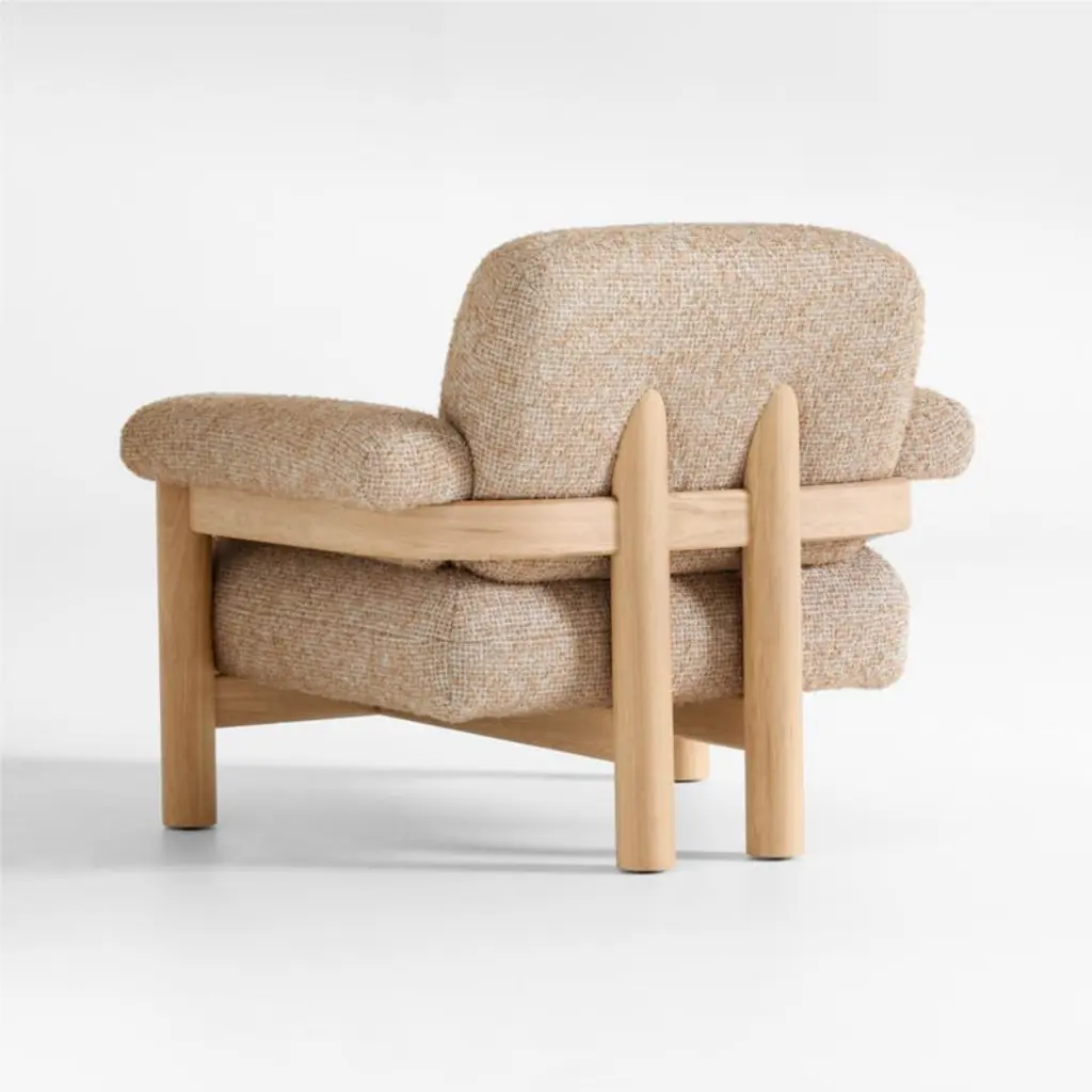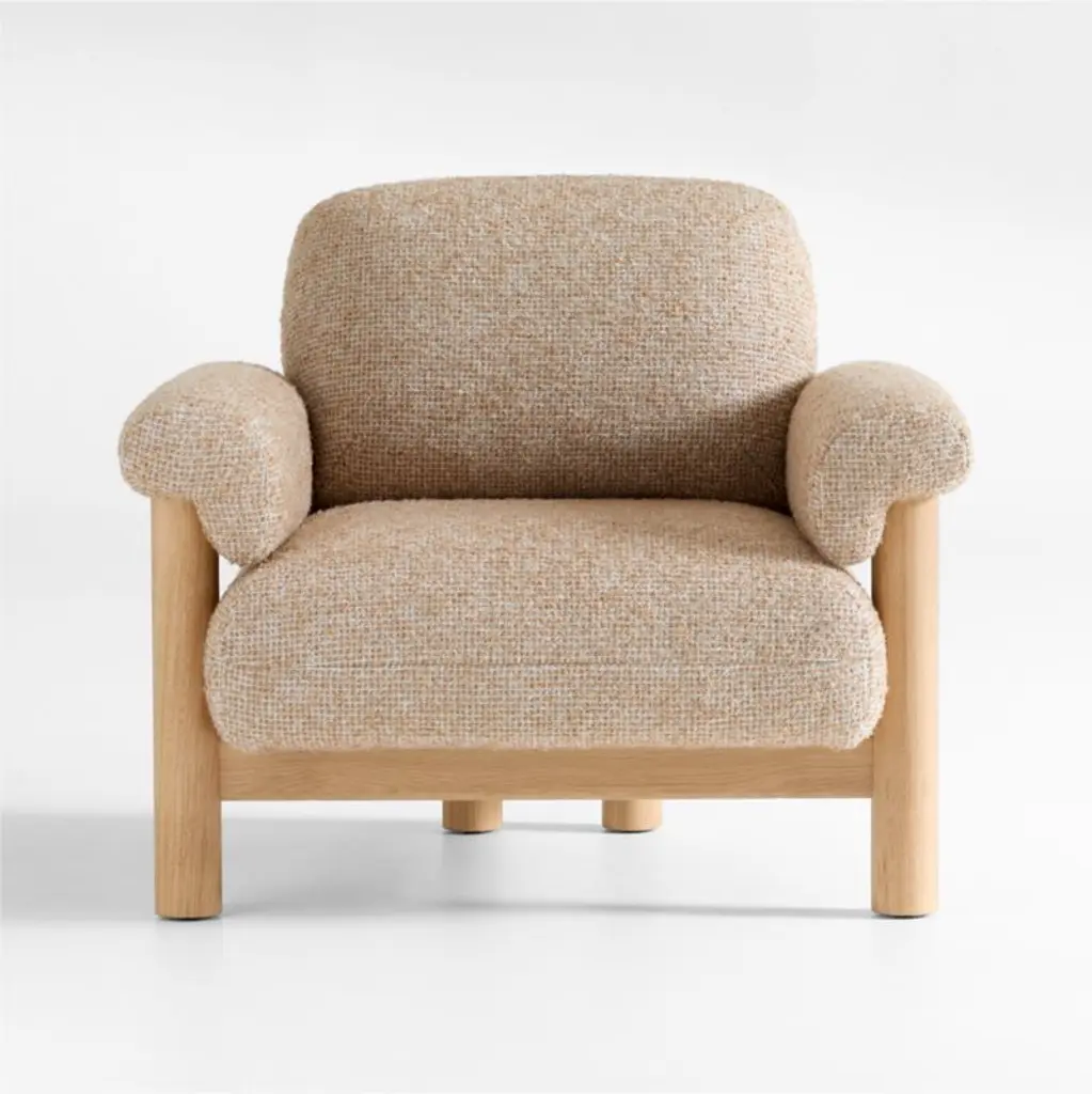 Luxuriate in the embrace of our Lisant accent chair. Expressing the essence of Brazilian modernist design, the chair indulges with plush, oversized forms. The bold solid oak frame wraps around the back, securing inset rear legs that anchor the chair's mold-breaking silhouette. Generously proportioned cushions spill over the armrest and extend beyond the frame to create a deep-seated, relaxing haven. The taupe fabric furnishes cozy texture and subtle pattern thanks to the captivating grid created by two-toned yarn.