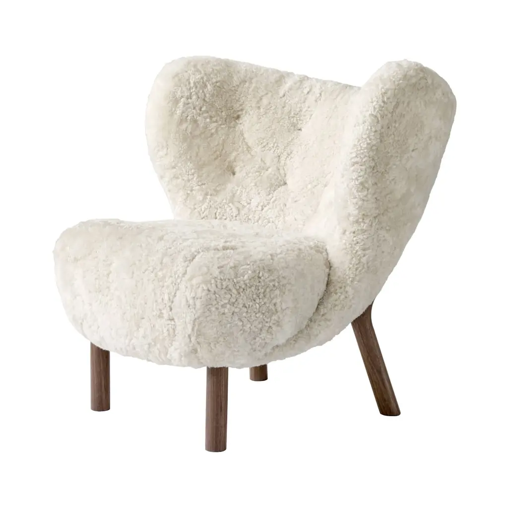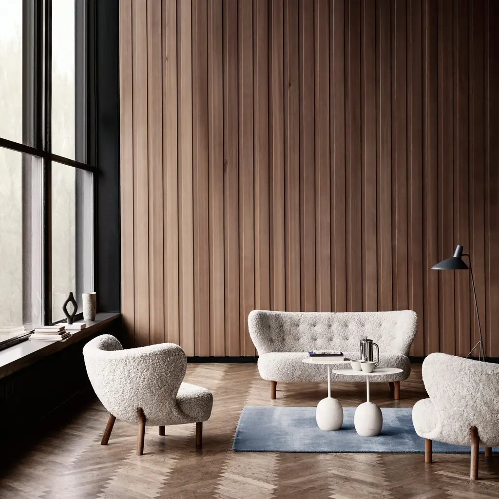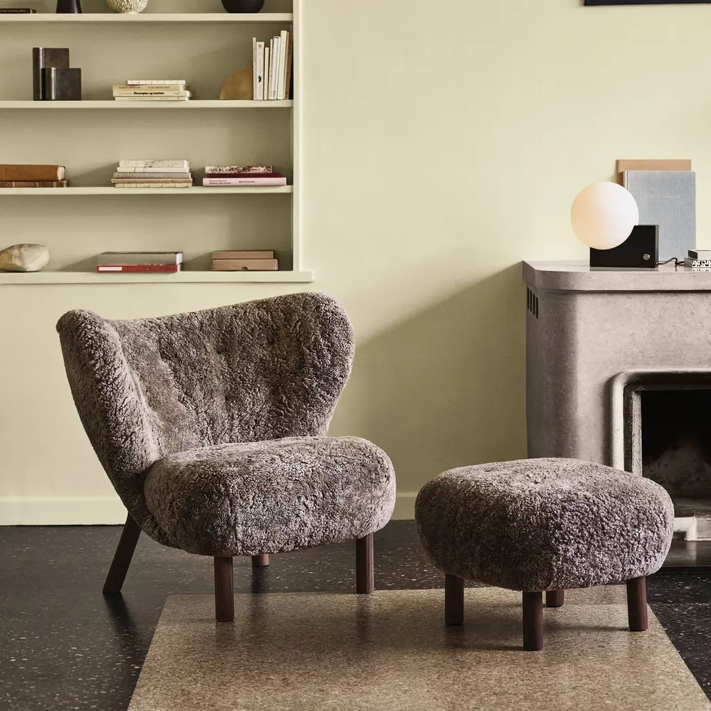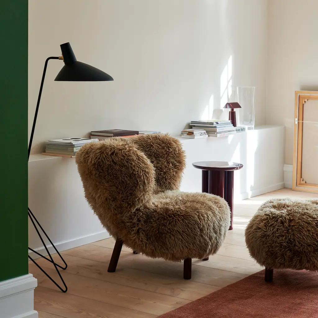 Long a “grail” for collectors, &Tradition reissues architect Viggo Boesen’s 1938 Little Petra. Though few of this coveted lounge chair were produced originally, the chair is a prime example of “funkis,” a Scandinavian take on functionalism and purpose in design. Wood legs in white oiled oak or walnut pair organically with luxe sheepskin or wool upholstery. Named after Viggo’s mother-in-law, Little Petra is smallish in scale but provides surprisingly roomy comfort, making it as perfect in a bedroom as salon. Pair it with the Little Petra ATD1 Pouf for added comfort.