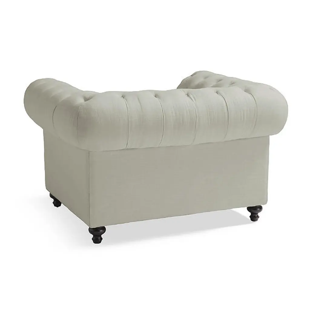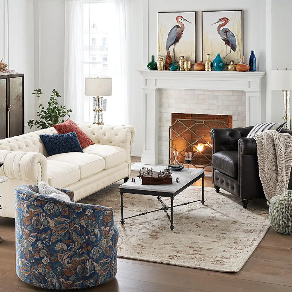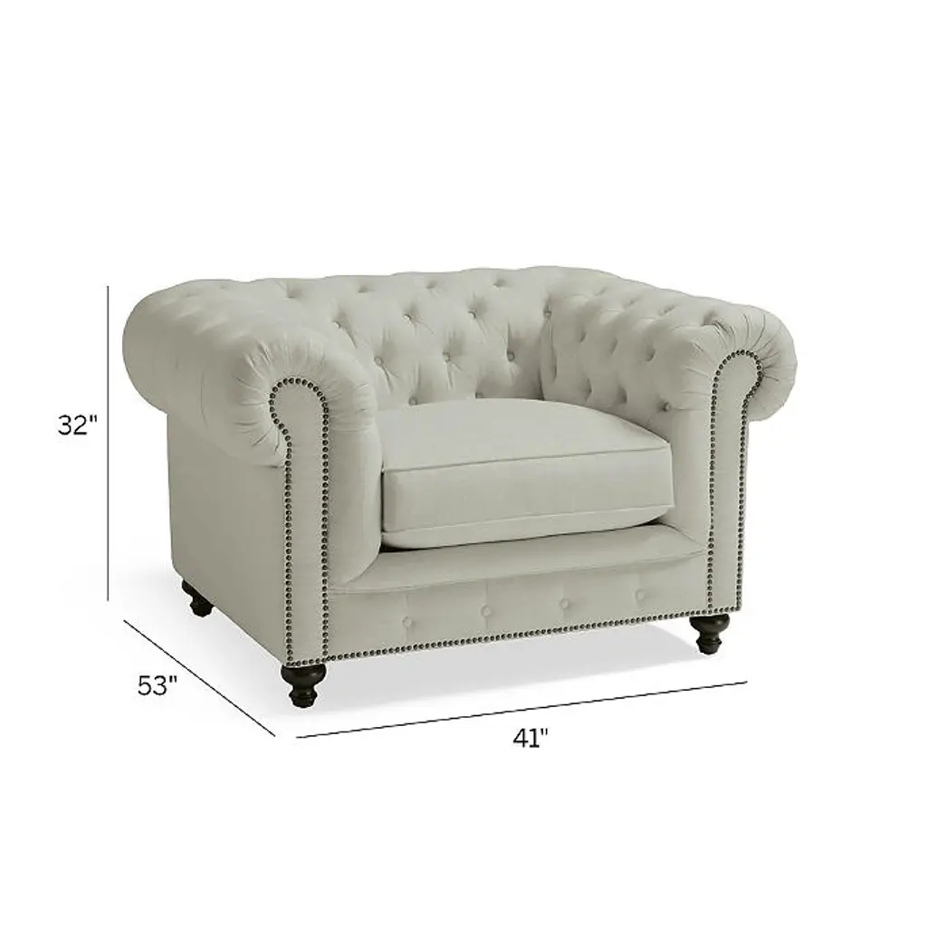 Dating back to the 18th century, the Chesterfield was once the mark of class and stature. Today, it's symbolic of great style. Inspired by this iconic British design, our Logan Chesterfield Lounge Chair features a button-tufted back with a low cushioned seat, rolled arms, hand-applied brass nailhead trim and characteristic equal-height arms and back. Premium Series Upholstery Collection Engineered hardwood frame Flexible fiberglass rod suspension provides durable, long-term and eco-friendly support that resists bending, warping and cracking Joints are double-doweled and corner-blocked for extra stability High-density foam cushions wrapped with feathers and down for maximum comfort Fabric cushions are reversible Includes one seat cushion Upholstered seat, back, arms and sides Velvet naturally ages over time, resulting in light marks or bruising that add to its character and sheen Performance fabric resists stains and repels water and oils, ensuring easy cleaning Leather is a natural material, retaining character marks and subtle shade variations; no two pieces are exactly alike Performance leather is treated to reduce scratching, fading, staining and color variation On leather option, velvet decking and cushion underside allow air to flow from the cushion through the decking Hand-applied brass nailhead trim accents on the roll of the arm and along the front rail Button-tufted back Maple wood turned feet with Film Noir finish Plastic nonmarring foot glides To prevent injuries or damage to item, recommended team lift (two or more people) for furniture placement Proudly handcrafted in the USA with imported materials, our frames and upholstery are made for life A Frontgate exclusive. At Frontgate, our primary focus is quality. We guarantee that every product we sell will stand up to the supreme test – our customers' satisfaction. To learn more about our policies, visit our Shipping & Processing, Returns & Exchanges and Warranty & Price Guarantee pages. Please note: Digital renderings of custom upholstery may differ in pattern placement from the actual item; colors can vary from screen to screen.