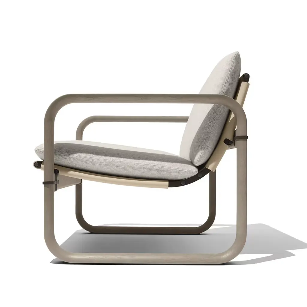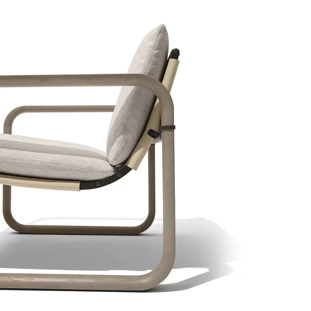 Loop outdoor lounge chair is born from the intersection of pure geometric shapes, refined by soft elements. The lounge chair is made of ash wood and aluminum, available in two heights. The wide cushions are covered with a removable waterproof cover.
