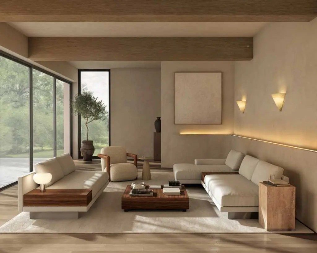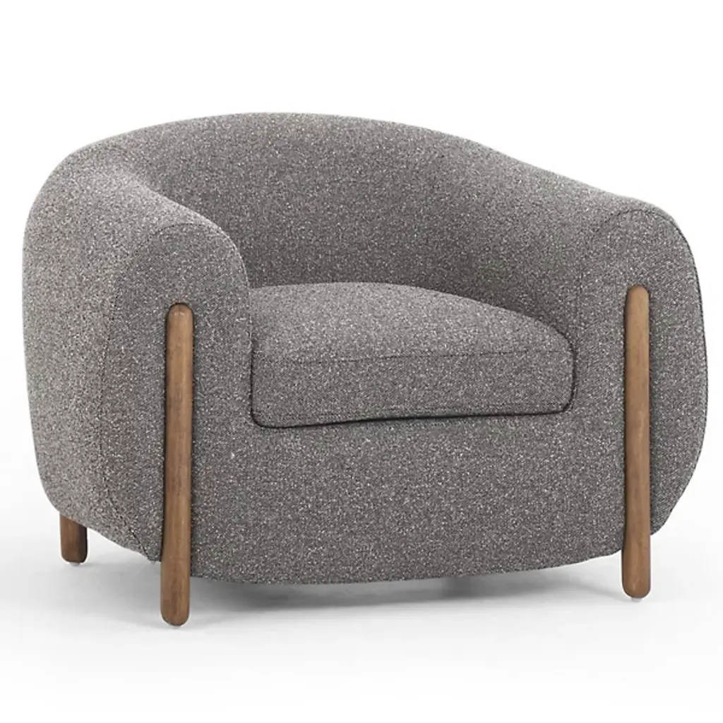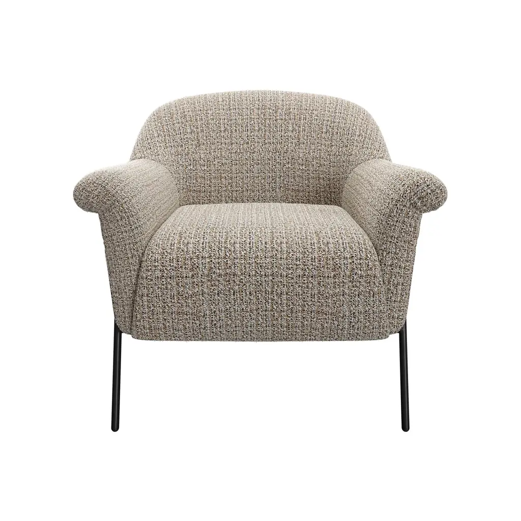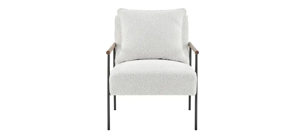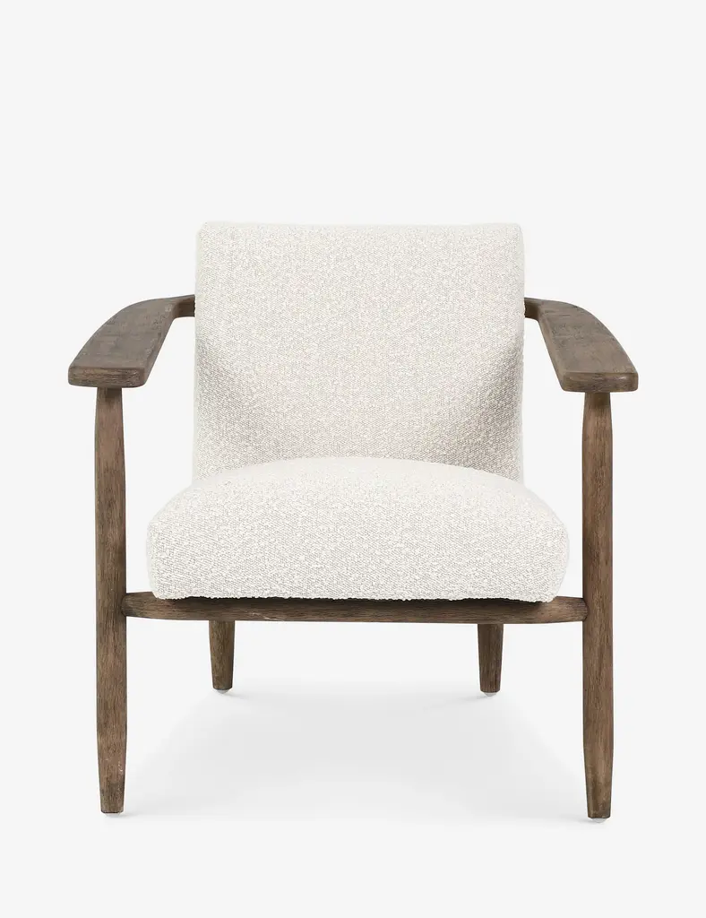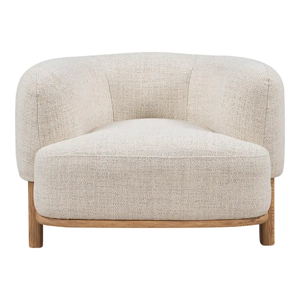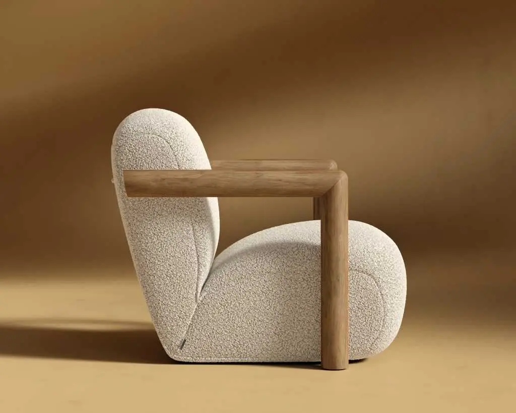 The Loreto Lounge Chair brings together sculptural form and everyday comfort. With its plush, textured upholstery and solid natural acacia arms, it offers a grounded yet inviting presence—perfect for relaxed living.