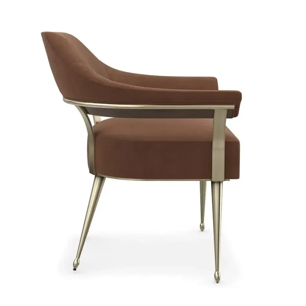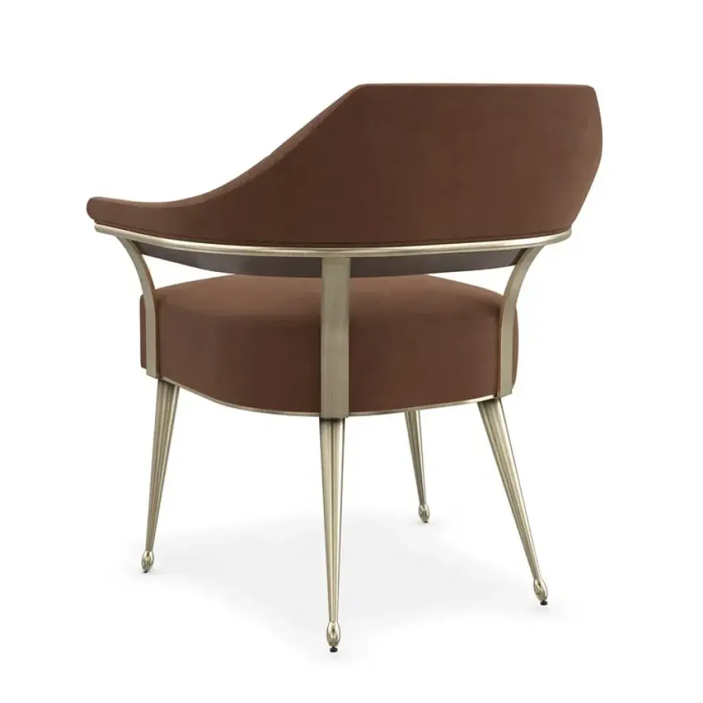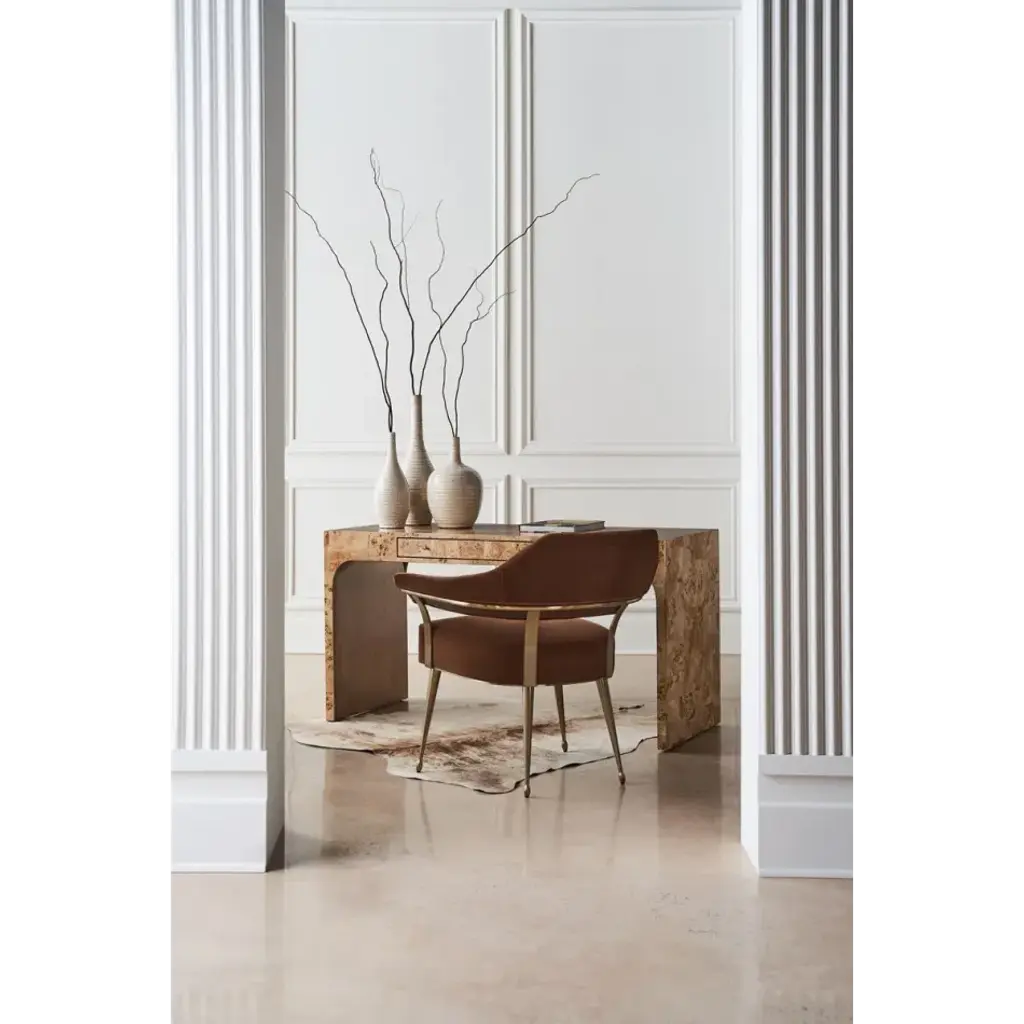 With an elegant silhouette inspired by a French antique, this accent chair is named after the proprietress of a little cafe tucked away in the famed flea market district of Paris, Saint-Ouen. Louisette adds classic warmth and a note of luxe with its slender frame in Champagne Gold and rust-colored mohair fabric with an exposed Galway Burl accent cinching the outside back.