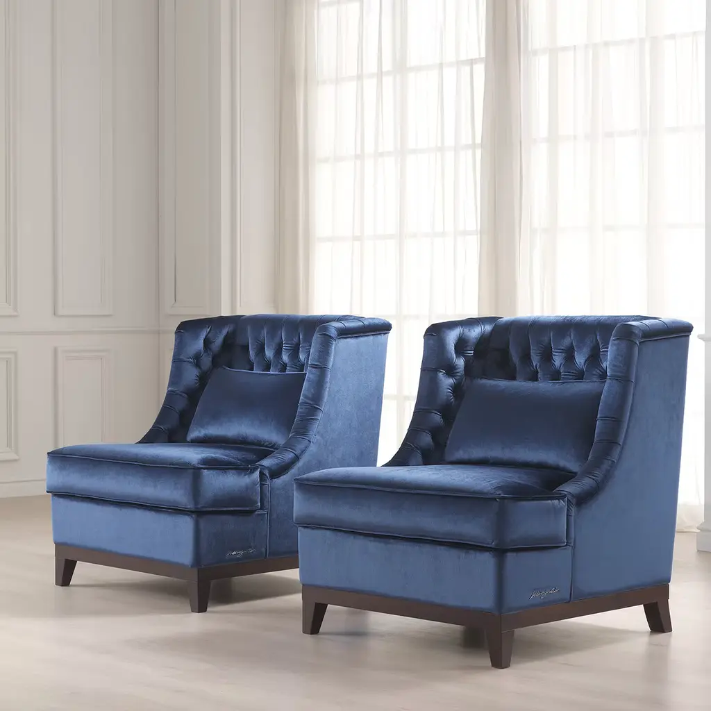 A sumptuous and lavish design from the Studio Interno Collection, this armchair will make for a stately accent to a refined interior decor. Crafted of solid wood, padded with polyurethane, it is upholstered with a fascinating and precious blue velvet, enriched with hand-tufted detailing. Please consult the Concierge for further information.