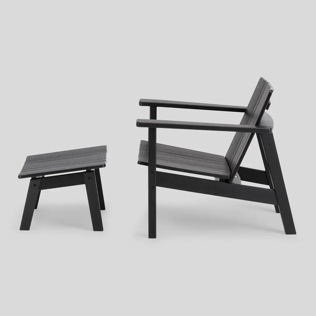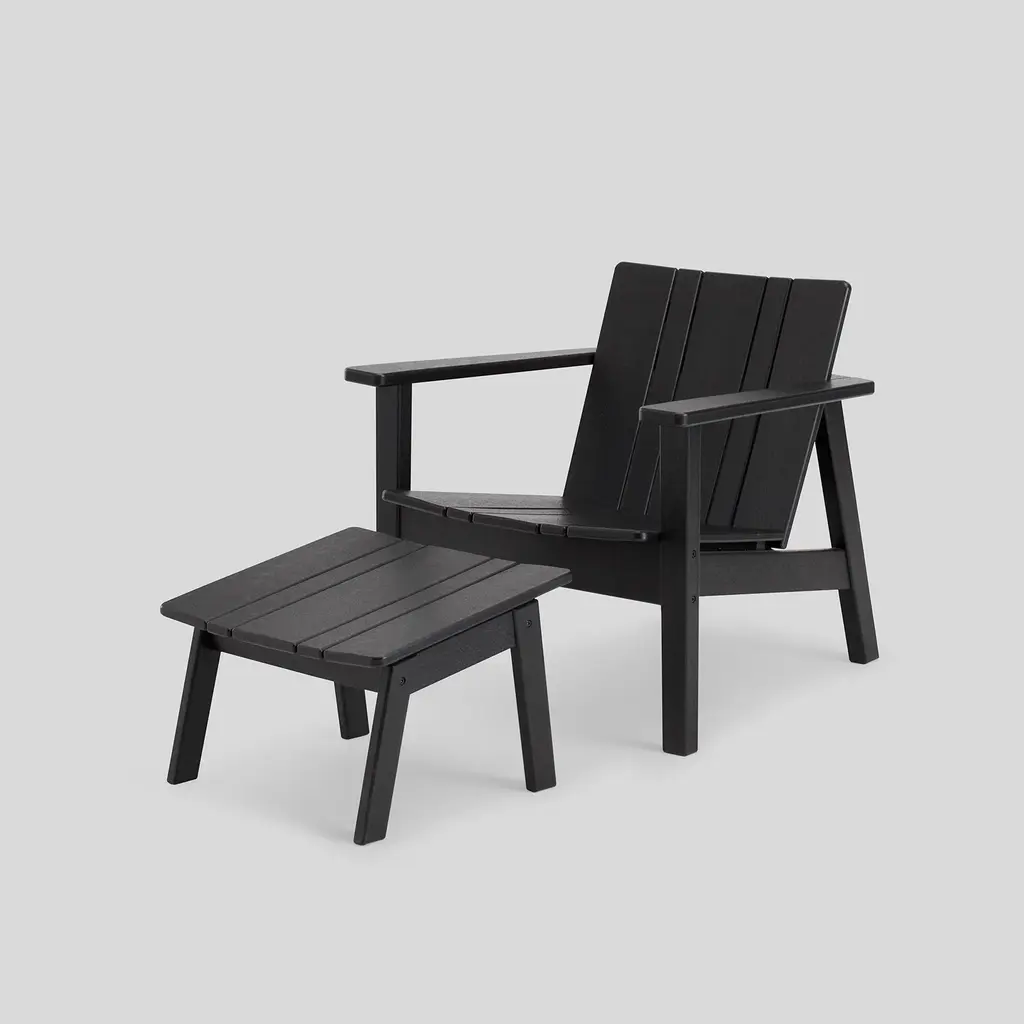 An everyday modern take on a classic Adirondack chair and ottoman. Made with recycled ocean and landfill-bound HDPE plastic by POLYWOOD. Sturdy and comfortable with a relaxed recline, curved back, and wide armrests. Also available in solid teak. Waterproof, fade-resistant and maintenance-free.