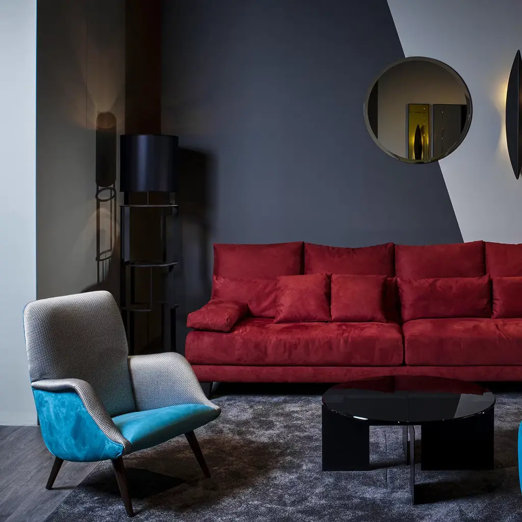 The arms and back of this sleek, cozy armchair are covered in herringbone fabric which stands in contrast to its bright turquoise seat, for an effect that is classic, bold and modern. Its wooden legs have a dark walnut finish. The Chelini Firenze Collection brings together traditional Made-in-Italy craftsmanship with a contemporary design.