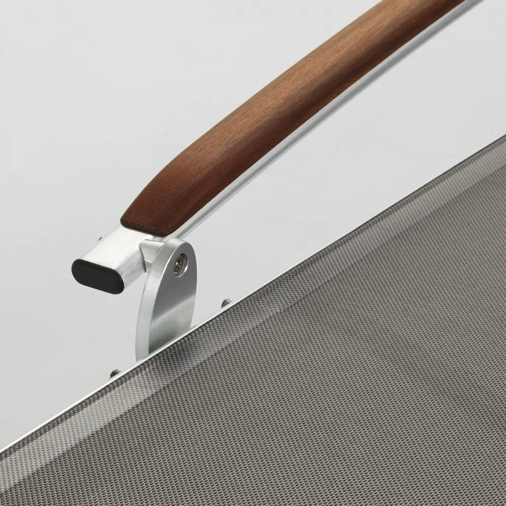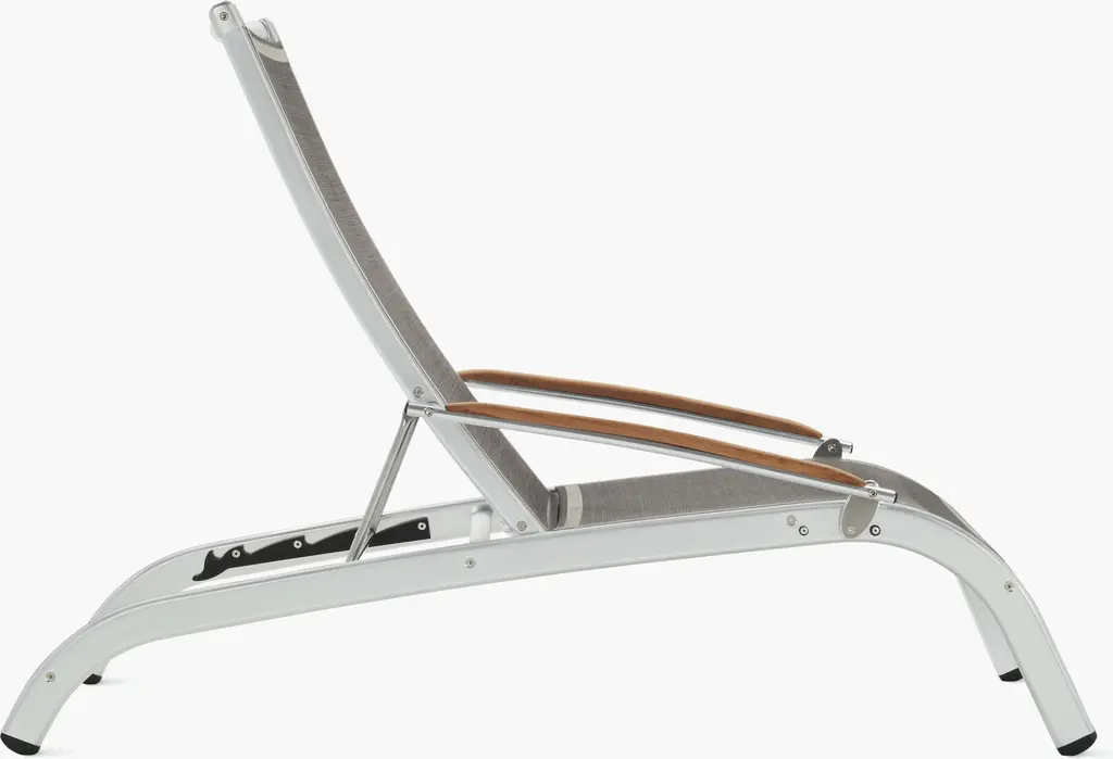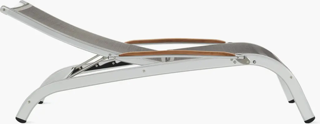Designed with luxury hotels and cruise ships in mind, the Lucca Outdoor Collection (2003) features durable anodized aluminum frames and mesh seats constructed of Textilene, an innovative mold- and UV-resistant fabric that permits air circulation. The Lucca Lounge Chair features a five-stage adjustable high back that nicely supports your head and shoulders, plus gently sloped teak arms that adjust with each angle of recline. Suitable for residential and commercial use. Made in Spain.