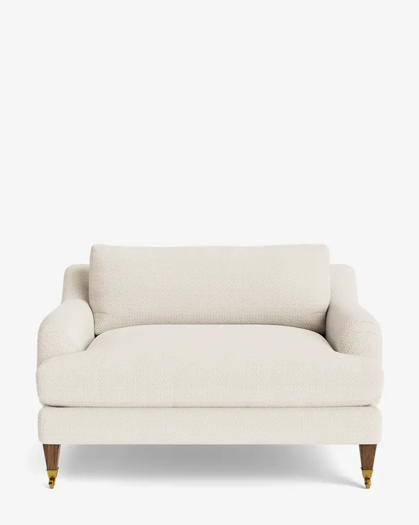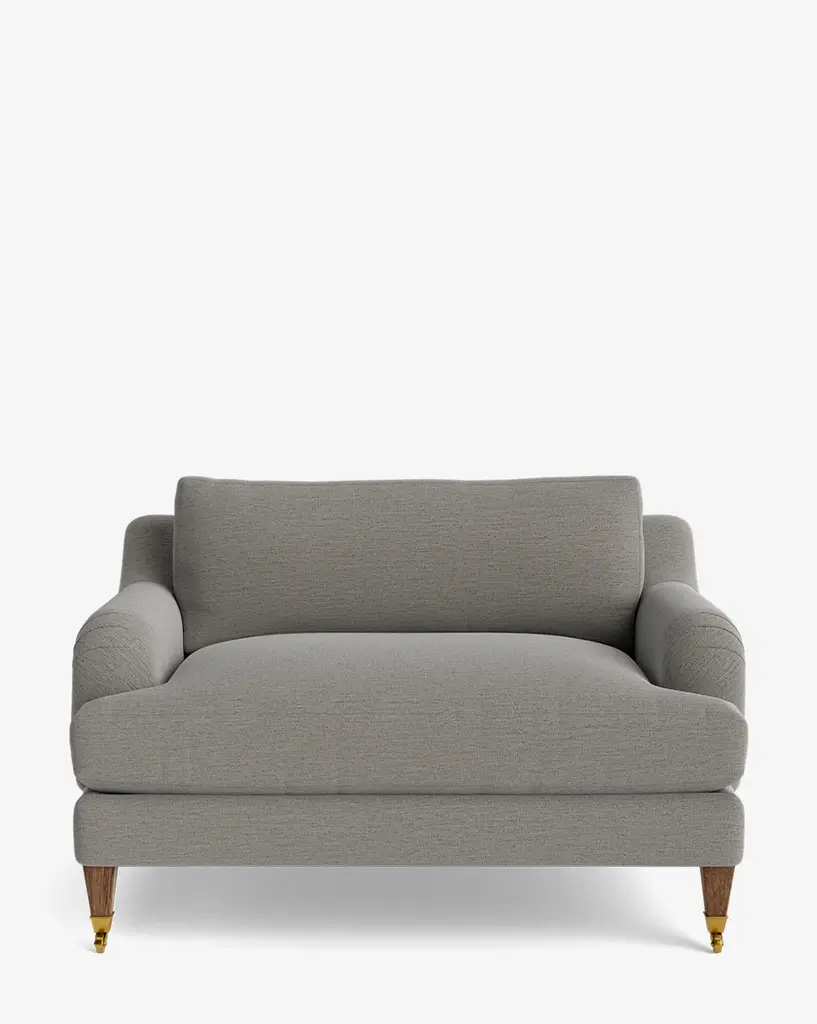 Our Lucille English Roll Arm Chair and a Half is a modern approach to a traditional design. Crafted with luxurious comfort in mind, its classic format features a down wrapped cushion for a perfectly stuffed look and feel. A bench-made alder wood frame adds durability to the design, as four oak wood tapered legs give this chair the ability to move around with ease. Completely customizable in a wide array of fabrics, make the chair your own with either a soft linen, or high performance crypton.