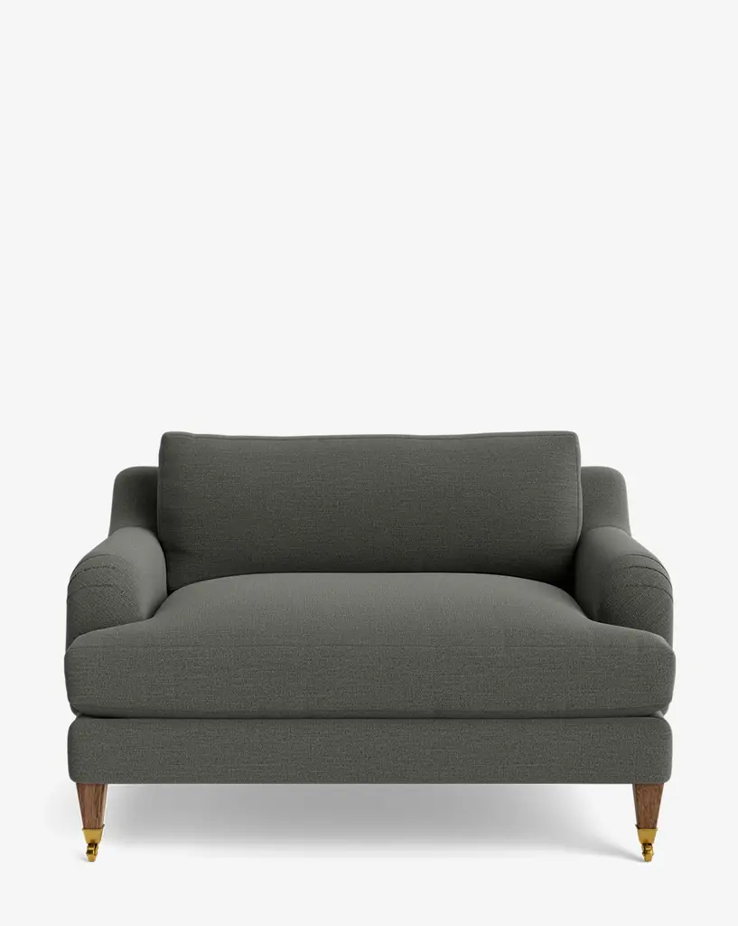 Our Lucille English Roll Arm Chair and a Half is a modern approach to a traditional design. Crafted with luxurious comfort in mind, its classic format features a down wrapped cushion for a perfectly stuffed look and feel. A bench-made alder wood frame adds durability to the design, as four oak wood tapered legs give this chair the ability to move around with ease. Completely customizable in a wide array of fabrics, make the chair your own with either a soft linen, or high performance crypton.