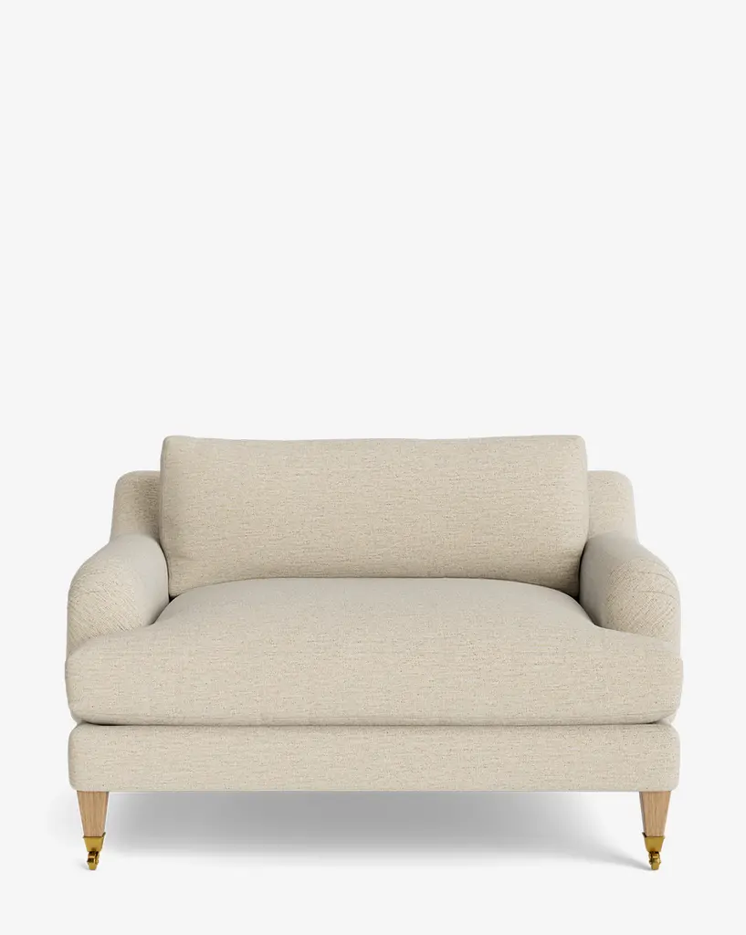 Our Lucille English Roll Arm Chair and a Half is a modern approach to a traditional design. Crafted with luxurious comfort in mind, its classic format features a down wrapped cushion for a perfectly stuffed look and feel. A bench-made alder wood frame adds durability to the design, as four oak wood tapered legs give this chair the ability to move around with ease. Completely customizable in a wide array of fabrics, make the chair your own with either a soft linen, or high performance crypton.