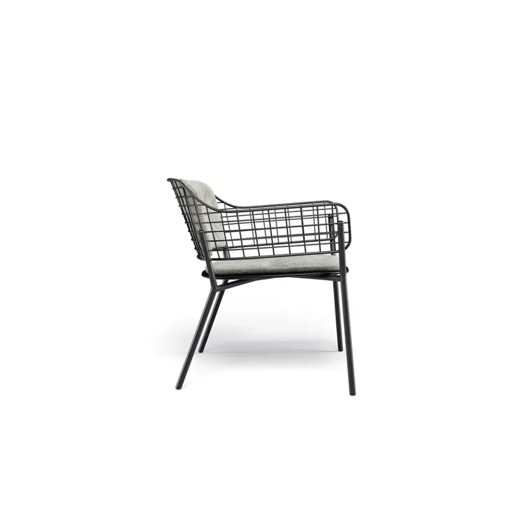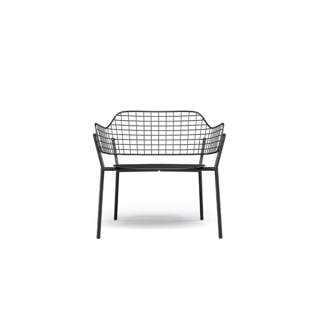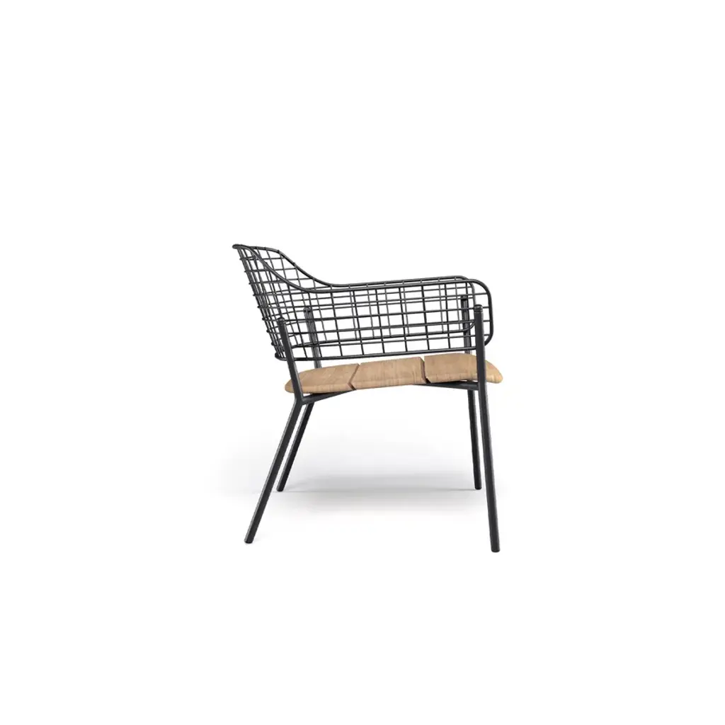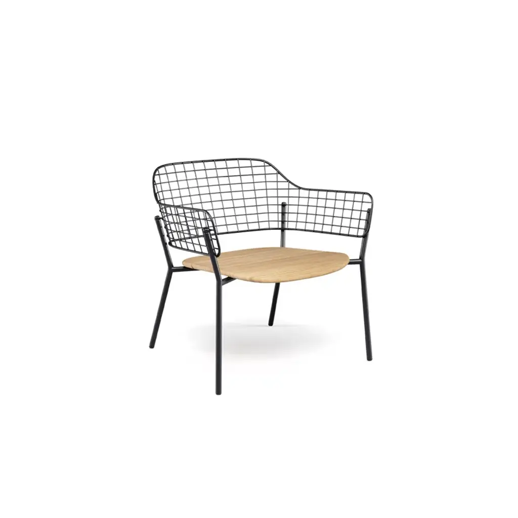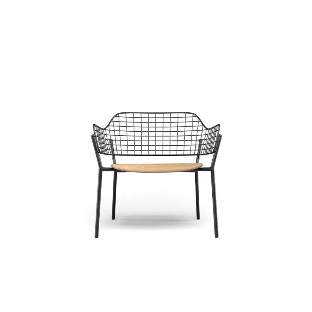 Lyze is a garden easy chair made of aluminium and steel. Available version with teak seat.A light touch and a novel combination of shapes provide the inspiration for Lyze by Florent Coirier, a collection that teams aluminium with steel. The framework of the chairs, in extruded aluminium, is combined with a seat in die-cast aluminium and a backrest formed by a pattern of stainless steel circles. The frame and the backrest are fixed mechanically, using screws, to allow for the creation of numerous colour combinations between the seat and the backrest. The coffee table, with aluminium structure and fibre-cement top, completes the collection. Colours: Black frame-black backrest; black frame-stainless steel backrest; white frame-white backrest; white frame-taupe backrest; red frame-red backrest; grey-green frame-stainless steel backrest; green frame-white backrest.