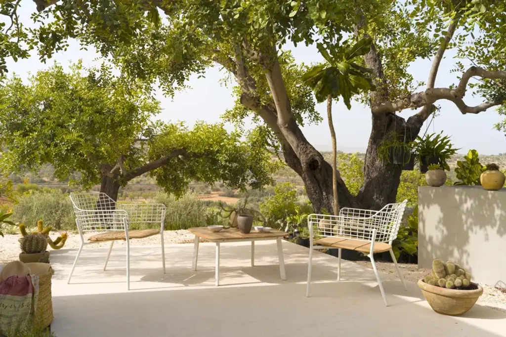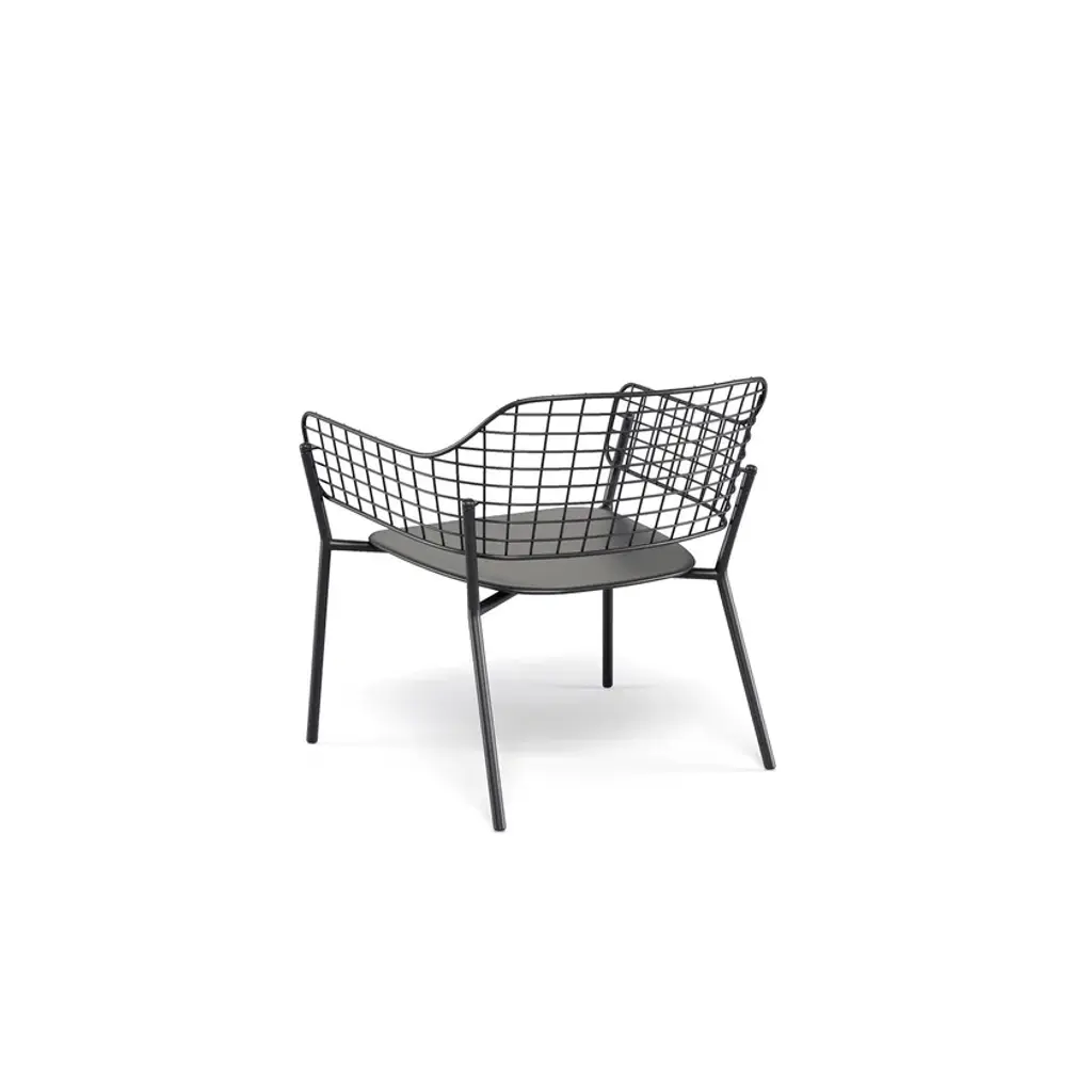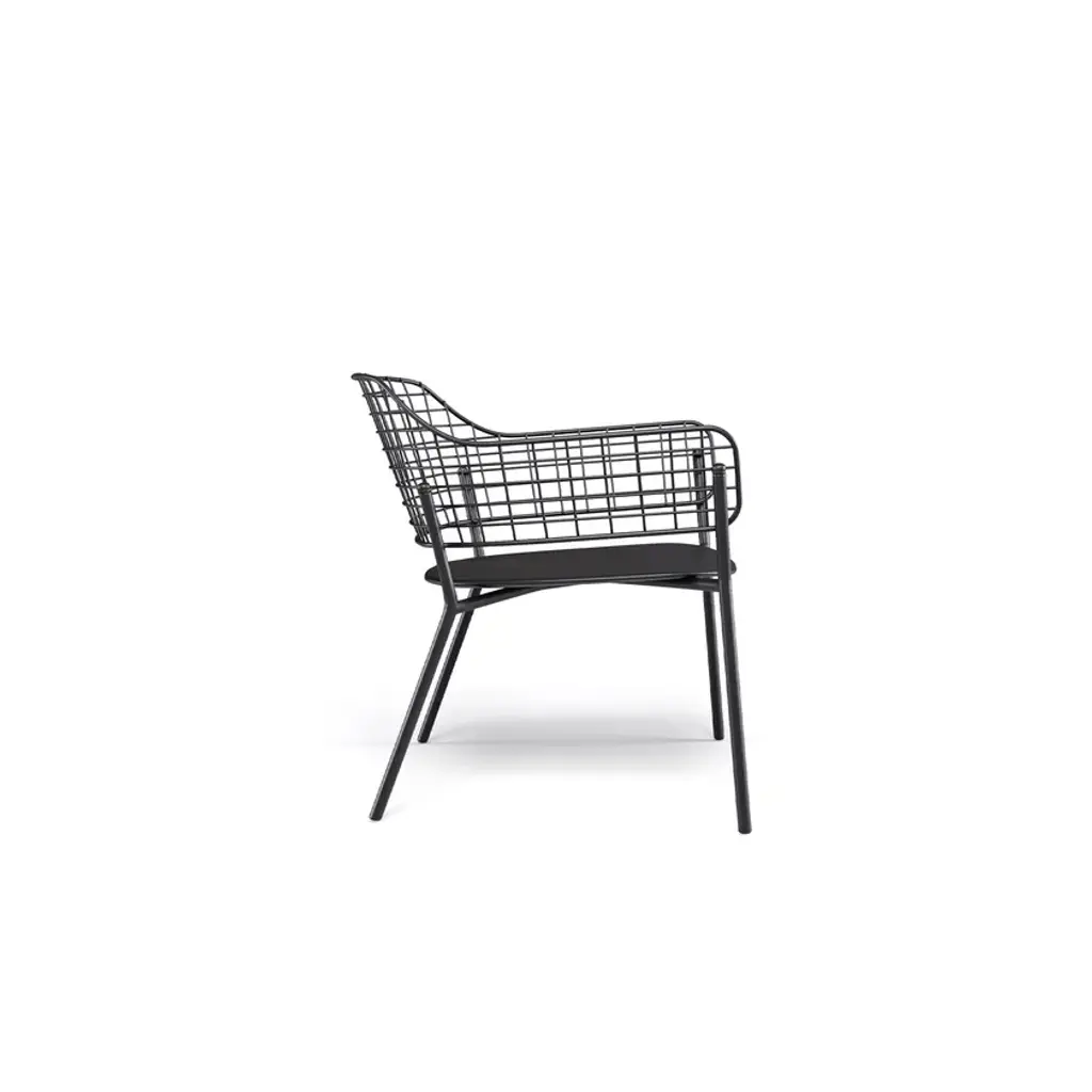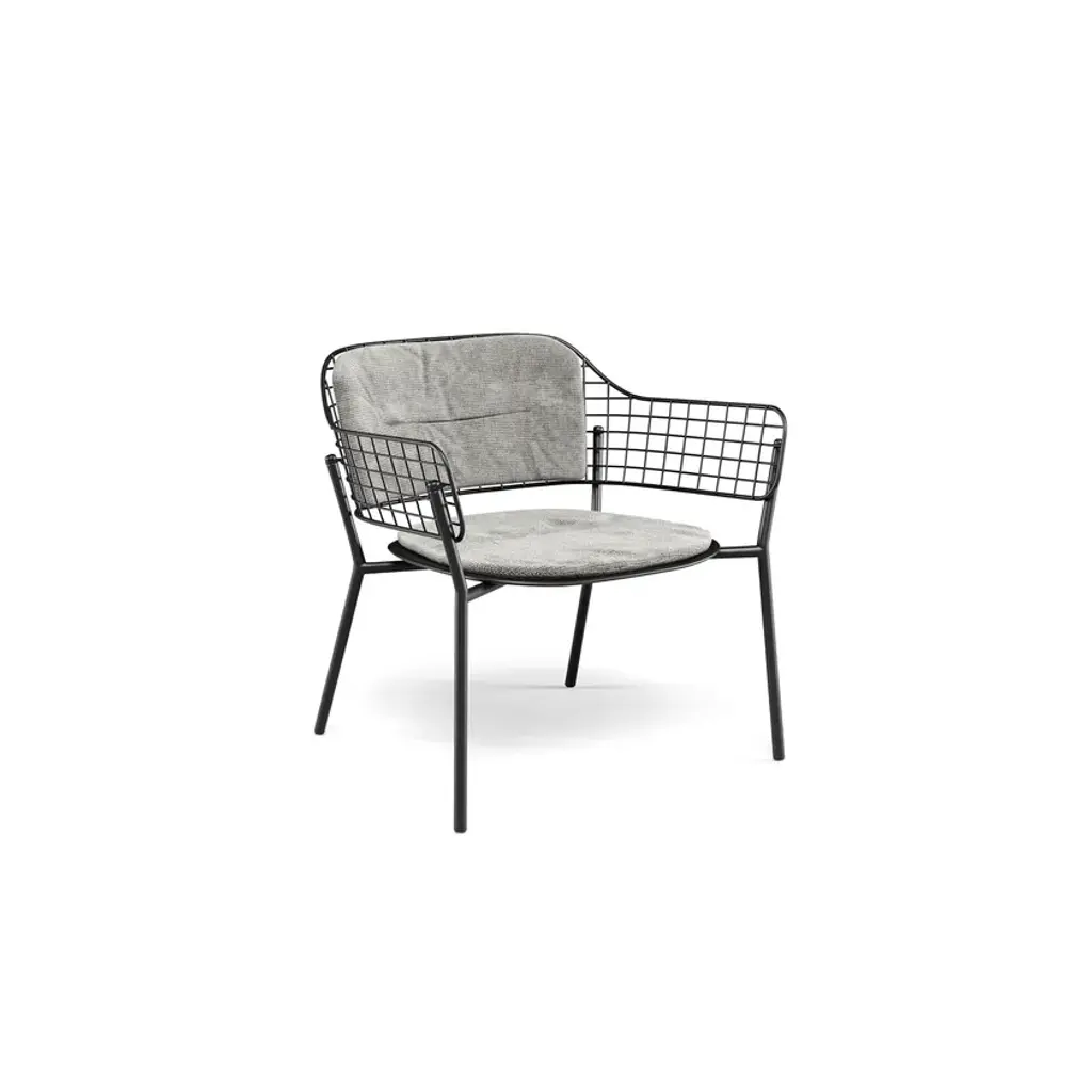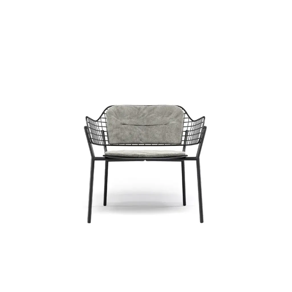 Lyze is a garden easy chair made of aluminium and steel. Available version with teak seat.A light touch and a novel combination of shapes provide the inspiration for Lyze by Florent Coirier, a collection that teams aluminium with steel. The framework of the chairs, in extruded aluminium, is combined with a seat in die-cast aluminium and a backrest formed by a pattern of stainless steel circles. The frame and the backrest are fixed mechanically, using screws, to allow for the creation of numerous colour combinations between the seat and the backrest. The coffee table, with aluminium structure and fibre-cement top, completes the collection. Colours: Black frame-black backrest; black frame-stainless steel backrest; white frame-white backrest; white frame-taupe backrest; red frame-red backrest; grey-green frame-stainless steel backrest; green frame-white backrest.