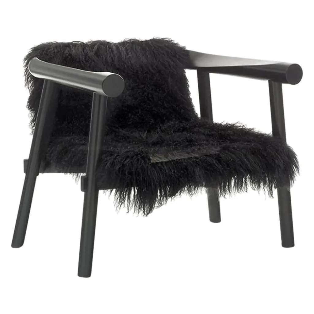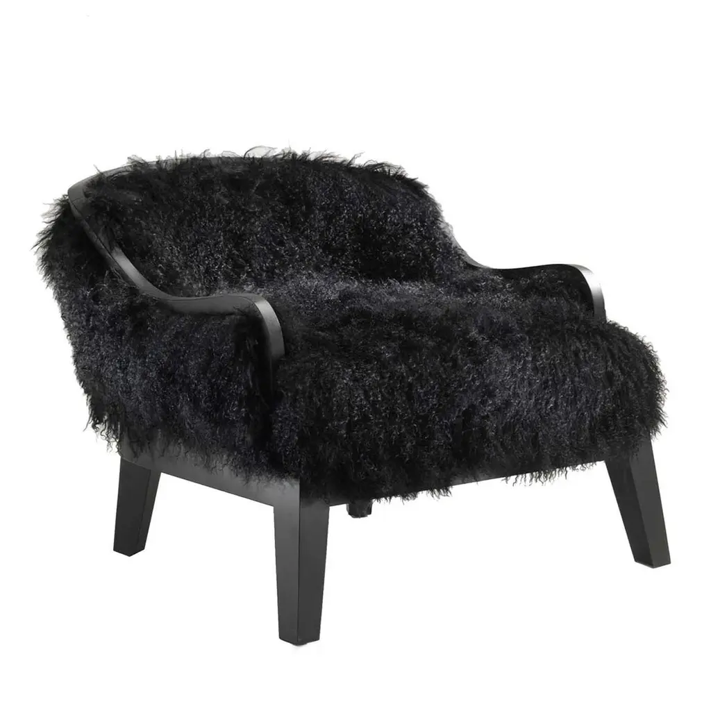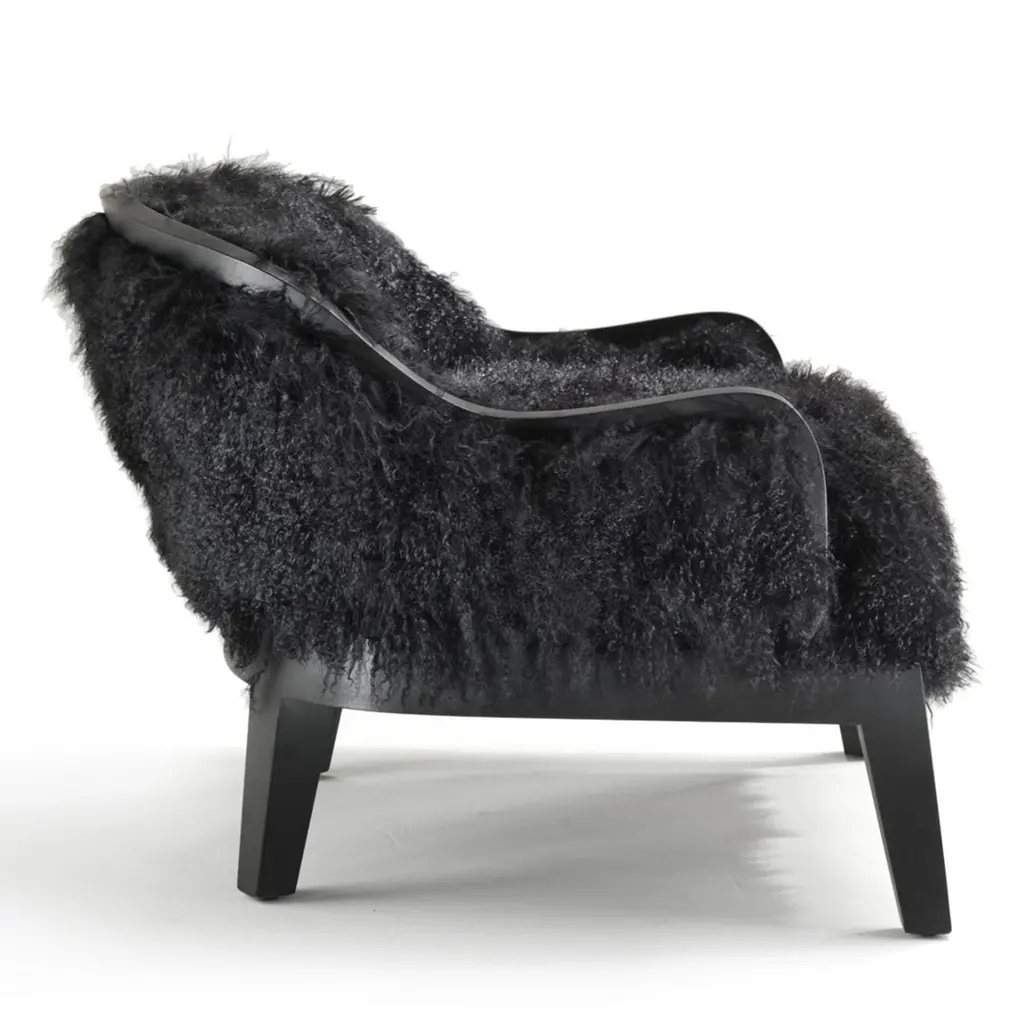 This playful and modern object of functional decor is a cozy piece to add to a private study or bedroom, where it will invite relaxation and be an eye-catching accent piece. With its reclined backrest and plush lambskin upholstery, this armchair is the ultimate lounge companion. Its structure is in wood with a striking black oak finish that matches the color of the lambskin for a unique textural contrast.