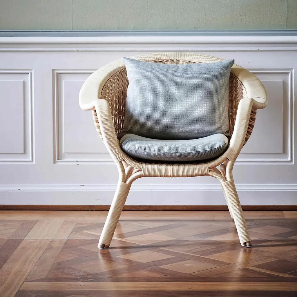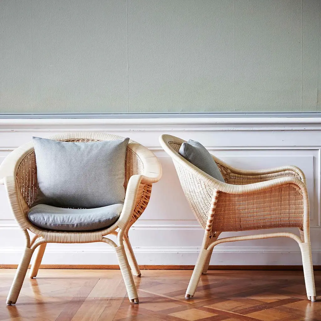 Madame was designed by Nanna and Jørgen Ditzel in 1951. The chair is handwoven in Indonesian sustainable rattan. The chair is made in the colour natural, which is original and suitable for every occasion. The seat and back are handwoven on a frame of rattan by skilled wicker workers. Nanna Ditzels beautiful rattanchair has armrests and and a comfortable backrest. This chair fits into a home where there is space and where the chair will add an element of nature and elegance. The chair is beautiful, comfortable and suitable for private use in the living room or in a cottage