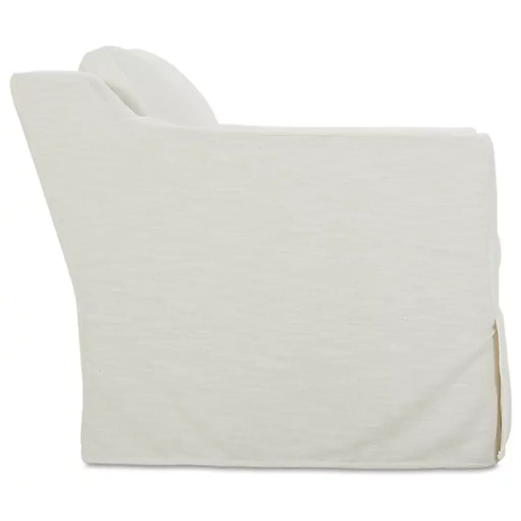 The Madeline Slipcovered Stationary Chair from Rowe Furniture offers contemporary style and comfort. Crafted in the USA, its frame is made from kiln-dried 7-ply hardwood for lasting durability. The flippable cloud cushion, composed of high-density foam, enhances support and comfort. A removable slipcover allows for easy machine washing, ensuring convenient maintenance. Designed for both style and practicality, this chair provides a versatile seating option that complements various interior spaces.