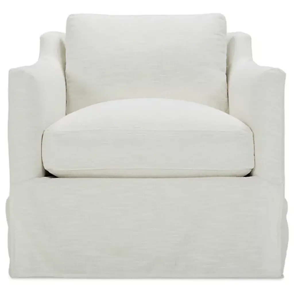 The Madeline Slipcovered Stationary Chair from Rowe Furniture offers contemporary style and comfort. Crafted in the USA, its frame is made from kiln-dried 7-ply hardwood for lasting durability. The flippable cloud cushion, composed of high-density foam, enhances support and comfort. A removable slipcover allows for easy machine washing, ensuring convenient maintenance. Designed for both style and practicality, this chair provides a versatile seating option that complements various interior spaces.