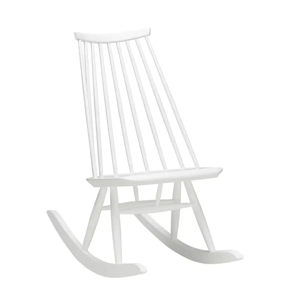 The Mademoiselle Rocking Chair is made from solid birch and was specifically developed for the home. Crafted using an age-old construction method, the spoke back contrasts strikingly with the smooth modernist curves of the seat’s softly rounded edge. In creating the Mademoiselle, designer Ilmari Tapiovaara drew inspiration from traditional Finnish chairs, then applied his own modern design approach. Also available as a lounge chair.Legs, seat and backSolid birchMademoiselle Rocking Chair is available in black or white.