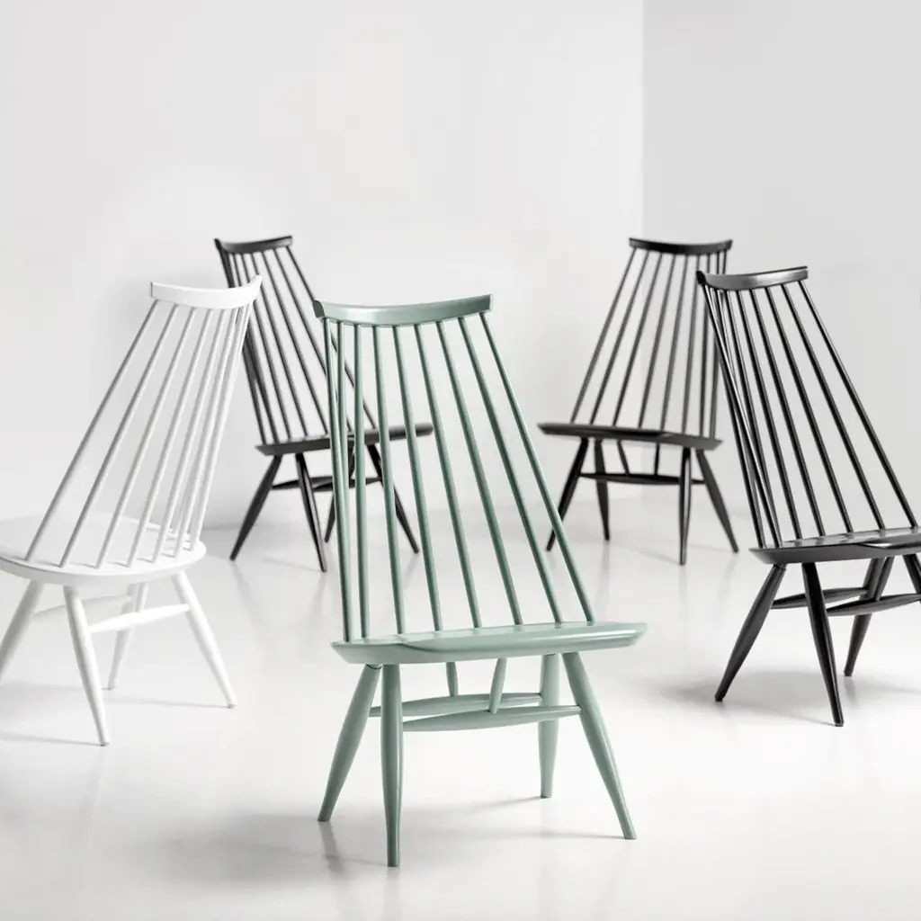 The Mademoiselle Lounge Chair is made from solid birch and was specifically developed for the home. Crafted using an age-old construction method, the spoke back contrasts strikingly with the smooth modernist curves of the seat's softly rounded edge. In creating the Mademoiselle, designer Ilmari Tapiovaara drew inspiration from traditional Finnish chairs, then applied his own modern design approach. Also available as a rocking chair.