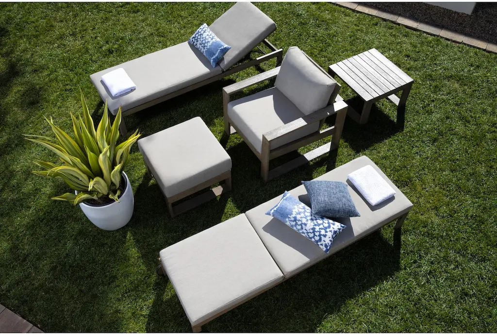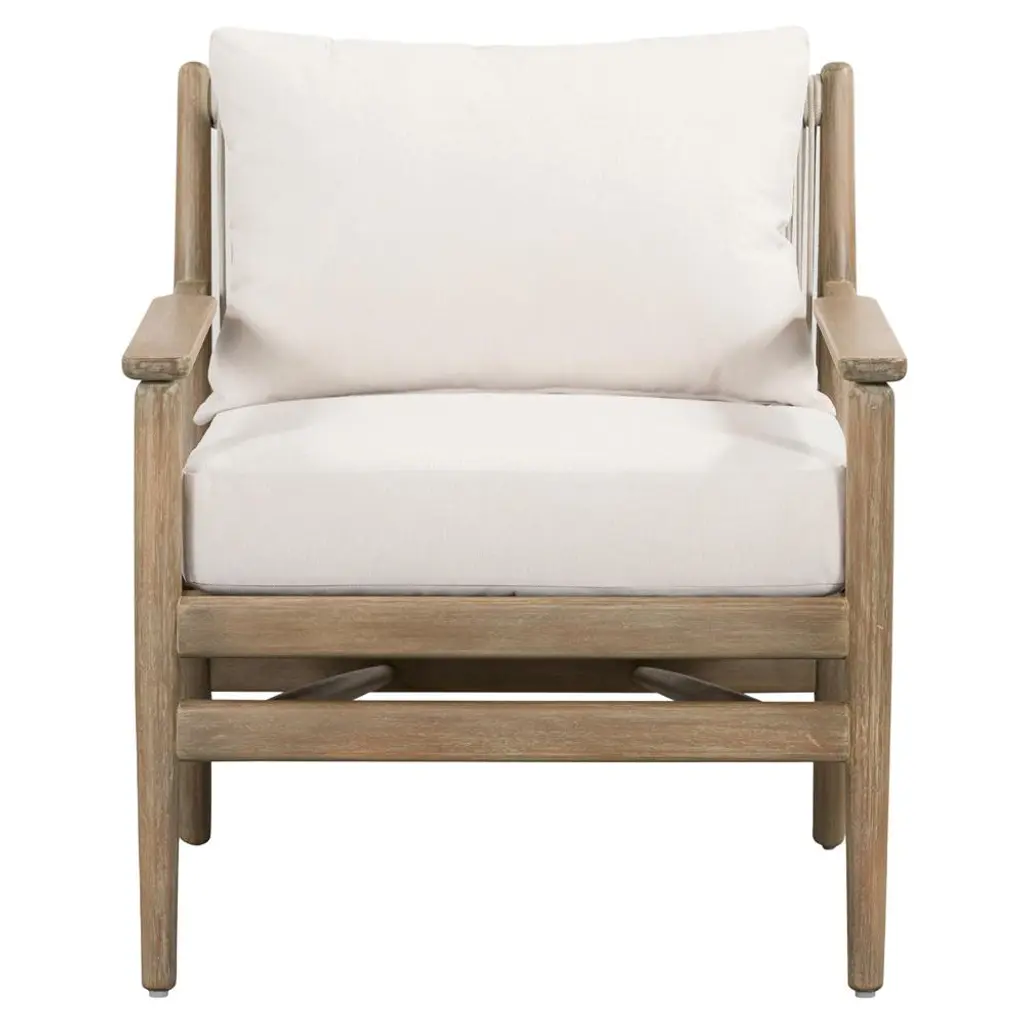 The Malaga Beige Wood Outdoor Lounge Chair combines modern design with ultimate comfort. This chair features a distressed grey finish and is made from eucalyptus wood, providing both durability and style for your outdoor space. The loose, reversible back cushions and foam seat cushions ensure you can relax in comfort.