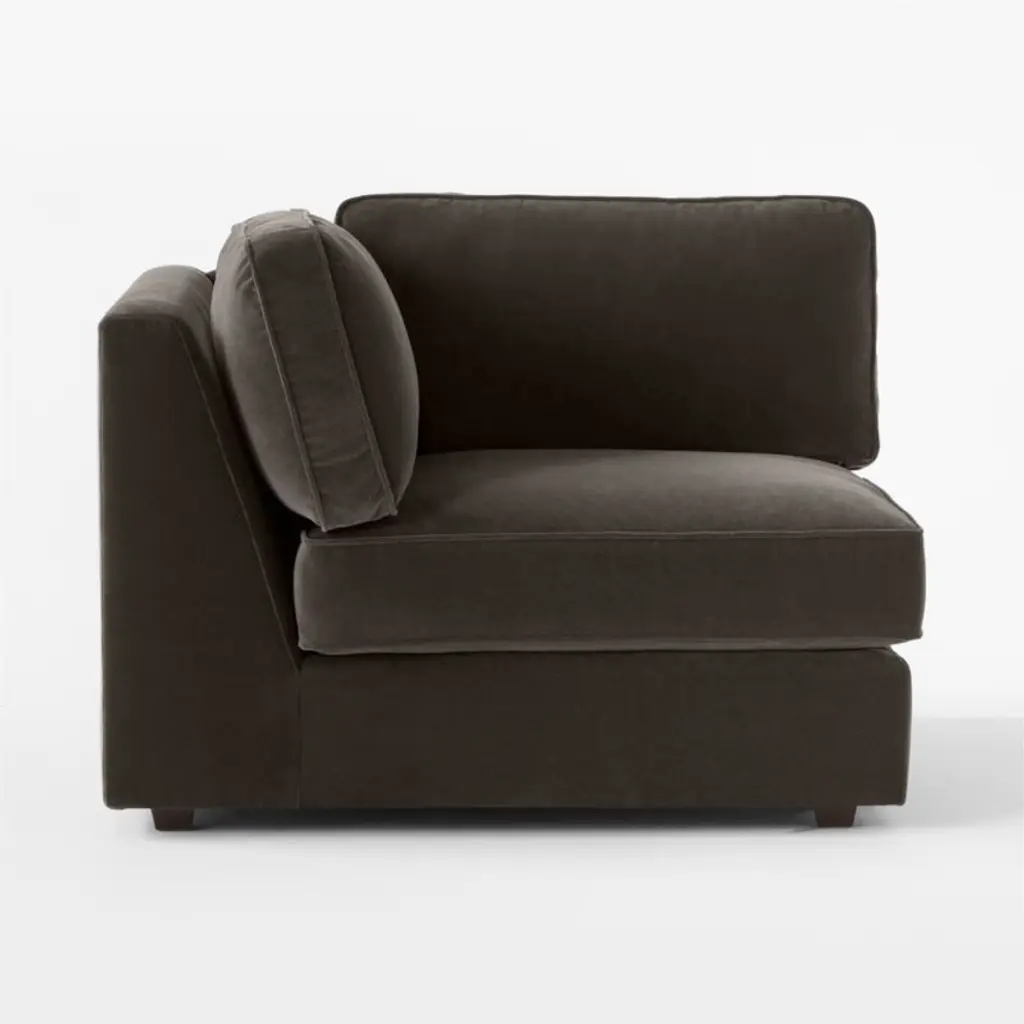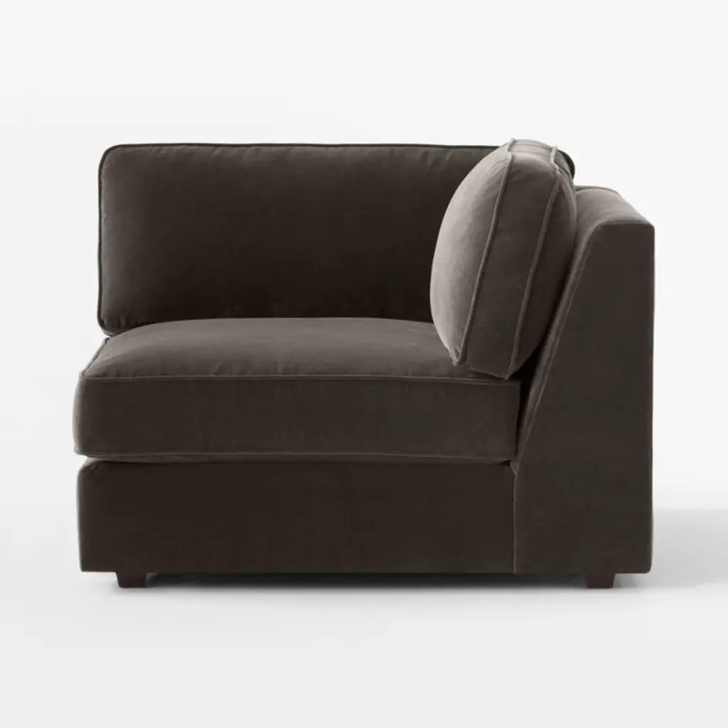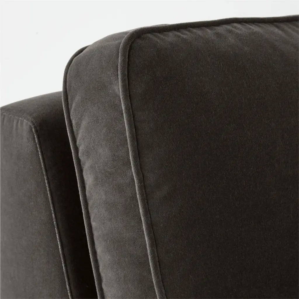 The Malea sectional sofa is the perfect balance of refined, modern style and inviting comfort. Featuring a frame hand-assembled in America from kiln-dried, precision-cut wood with reinforced joinery for durability, this corner chair's slim track arms give the piece a sense of lightness. Charcoal grey performance velvet upholstery woven by a mill operating for six generations in South Carolina offers plush texture, while a welt trim along the frame and cushions keeps the look neat. Packed with an ultra-comfortable feather-and-down blend, the deep cushions are key to the chair's loungey appeal while giving it just the right amount of support. CB2 exclusive.