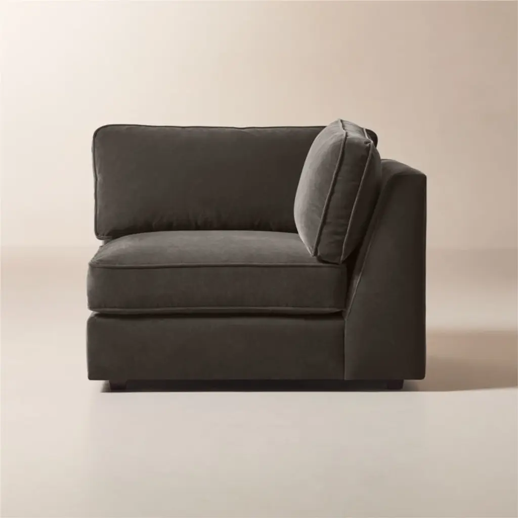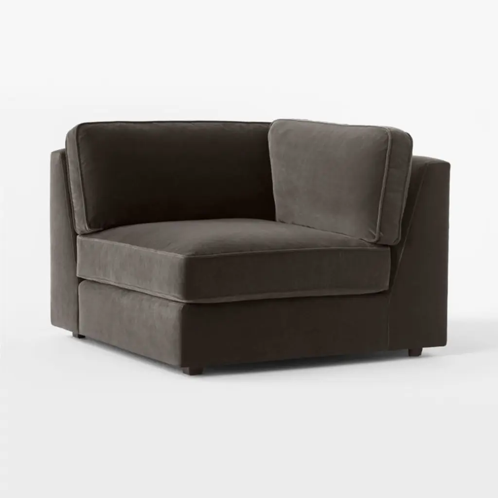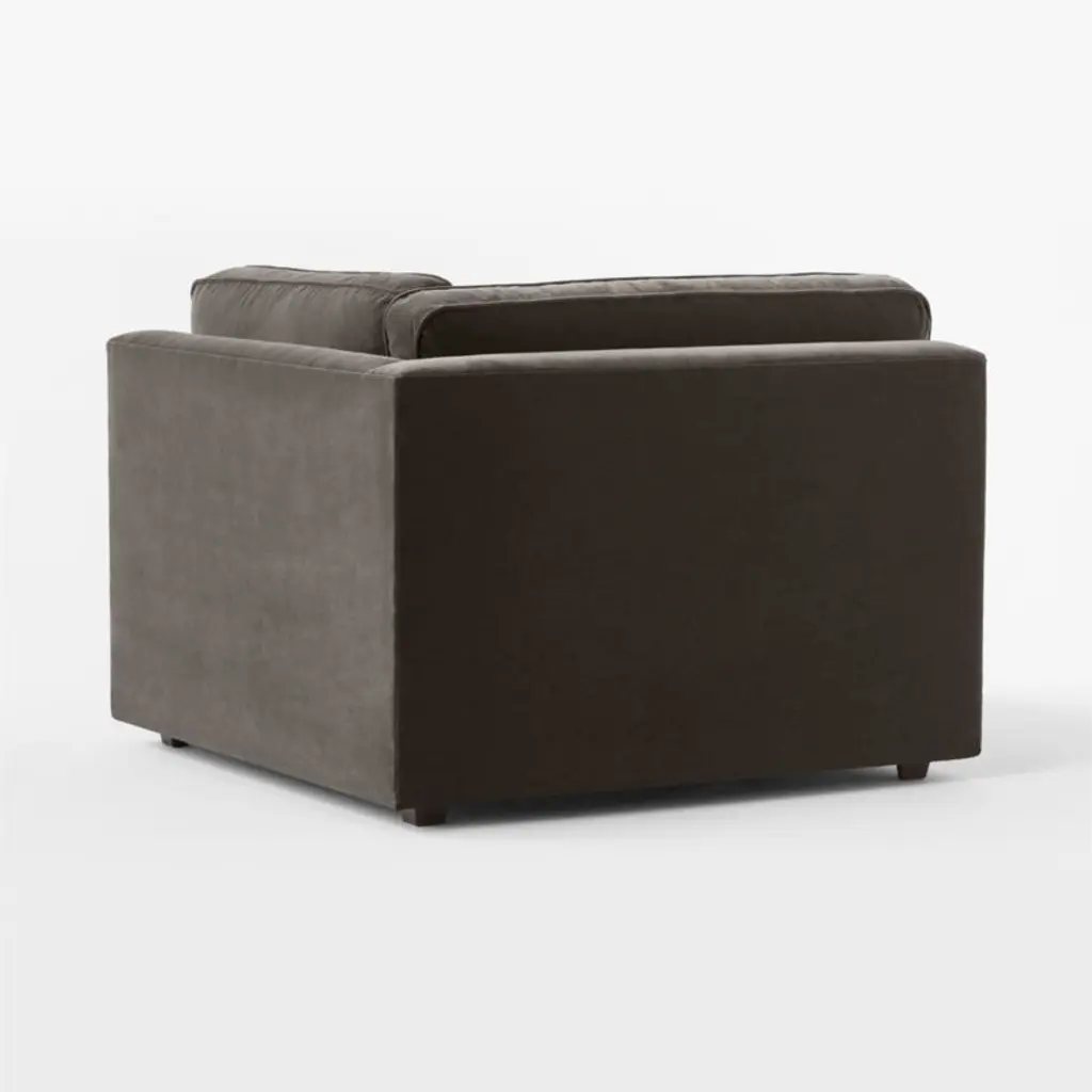 The Malea sectional sofa is the perfect balance of refined, modern style and inviting comfort. Featuring a frame hand-assembled in America from kiln-dried, precision-cut wood with reinforced joinery for durability, this corner chair's slim track arms give the piece a sense of lightness. Charcoal grey performance velvet upholstery woven by a mill operating for six generations in South Carolina offers plush texture, while a welt trim along the frame and cushions keeps the look neat. Packed with an ultra-comfortable feather-and-down blend, the deep cushions are key to the chair's loungey appeal while giving it just the right amount of support. CB2 exclusive.