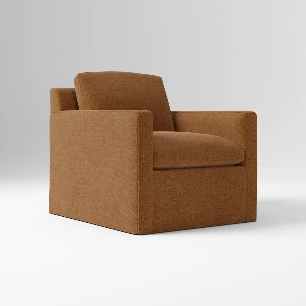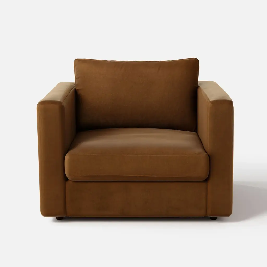Large in scale, modern chair commands attention with its rich cognac velvet upholstery. Woven by a mill operating for six generations in South Carolina, plush velvet features subtle light-catching striations in the yarn for a lustrous finish. Seat and back cushions are tailored with a crisp welt trim. CB2 exclusive.