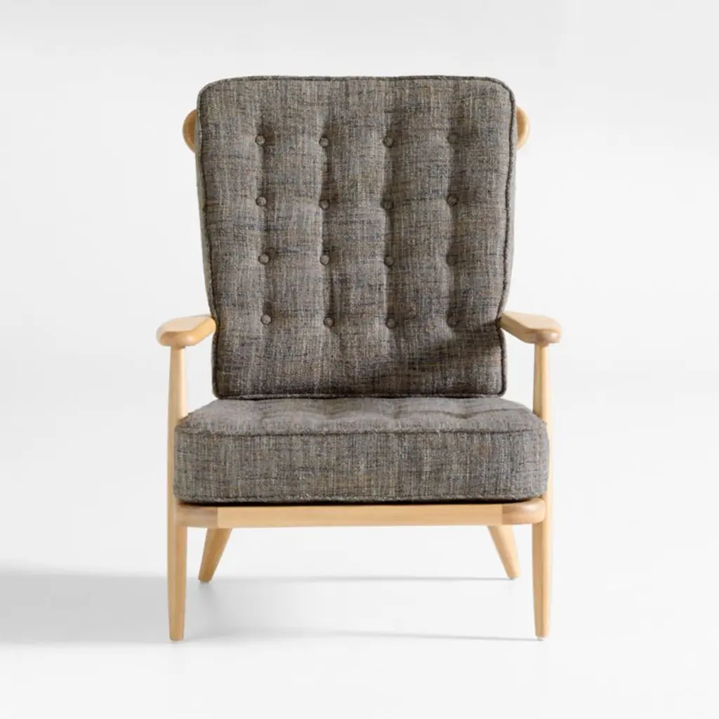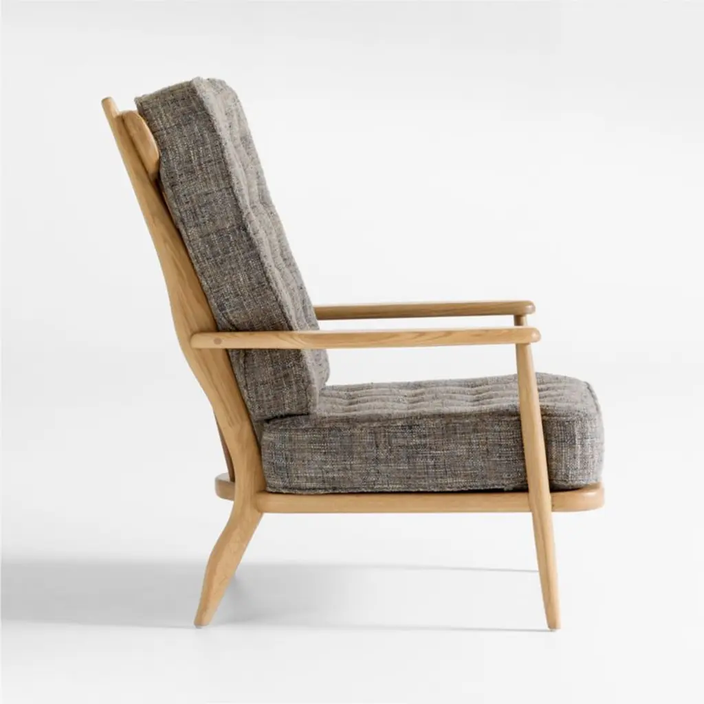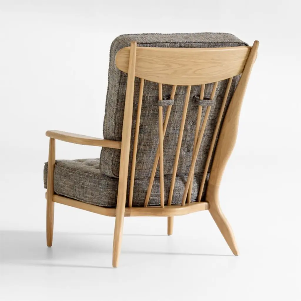 Captivating at every angle, Marais showcases expert workmanship and attention to detail. Melding 1950s French design and classic Windsor styling, the beautifully crafted accent chair features gracefully turned legs and carved armrests with end-grain details from the pass-through dowel construction. Overlapping spindles and sculpted back legs create an intriguing rear view. Tufted seat and back cushions covered in a texture-rich, tweedy weave offer luxurious comfort. Providing additional charm, the button tab detail on the back keeps the cushion securely in place.