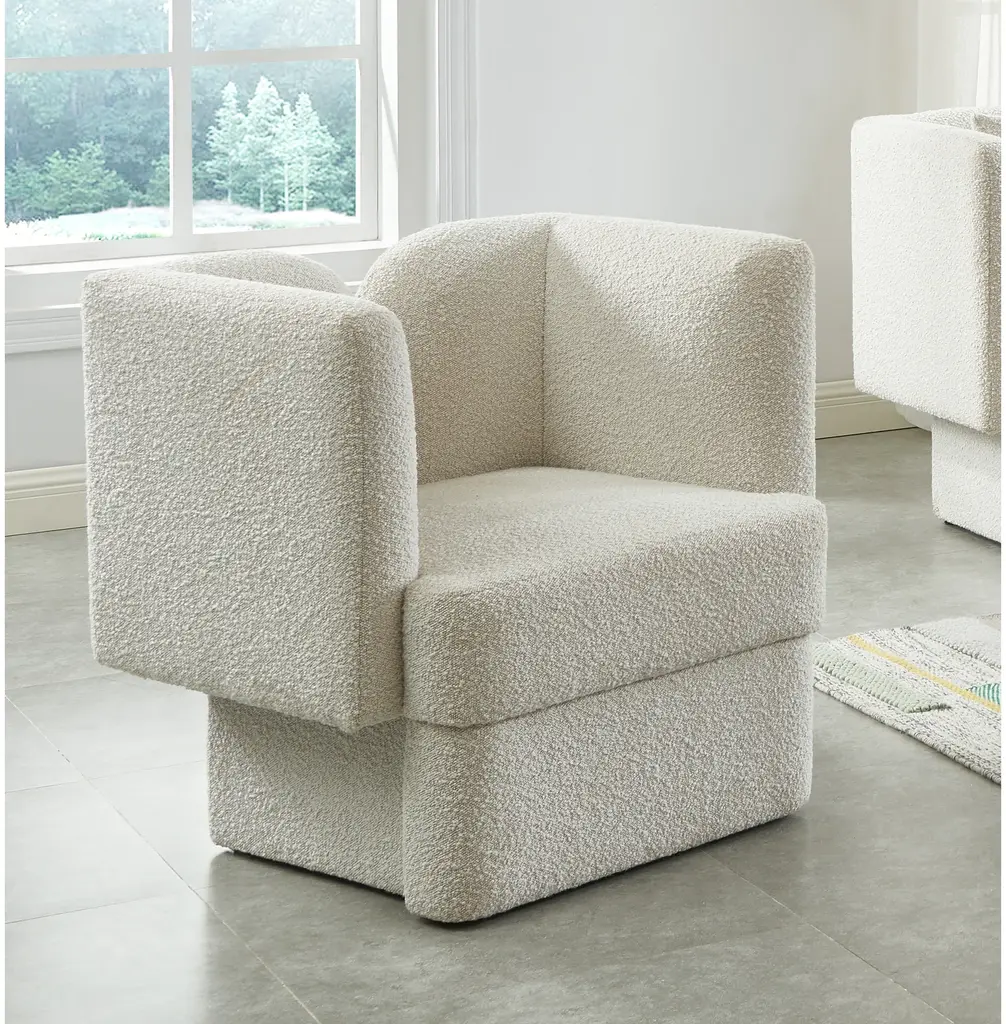 Bring artsy fun to your room with this Marcel cream boucle fabric chair. This eye-grabbing chair is part art, part functional seating item for your living room, bedroom, and beyond. The rich cream boucle fabric is soft and yielding against the skin, keeping you comfortable while you unwind and relax. The contemporary inspired design is bound to garner attention no matter where you choose to use it.Overall Product Dimensions: 32" W x 28" D x 31.5" HRich Cream Boucle FabricCurved BackContemporary DesignSeat Dimensions:Seat Width: 21.5"Seat Height: 18.5"Seat Depth: 22.44"Arm Height: 13.2"Back Height: 13"