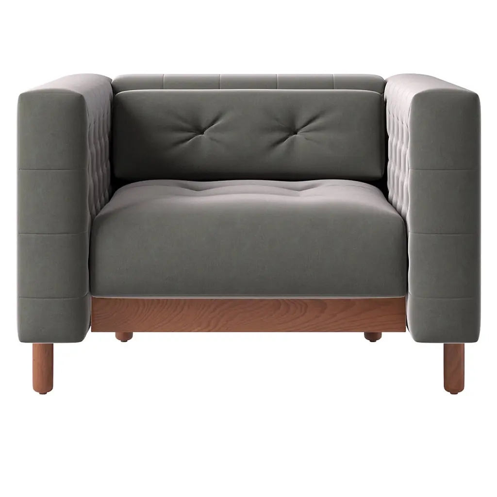 This sleek, low accent chair was originally created by iconic Italian designer Gianfranco Frattini for the fashionable Restaurant St. Andrews in the heart of old Milan. Now, a modern classic returns with the same spirit of the original design. Period-authentic details include hand-sewn button tufts on the interior sides and cushions, along with the inset walnut legs that are characteristic of the designer's signature style. CB2 exclusive.